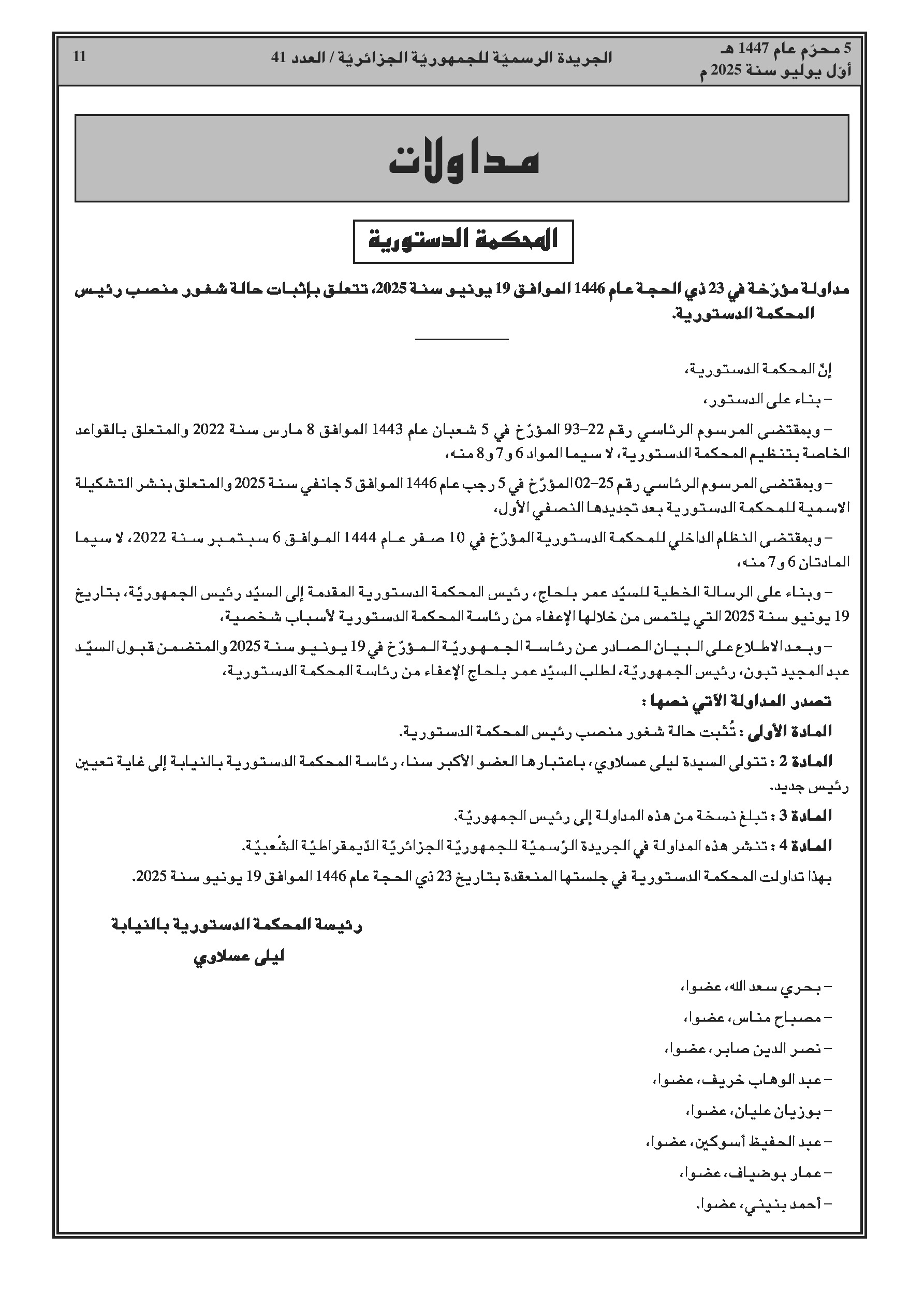 أعلنت المحكمة رسميا شغور منصب الرئيس إثر استقالة السيد عمر بلحاج. وبصفتها العضو الأكبر سنا، تتولى السيدة ليلى عسلاوي رئاسة المحكمة بالنيابة إلى غاية تعيين رئيس جديد.
