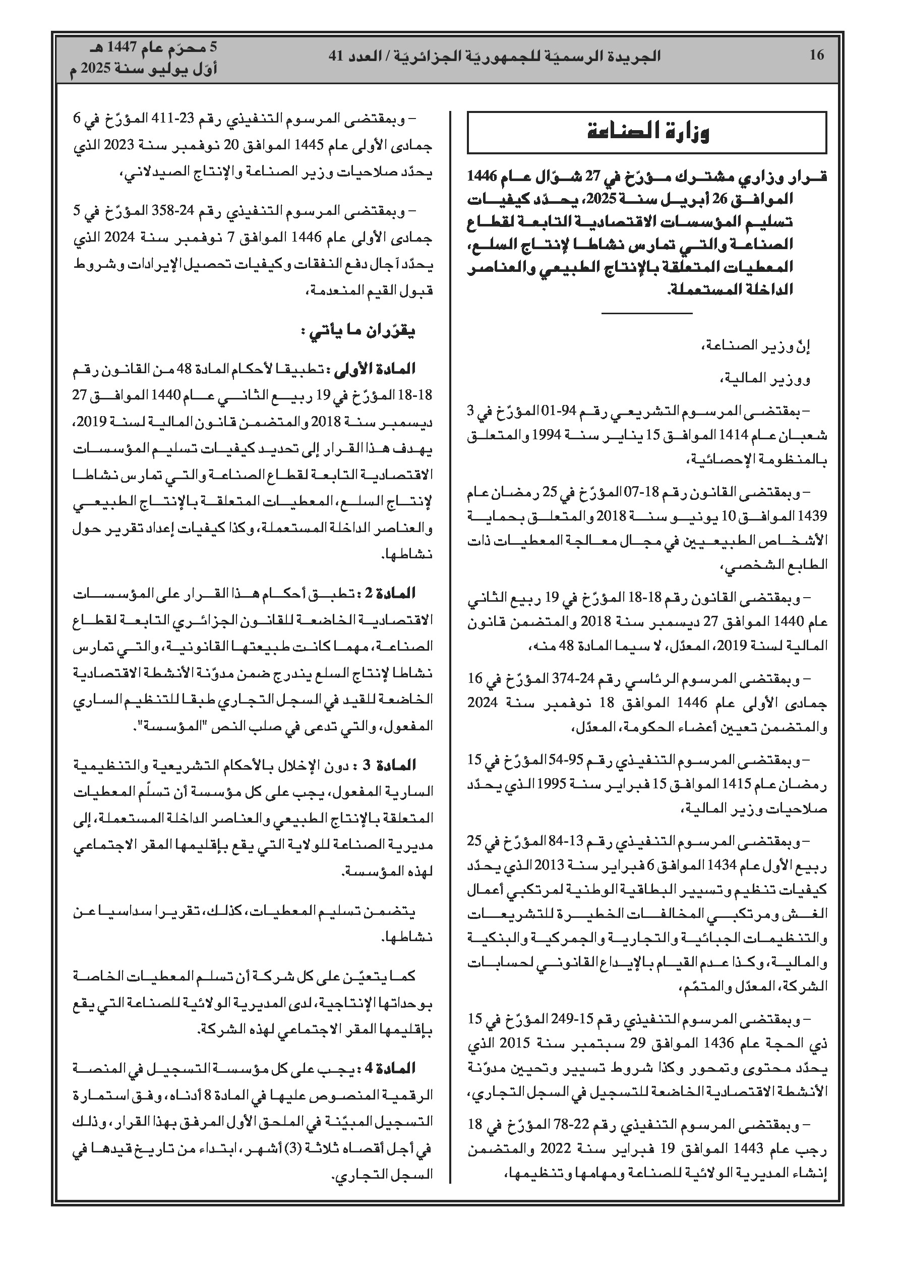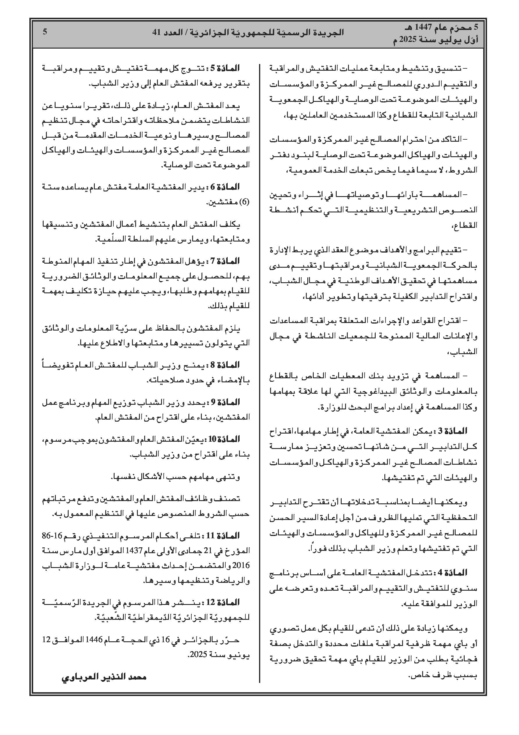 يحدد مرسوم تنفيذي تنظيم ومهام المفتشية العامة لوزارة الشباب. بالتزامن مع ذلك، يقوم قرار وزاري مشترك بتحديث تعداد وتصنيف أعوان الصيانة والخدمة المتعاقدين في وزارة العدل.