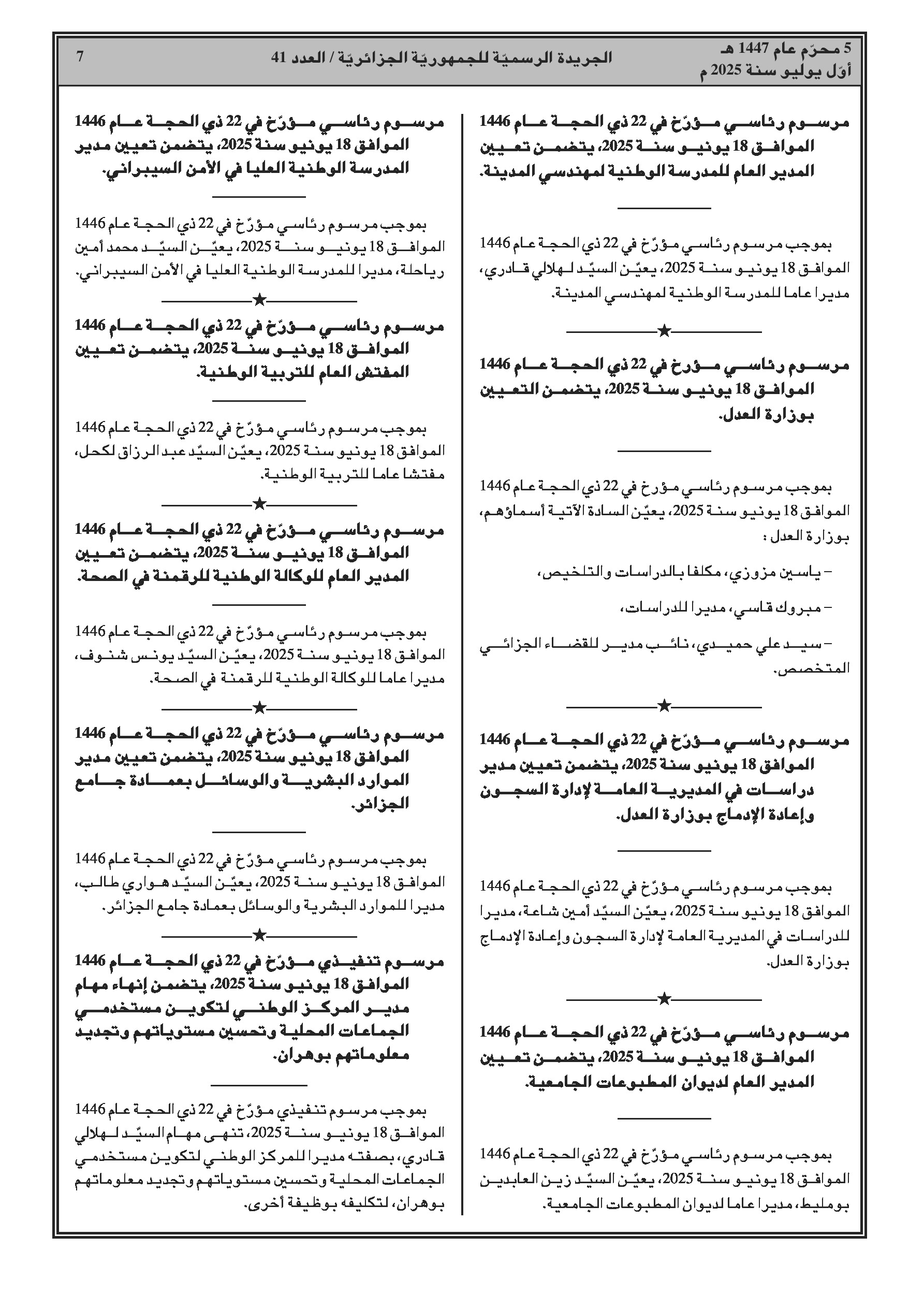 سلسلة من المراسيم تضفي الطابع الرسمي على تغييرات في المناصب القيادية للمدراء والمفتشين وغيرهم من كبار الموظفين في وزارات الداخلية والعدل والتربية والصحة والحماية المدنية، وكذلك في الوكالات الوطنية والجامعات.