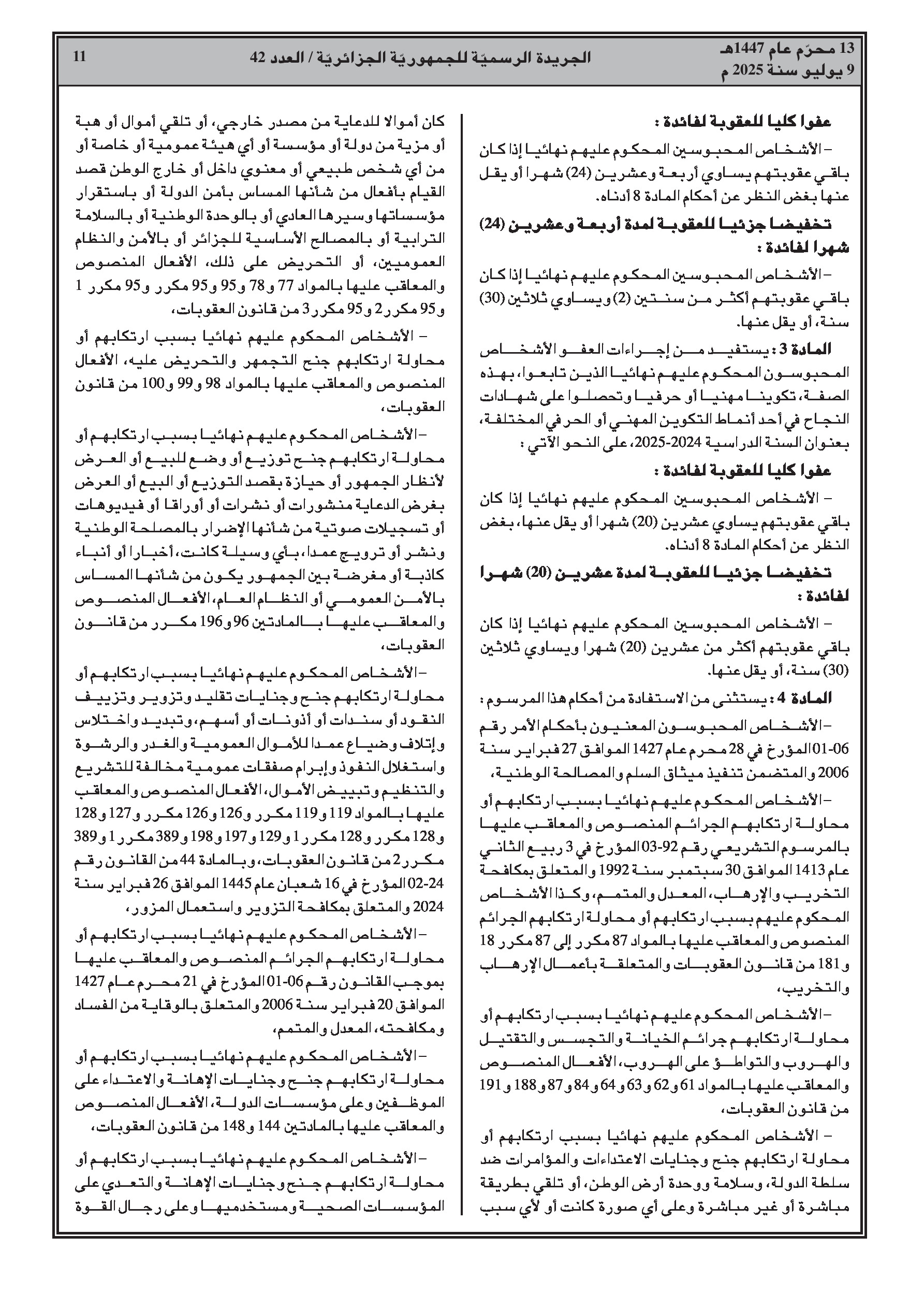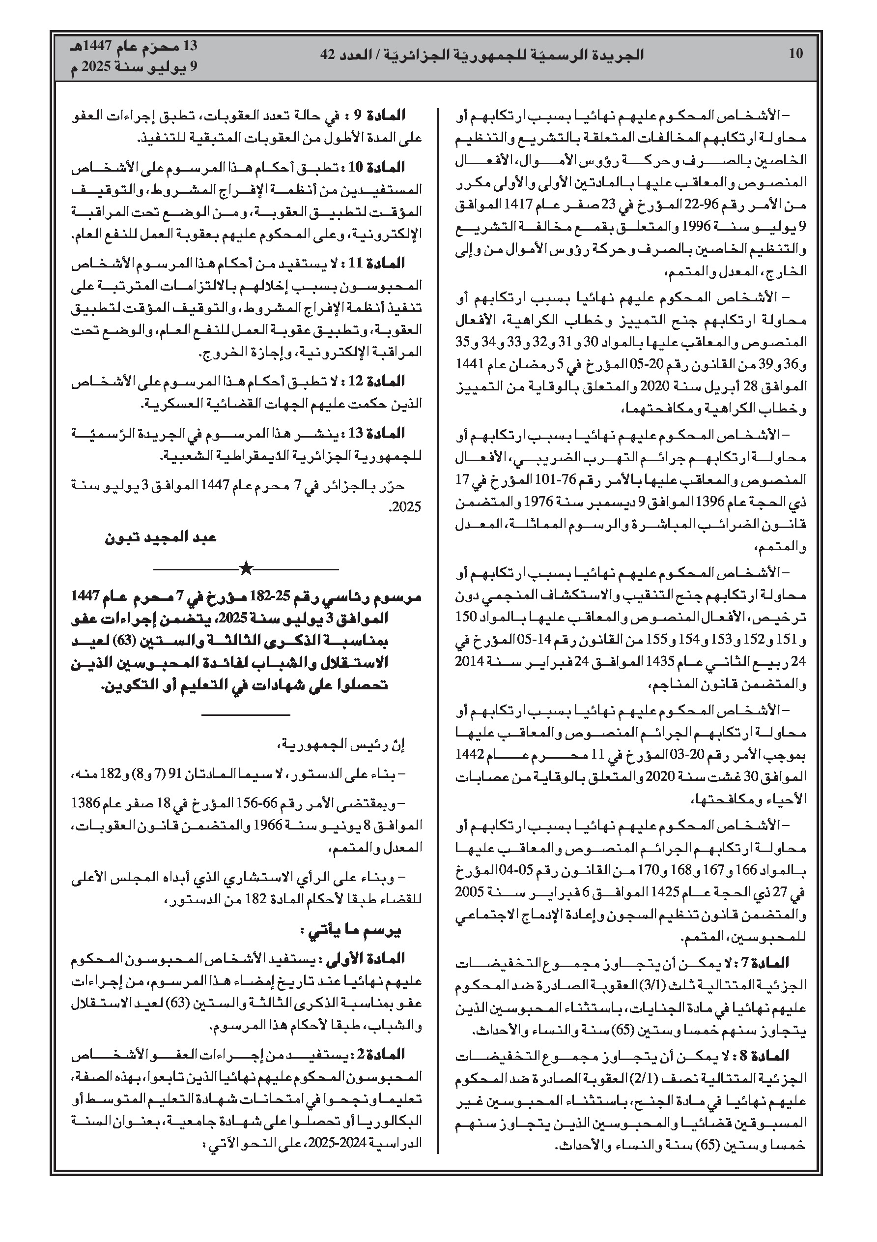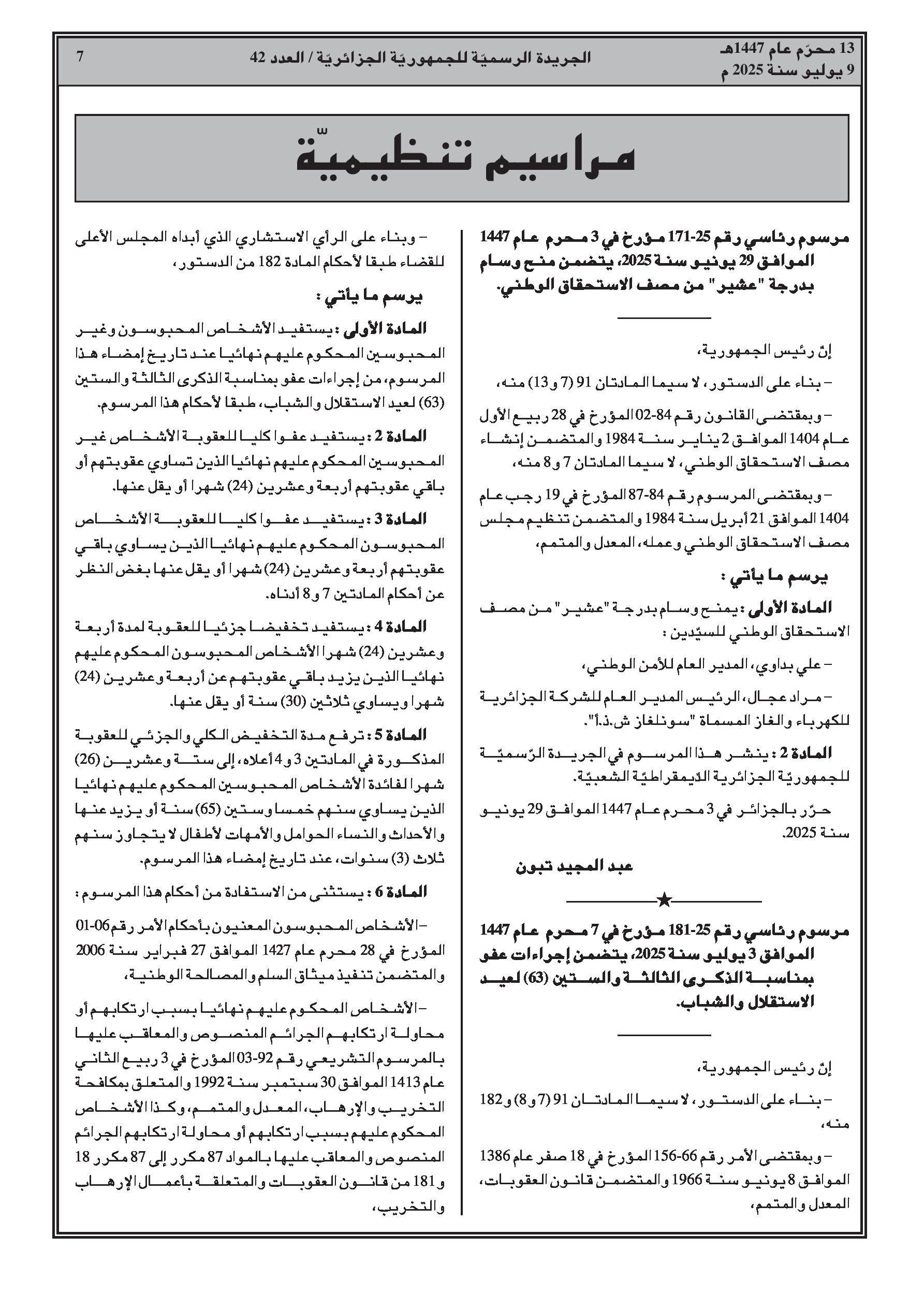 - إجراءات عفو رئاسي بمناسبة الذكرى 63 لعيد الاستقلال والشباب، تشمل تخفيضًا كليًا أو جزئيًا للعقوبات.