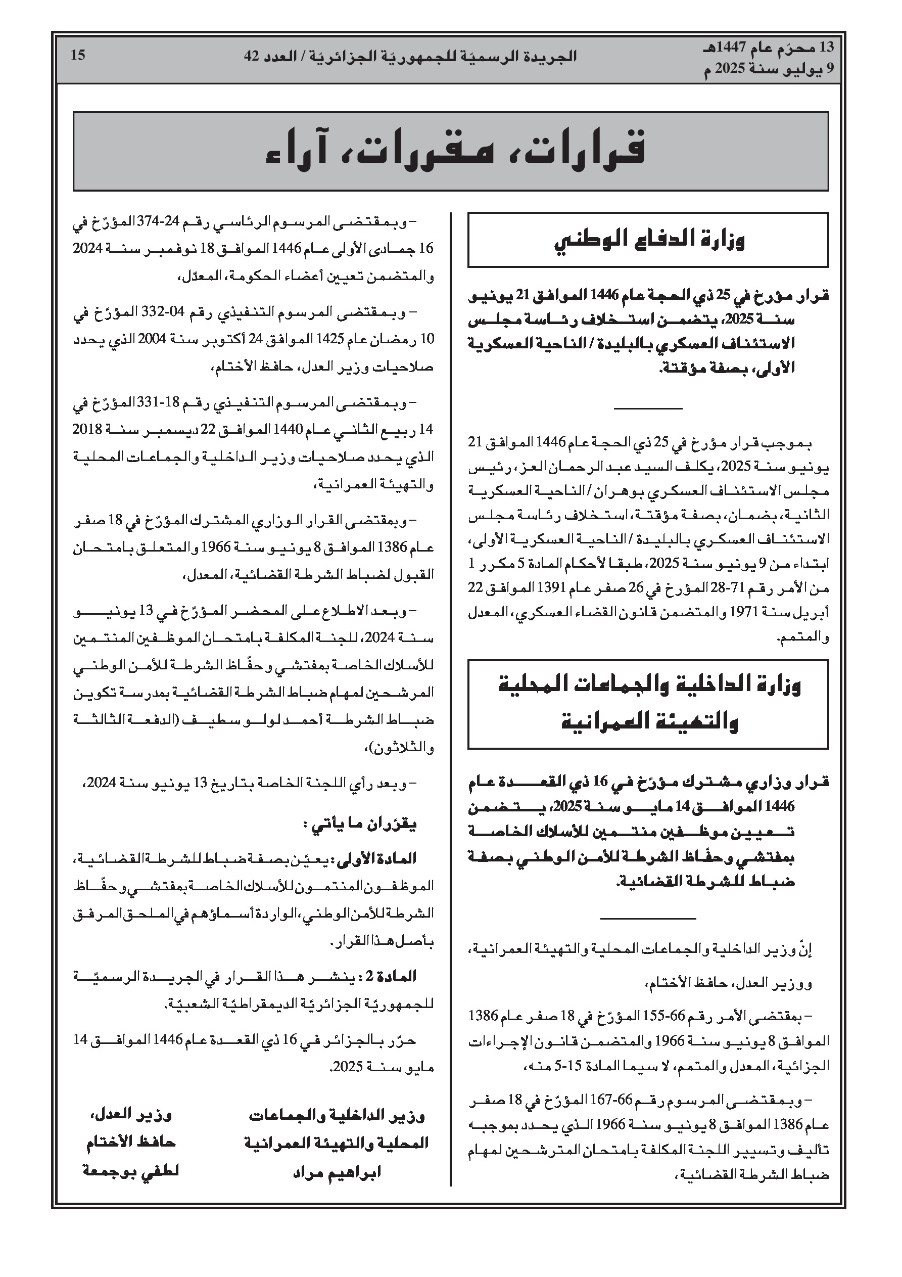 - وزارة الداخلية: تسمية موظفي أمن وطني بصفة ضباط شرطة قضائية.