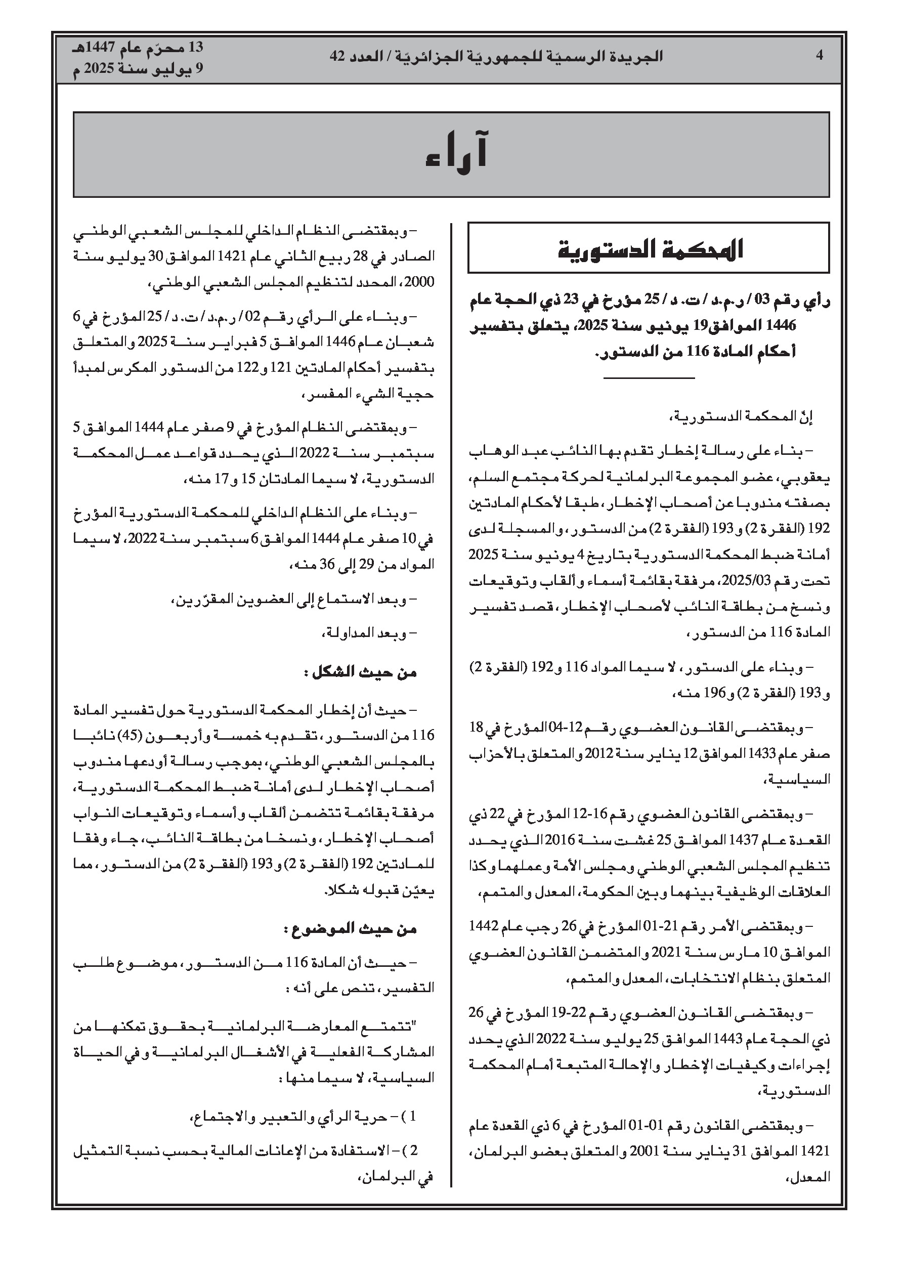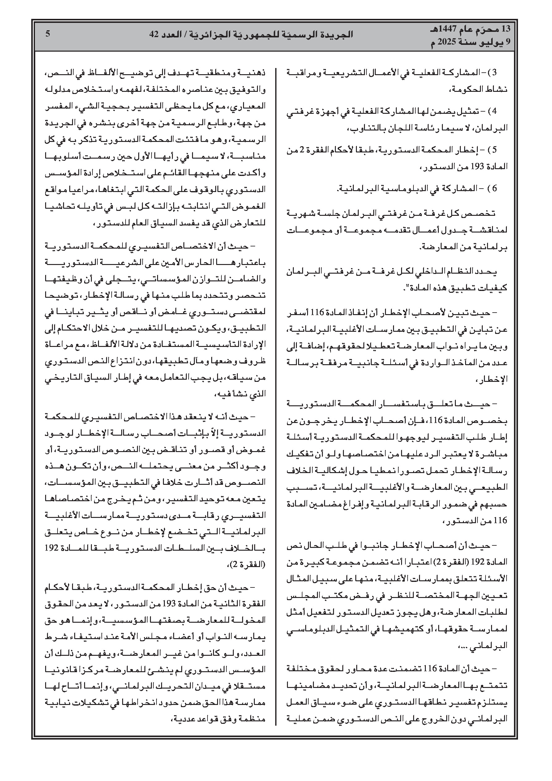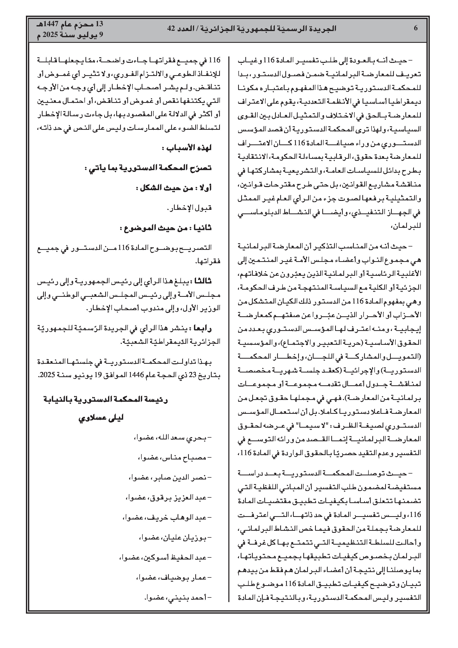 المحكمة تعلن وضوح المادة 116 من الدستور، التي تمنح المعارضة حقوقًا كحرية الرأي والتعبير، والمساعدات المالية، والمشاركة الفعالة في العمل التشريعي ومراقبة عمل الحكومة، مع إحالة تفاصيل تطبيق هذه الحقوق إلى النظام الداخلي لكل غرفة برلمانية.