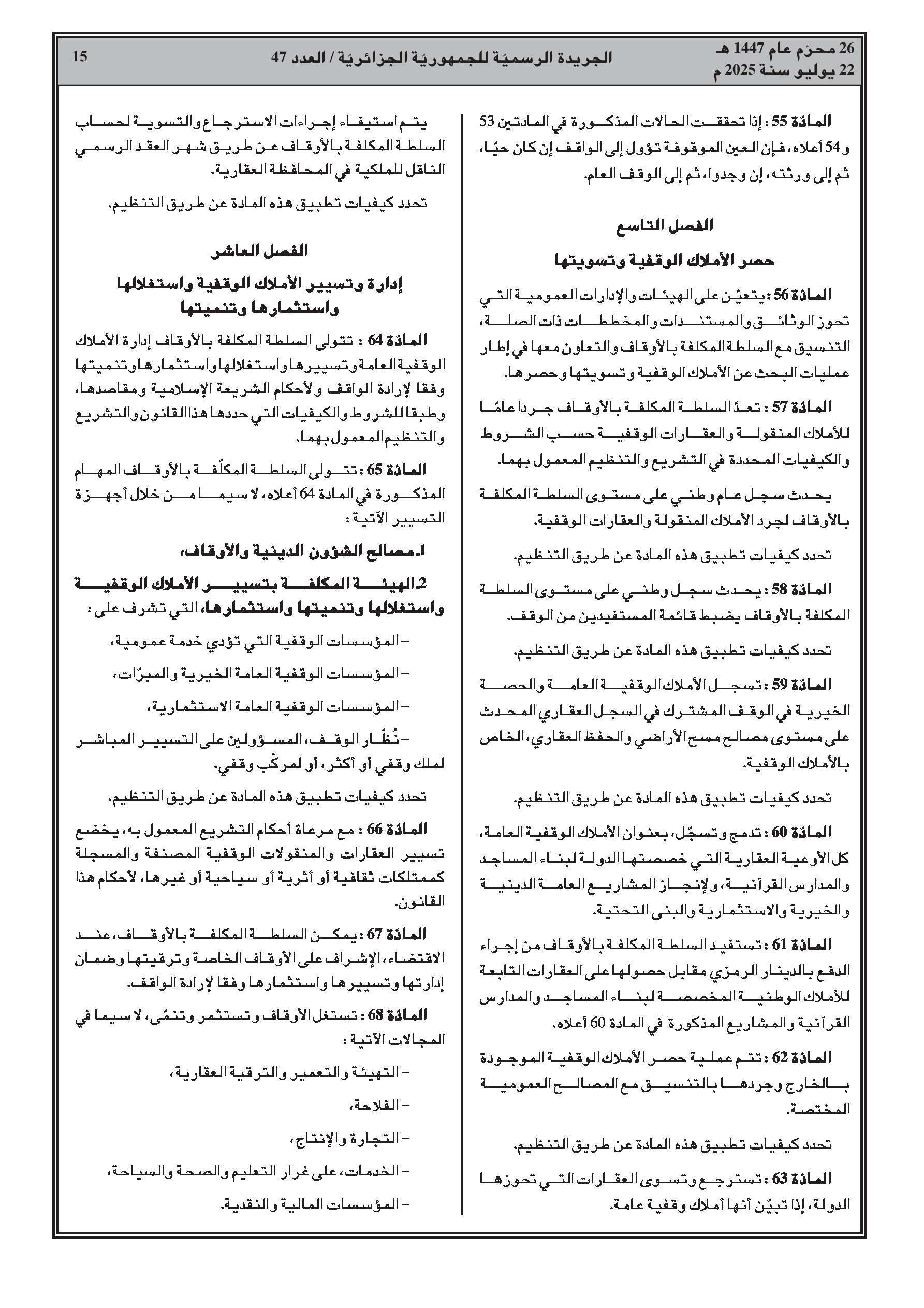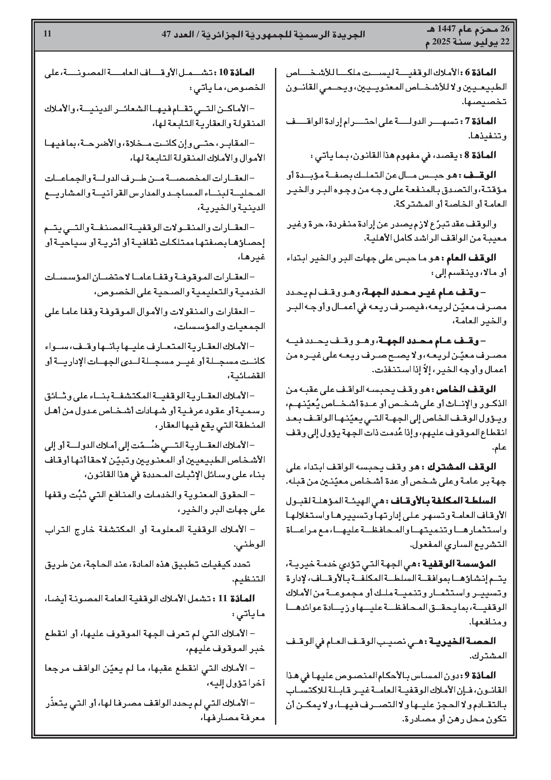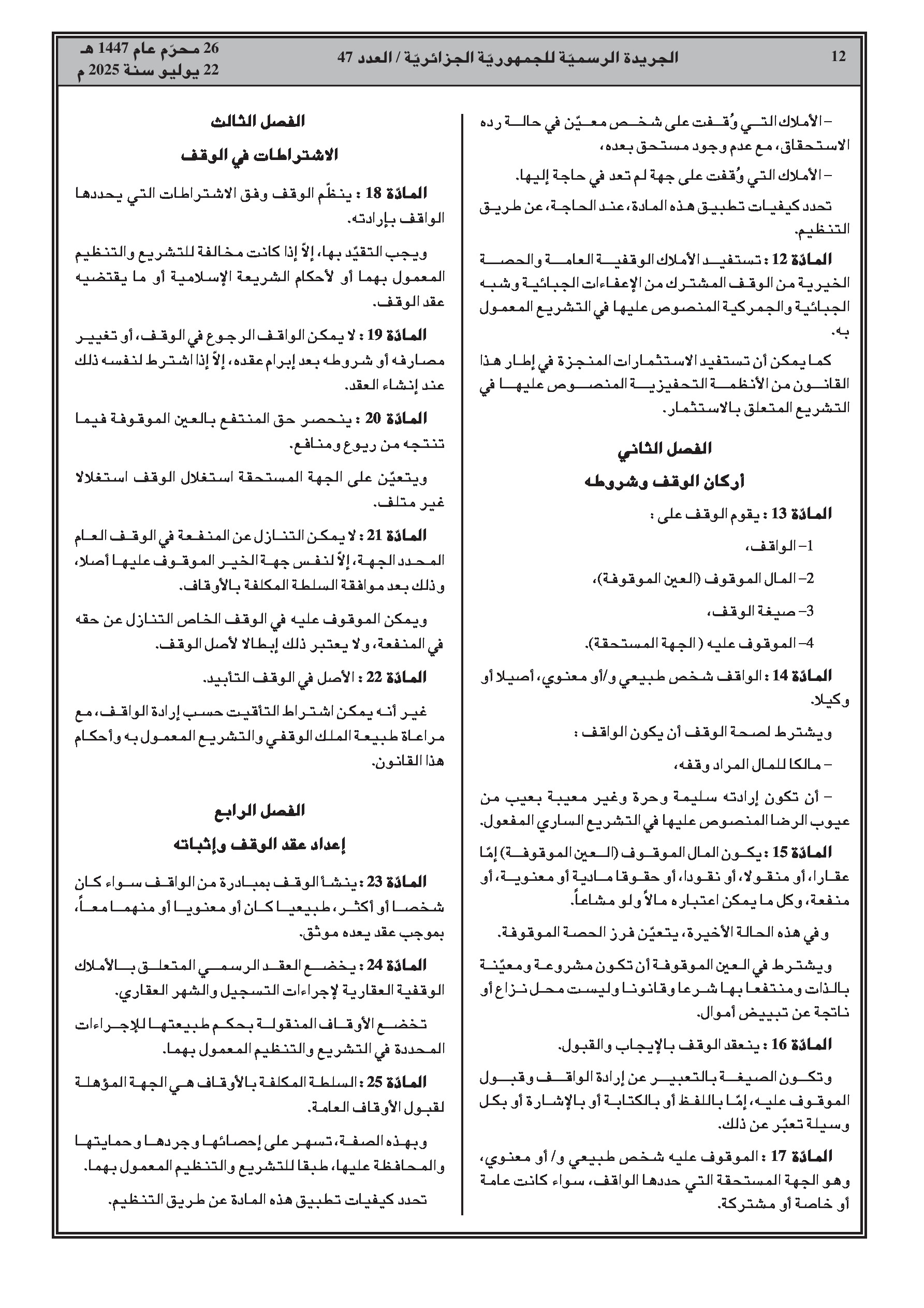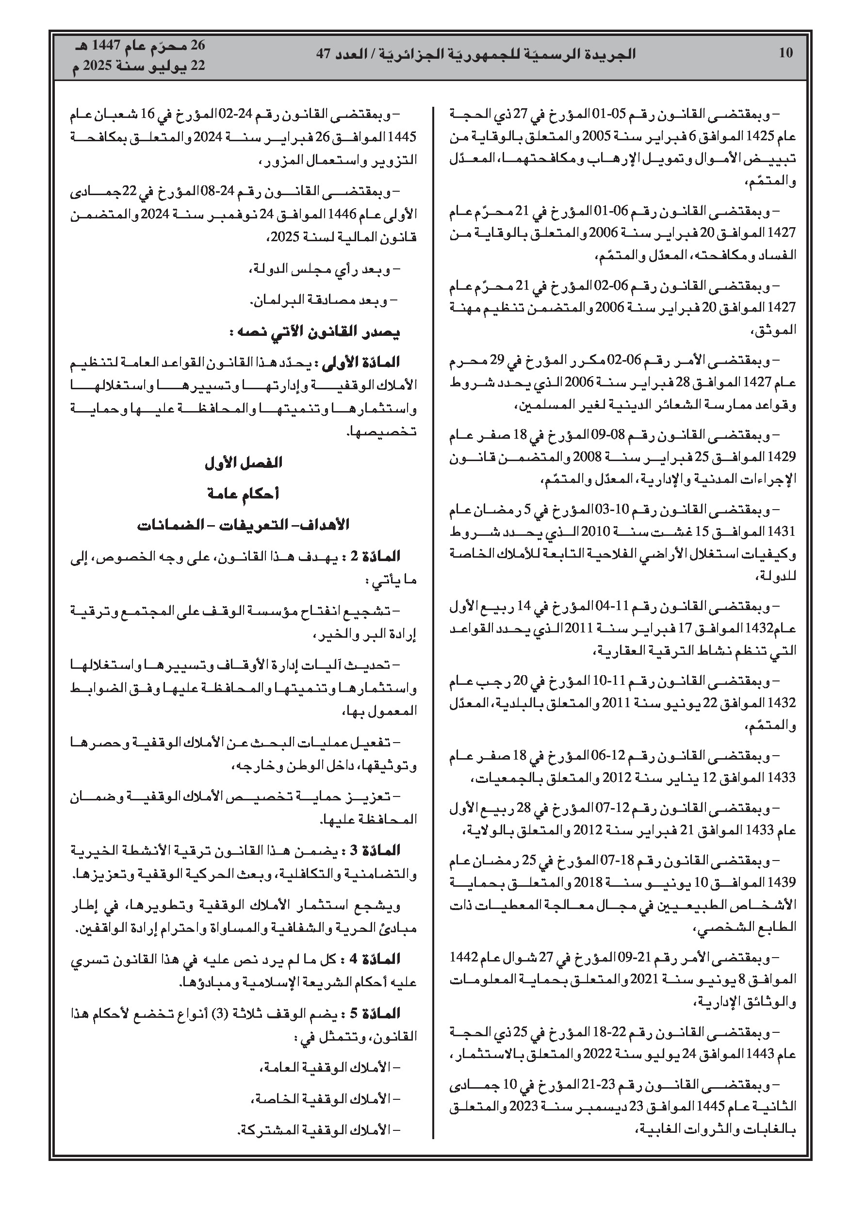 يلغي القانون السابق رقم 91-10. يهدف إلى عصرنة آليات تسيير واستثمار وتنمية الأوقاف مع حمايتها. يُعرّف أنواع الوقف (عام، خاص، مشترك) ويؤكد على عدم قابليتها للتصرف أو الحجز. يفتح المجال لاستثمار أموال الوقف عبر صيغ تمويل إسلامية متنوعة (إجارة، مرابحة، استصناع...). ينص على إنشاء سجل وطني عام للأوقاف.