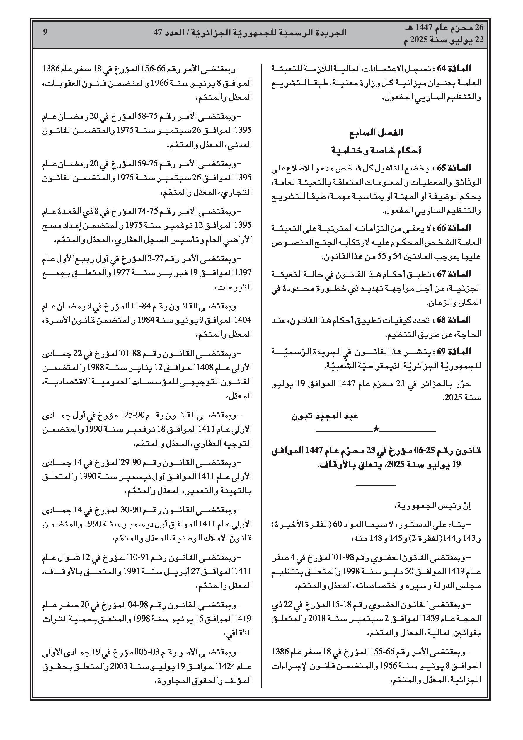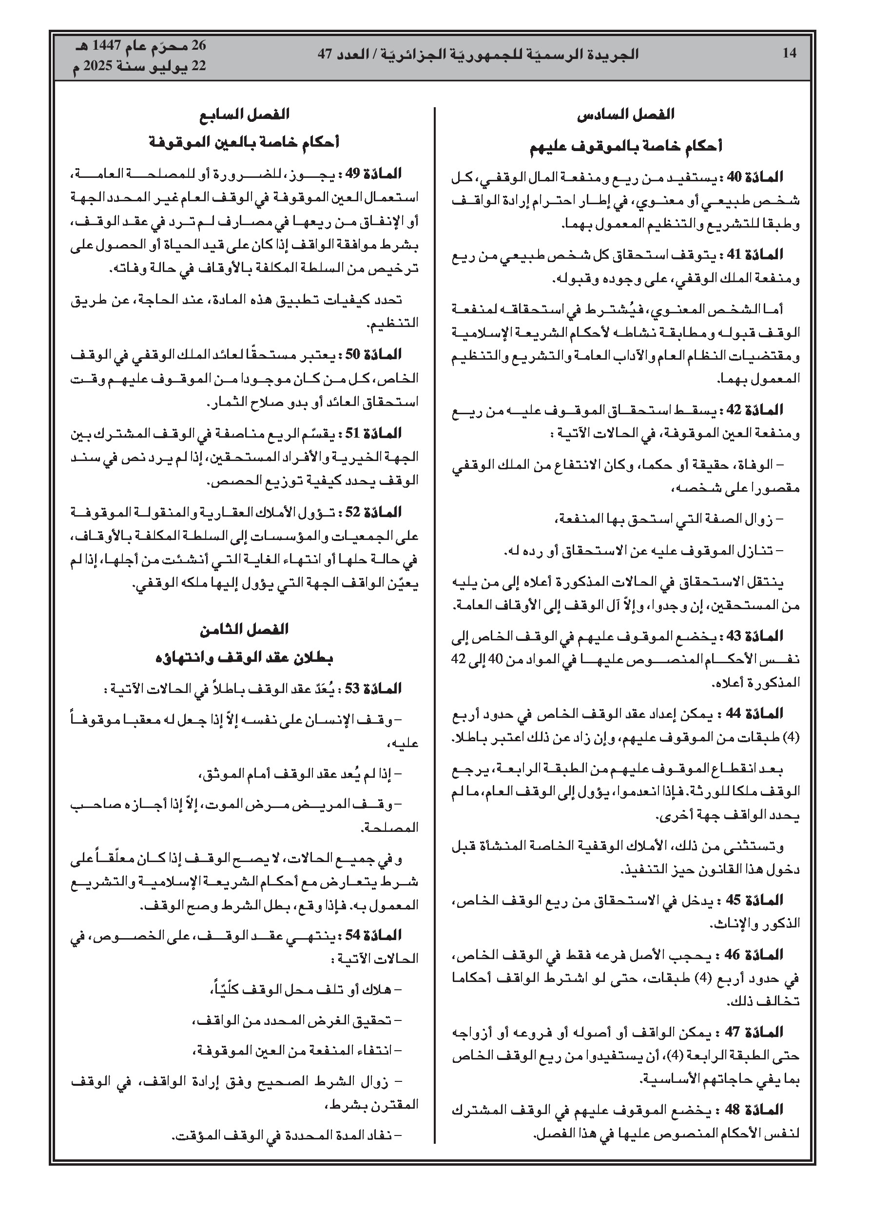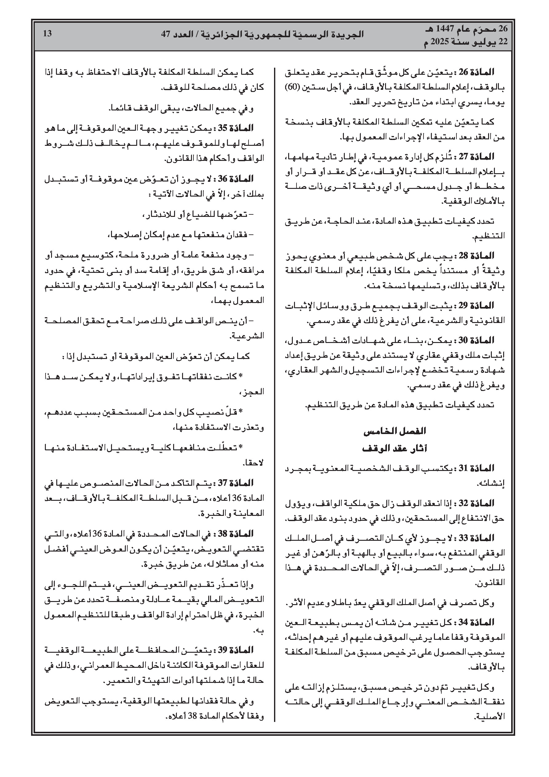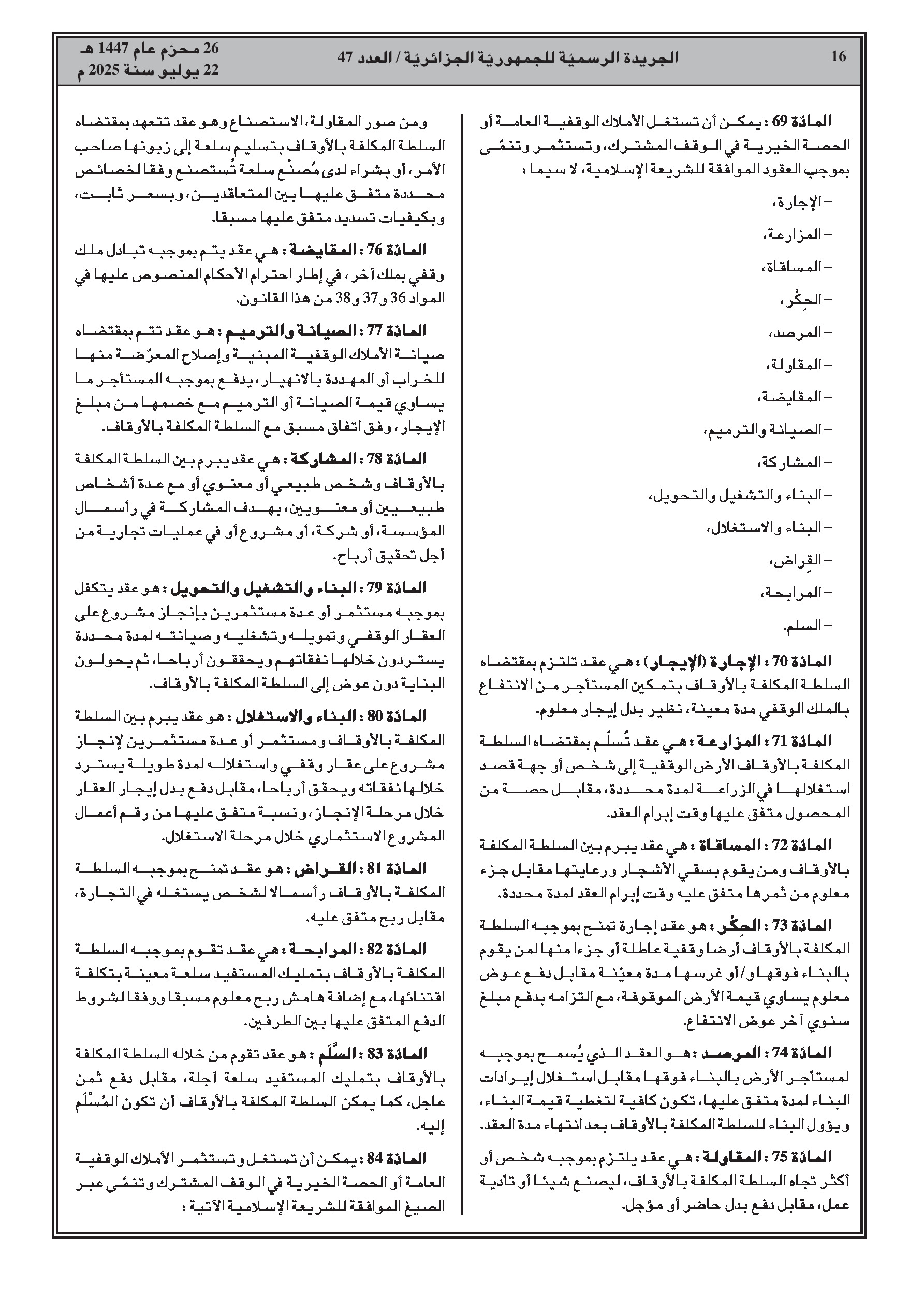 يلغي القانون السابق رقم 91-10. يهدف إلى عصرنة آليات تسيير واستثمار وتنمية الأوقاف مع حمايتها. يُعرّف أنواع الوقف (عام، خاص، مشترك) ويؤكد على عدم قابليتها للتصرف أو الحجز. يفتح المجال لاستثمار أموال الوقف عبر صيغ تمويل إسلامية متنوعة (إجارة، مرابحة، استصناع...). ينص على إنشاء سجل وطني عام للأوقاف.