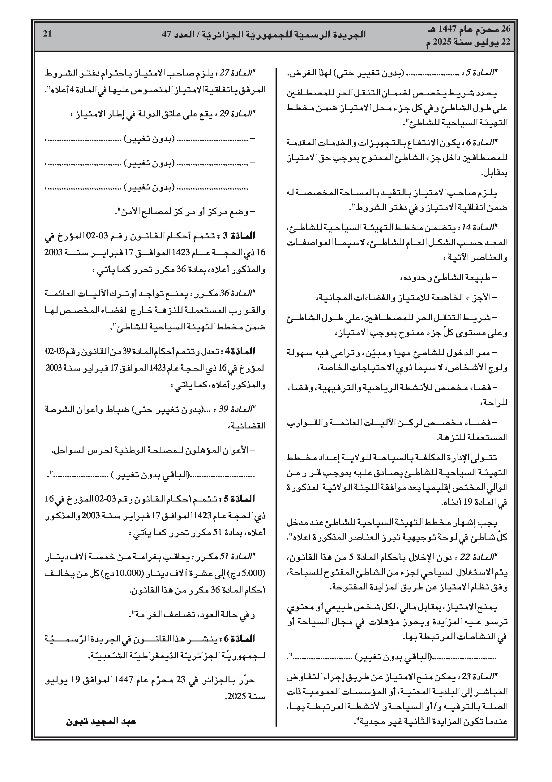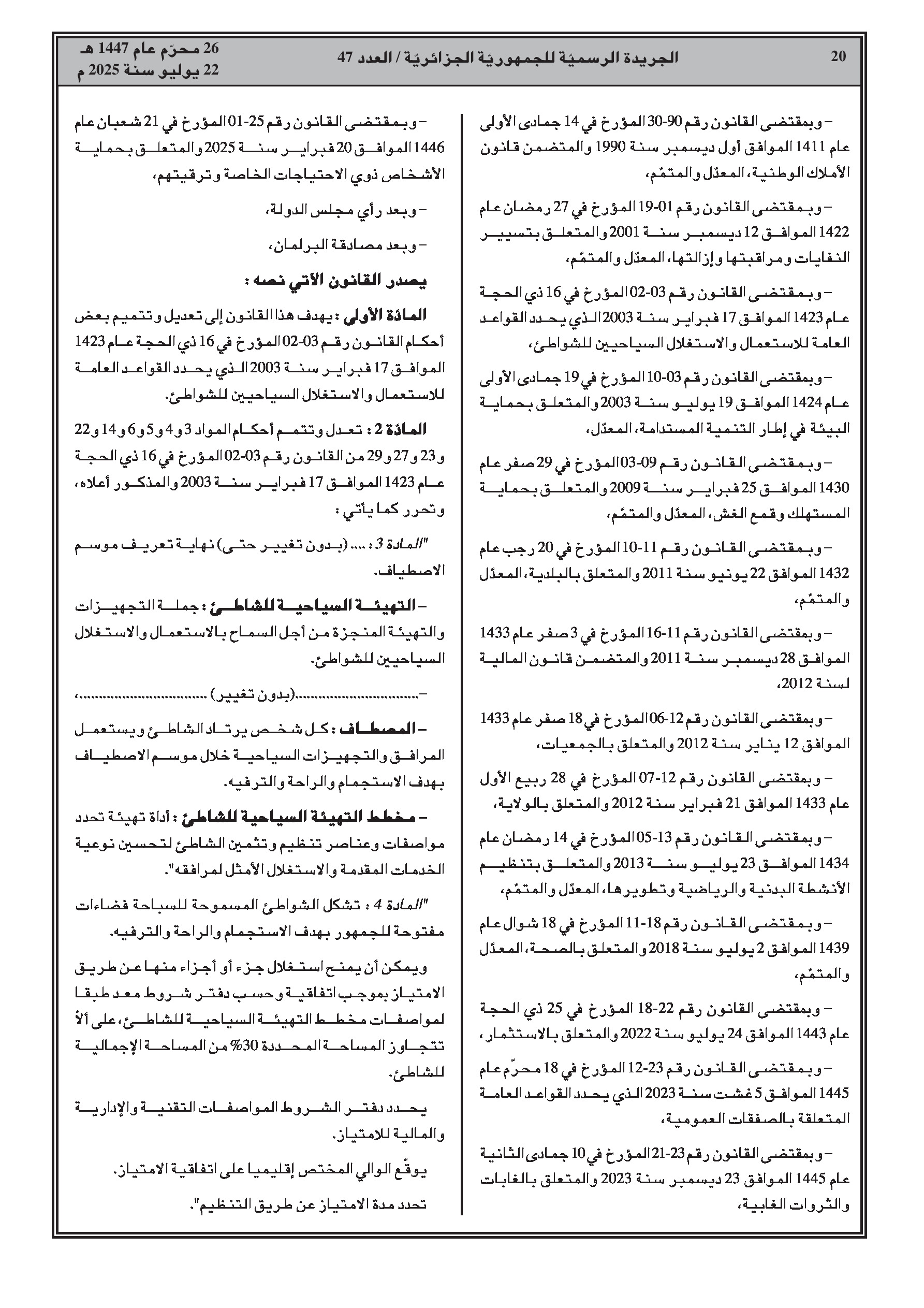 يعدل القانون رقم 03-02 الخاص باستغلال الشواطئ. نسبة المساحة المخصصة للاستغلال عبر عقود الامتياز لا تتجاوز 30% من المساحة الإجمالية للشاطئ. يتم منح الامتياز عن طريق المزايدة. يمنع وقوف أو إيداع العتاد البحري خارج الأماكن المخصصة لذلك.