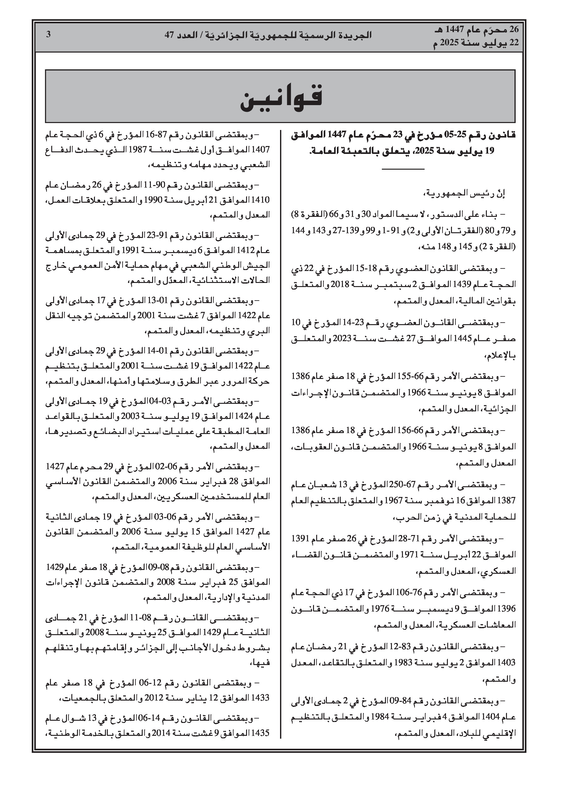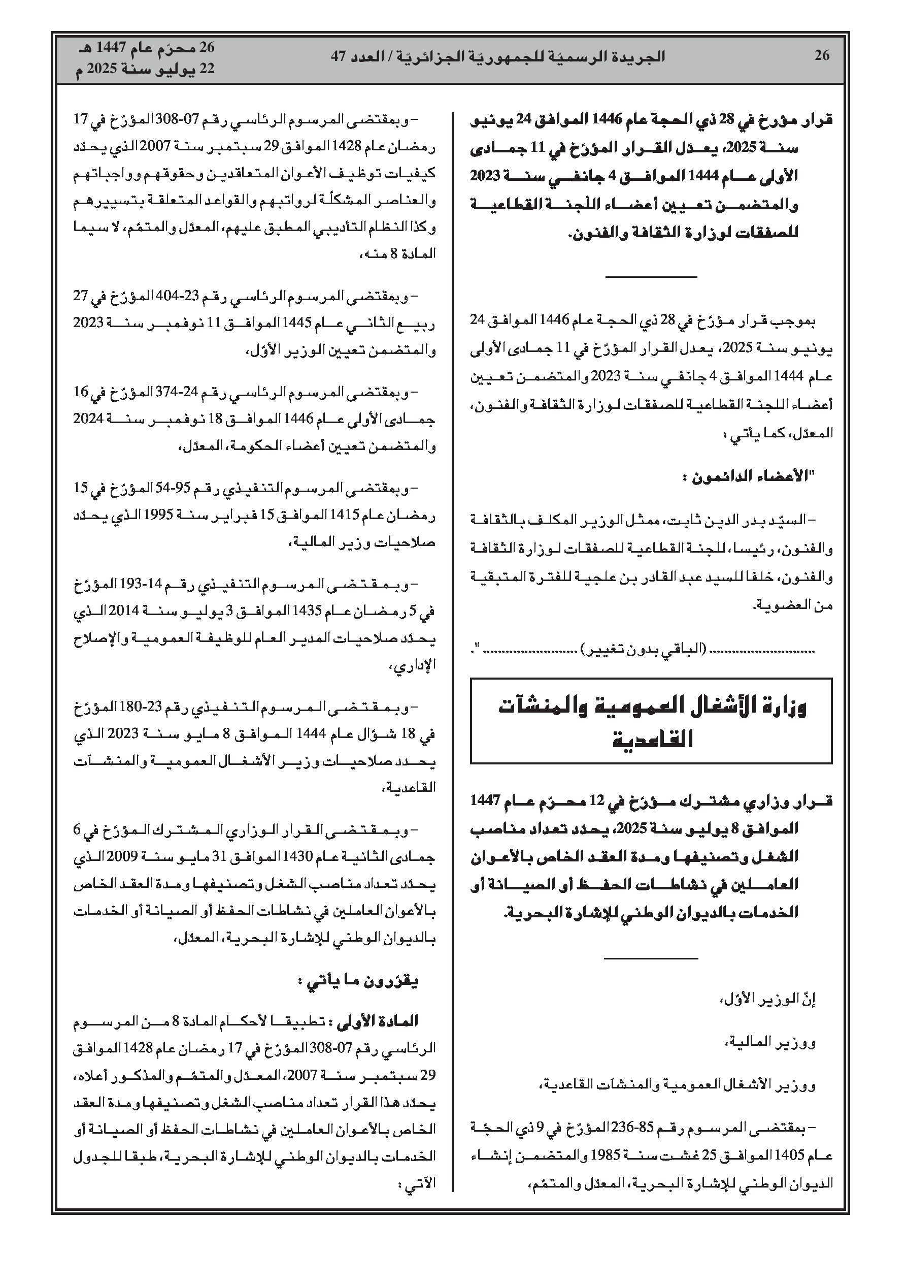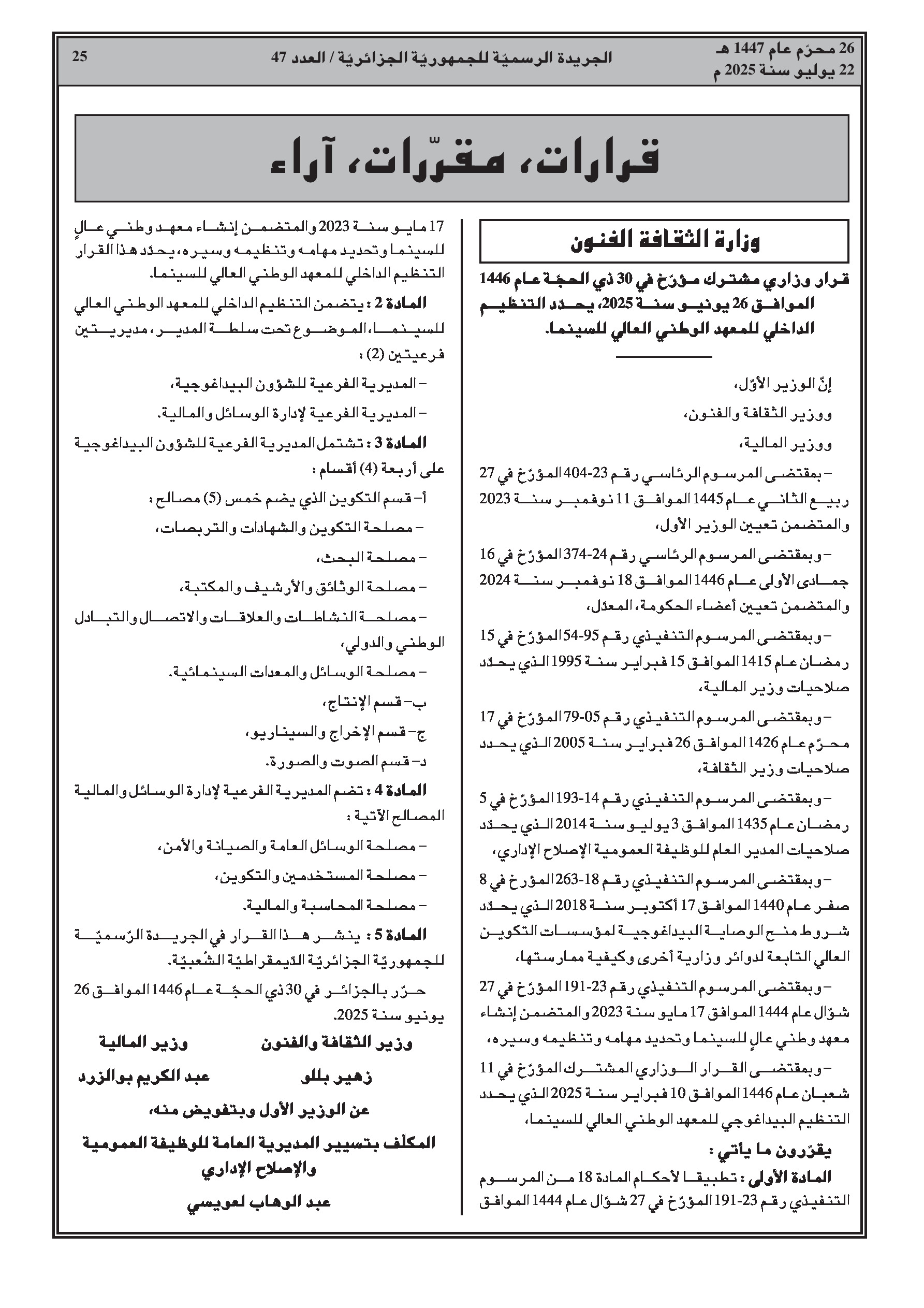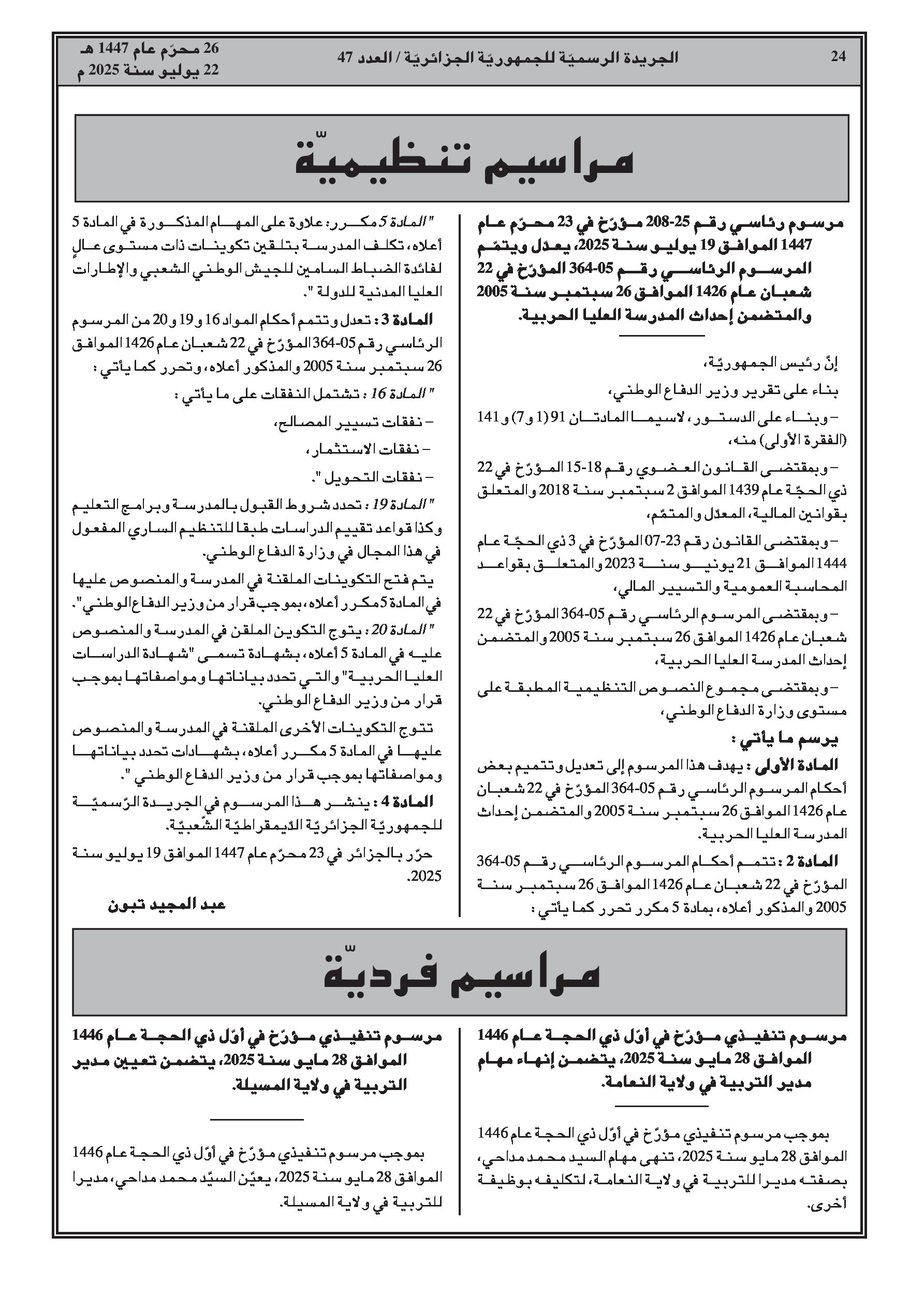 مرسوم رئاسي يوسع مهام المدرسة العليا للحرب لتشمل تكوين الكوادر المدنية، بالإضافة إلى قرارات تنظيمية تخص قطاعي الثقافة والأشغال العمومية.