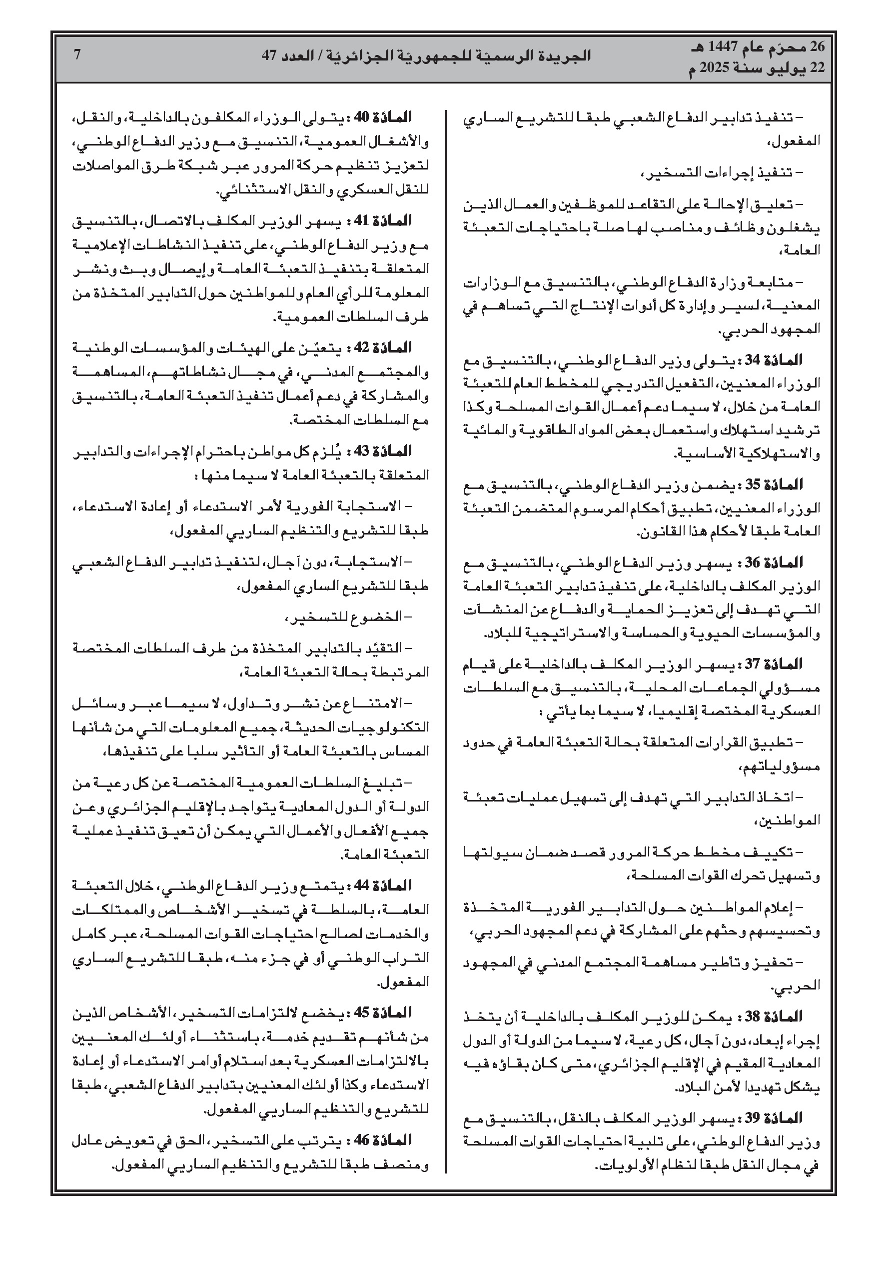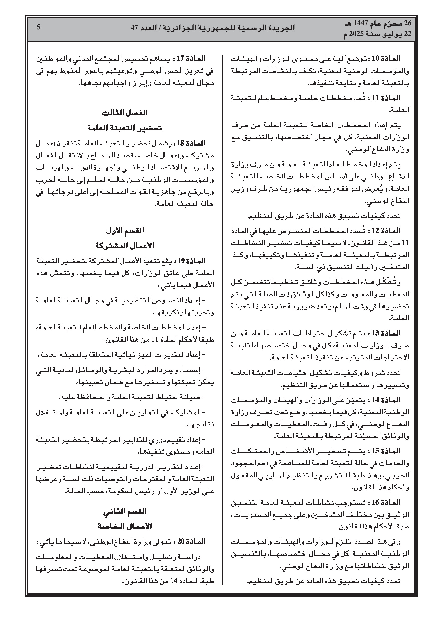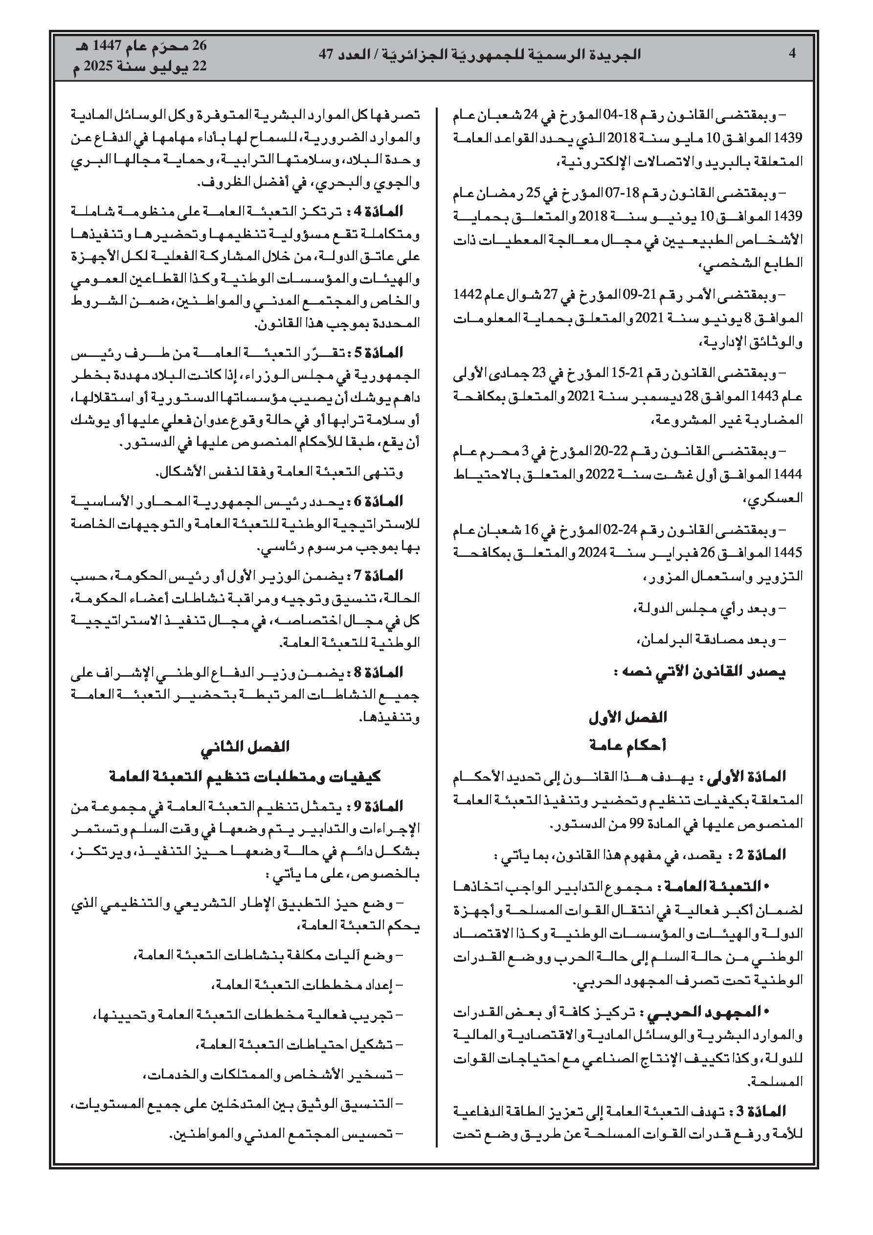 يحدد القانون إطار وحالات إعلان التعبئة العامة من قبل رئيس الجمهورية لمواجهة خطر داهم. يوضح التزامات المواطنين والهيئات والمؤسسات العامة والخاصة في المجهود الحربي. يحدد مهام مختلف الوزارات (الدفاع، الداخلية، الخارجية...) في التحضير والتنفيذ. ينص على عقوبات لمن يخالف أحكام القانون، مثل نشر معلومات تضر بالتعبئة أو التهرب من الاستدعاء.