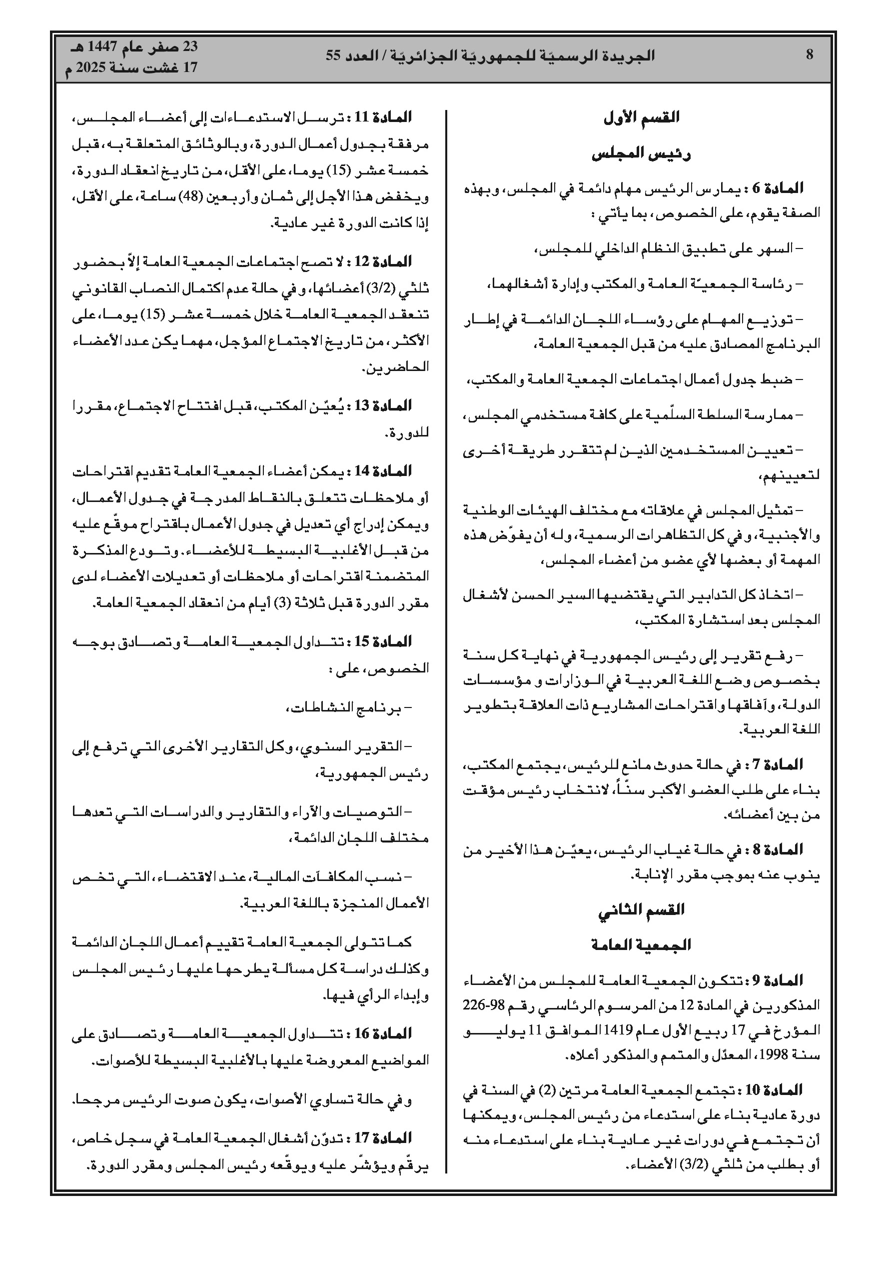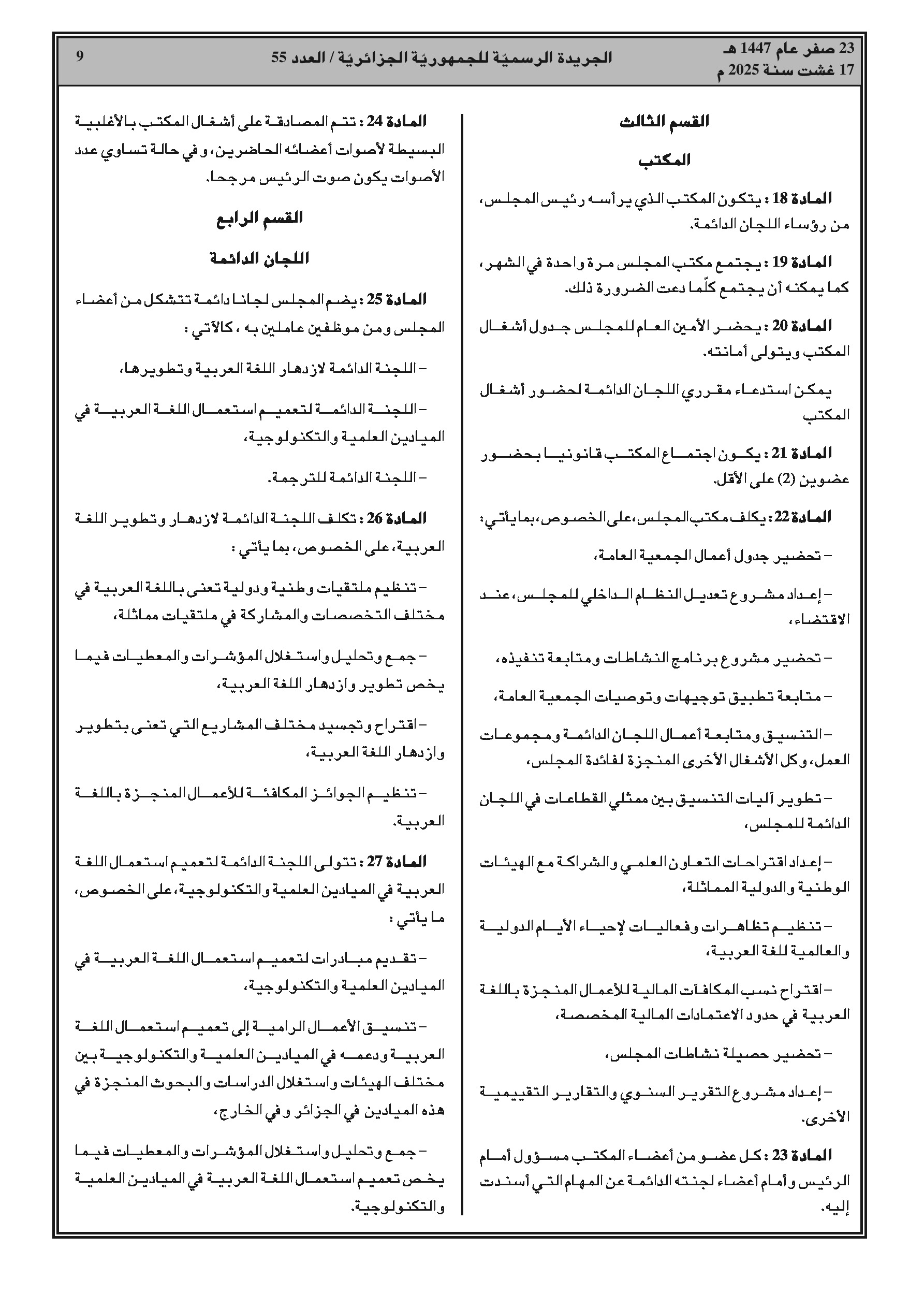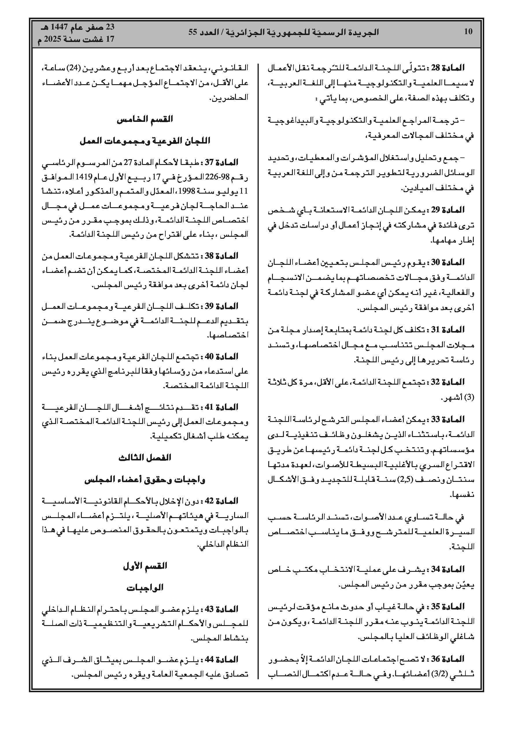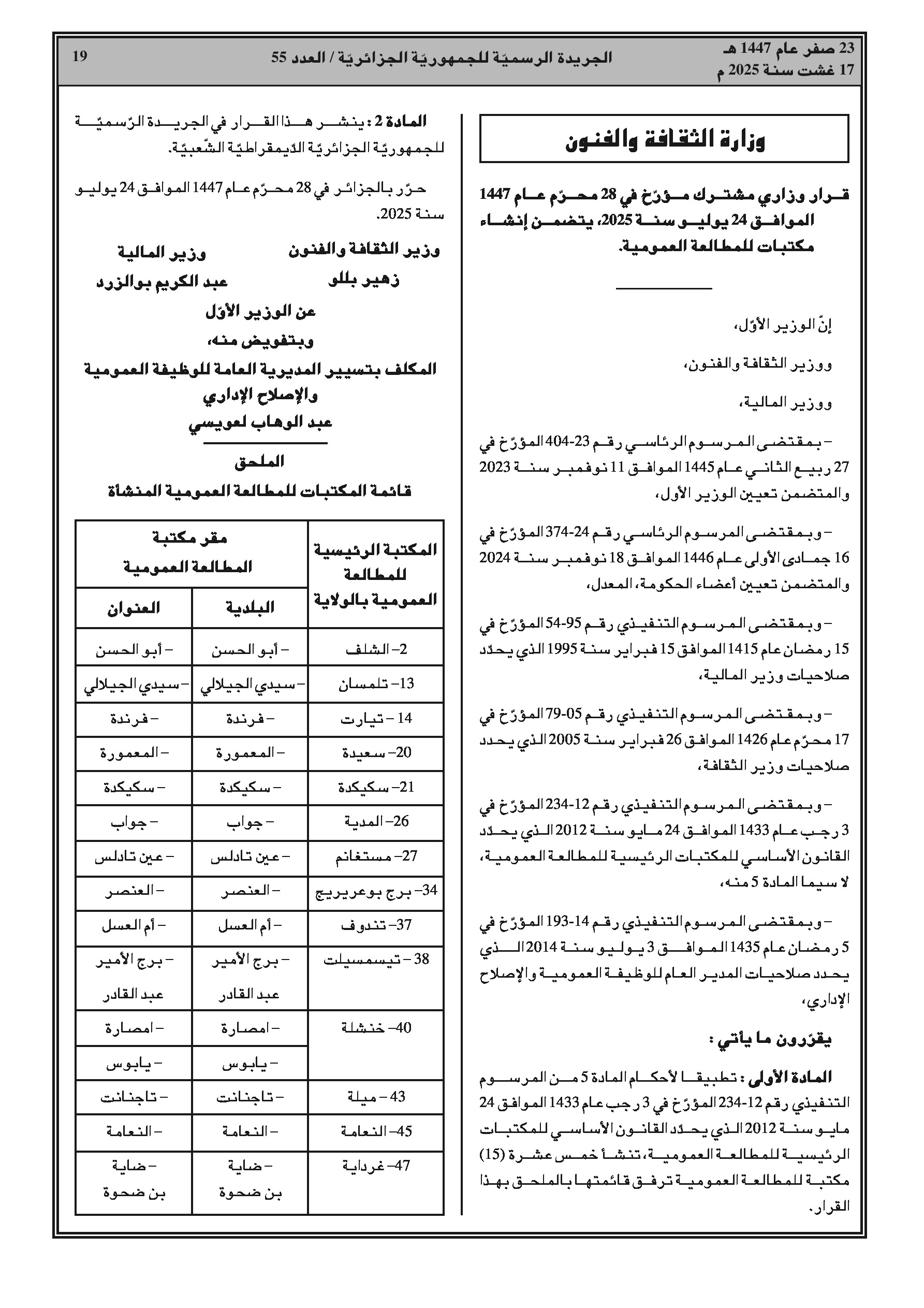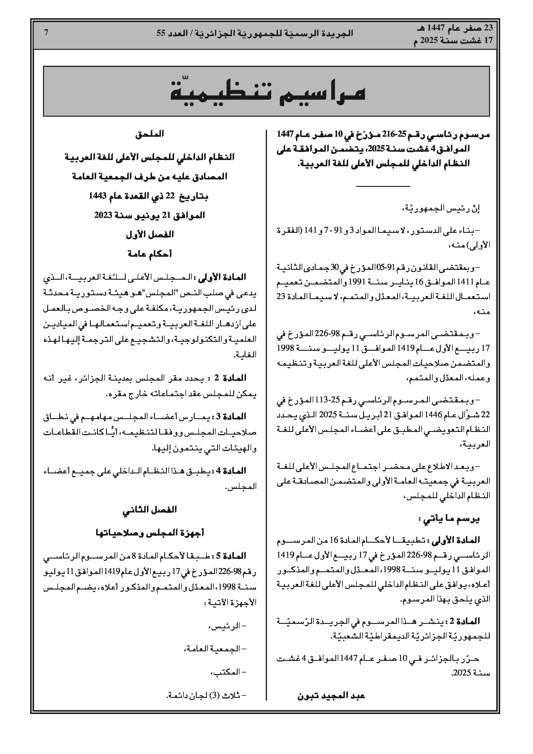 إصدار قرارات تنظيمية هامة تشمل المصادقة على النظام الداخلي للمجلس الأعلى للغة العربية، إنشاء مكتبات عمومية جديدة، تحديد تصنيف الوكالة الوطنية لمكافحة المنشطات، وتعديل تشكيلة هيئات رئيسية في قطاع الأدوية.