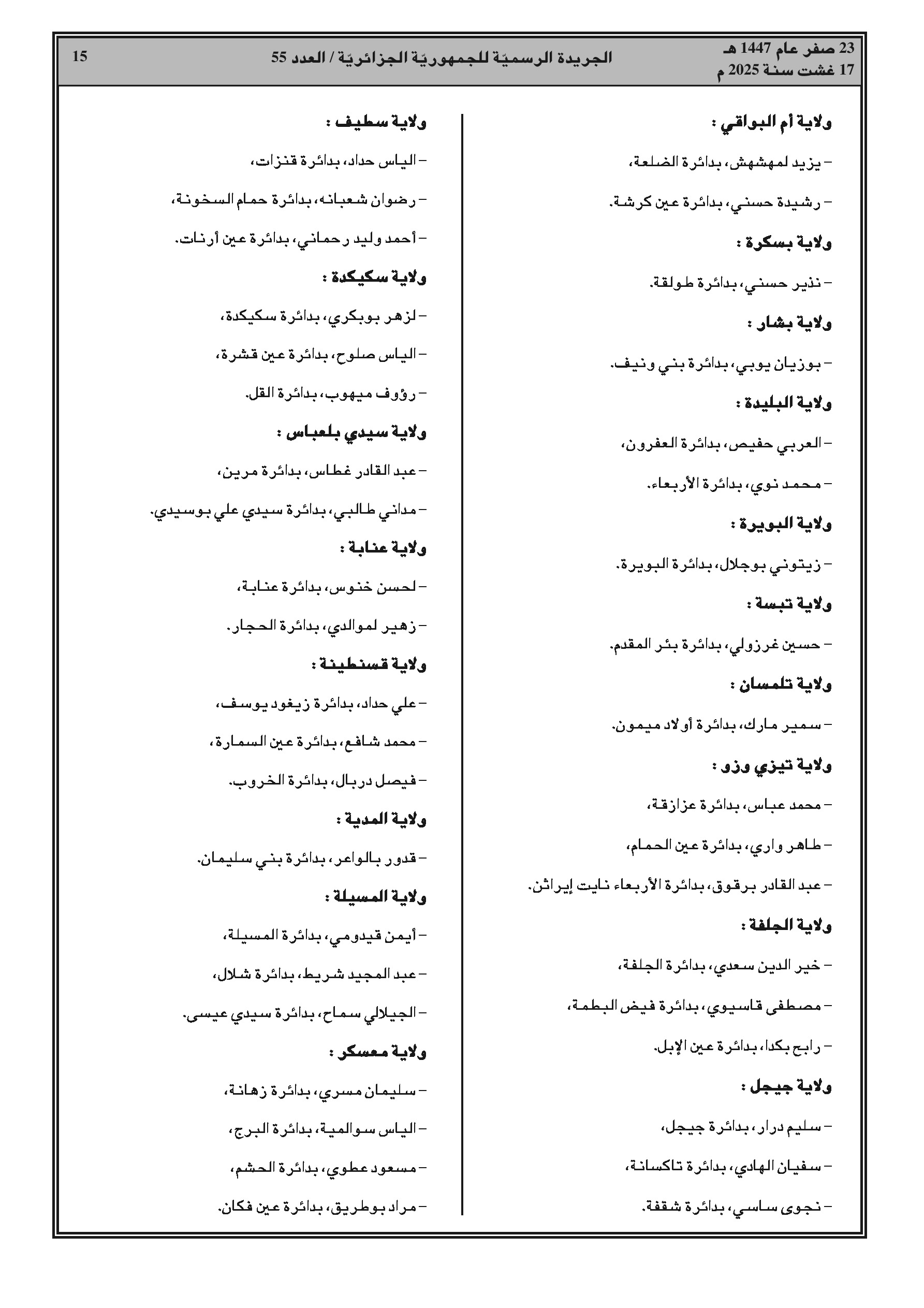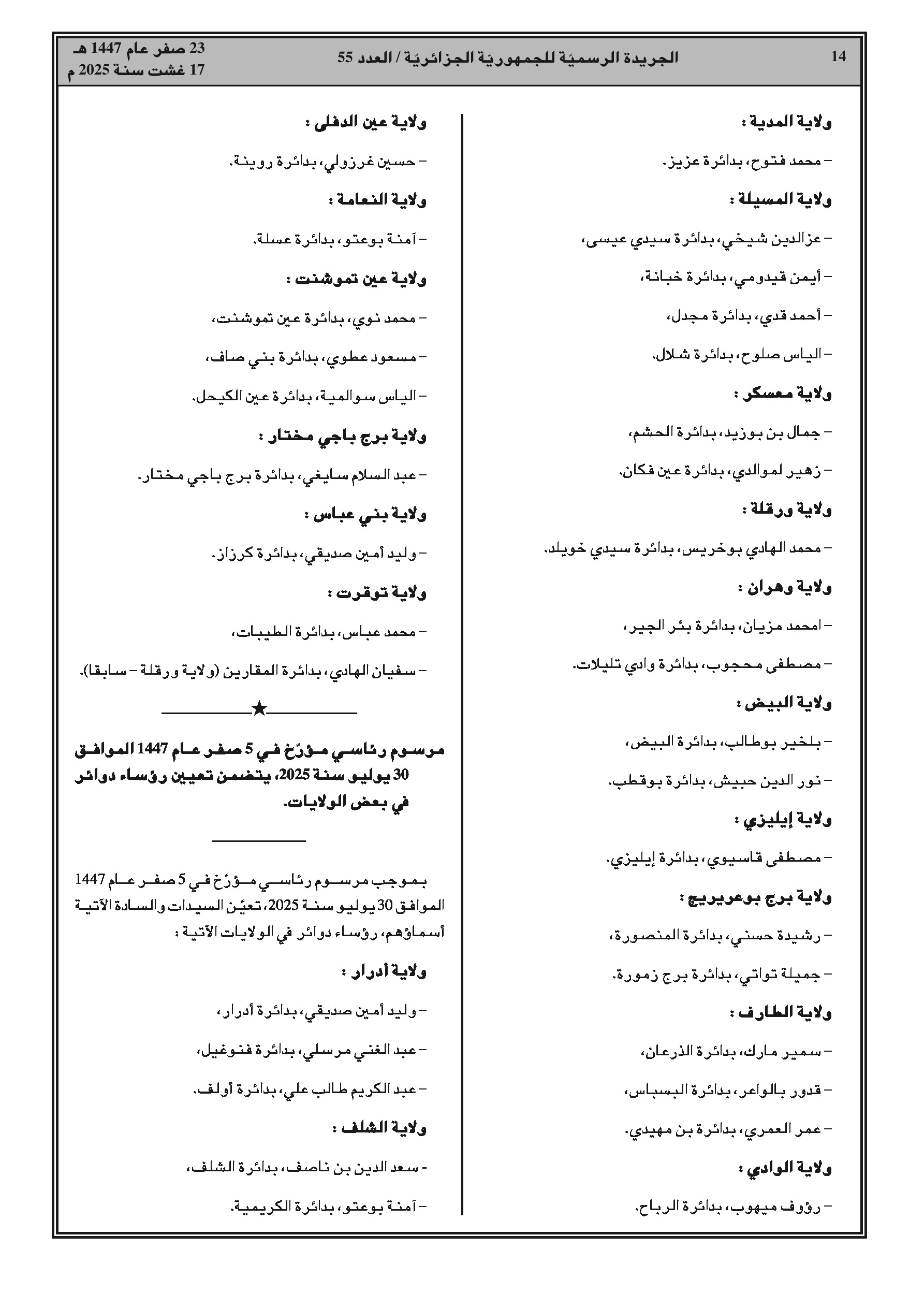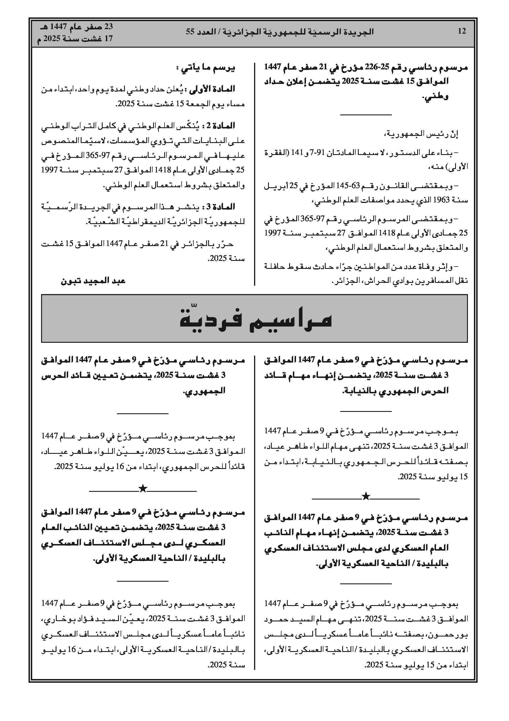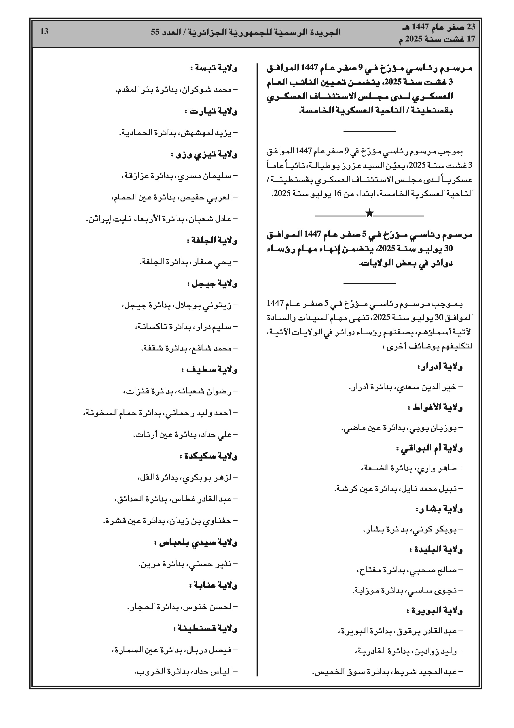 مراسيم رئاسية تتضمن إنهاء مهام وتعيين عدد كبير من رؤساء الدوائر في مختلف ولايات الوطن. كما تم تعيين قائد جديد للحرس الجمهوري ومدعين عامين عسكريين في البليدة وقسنطينة.