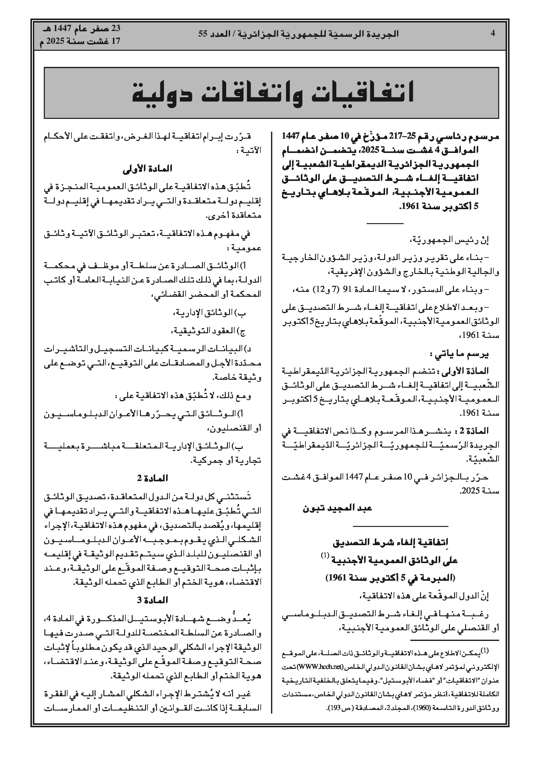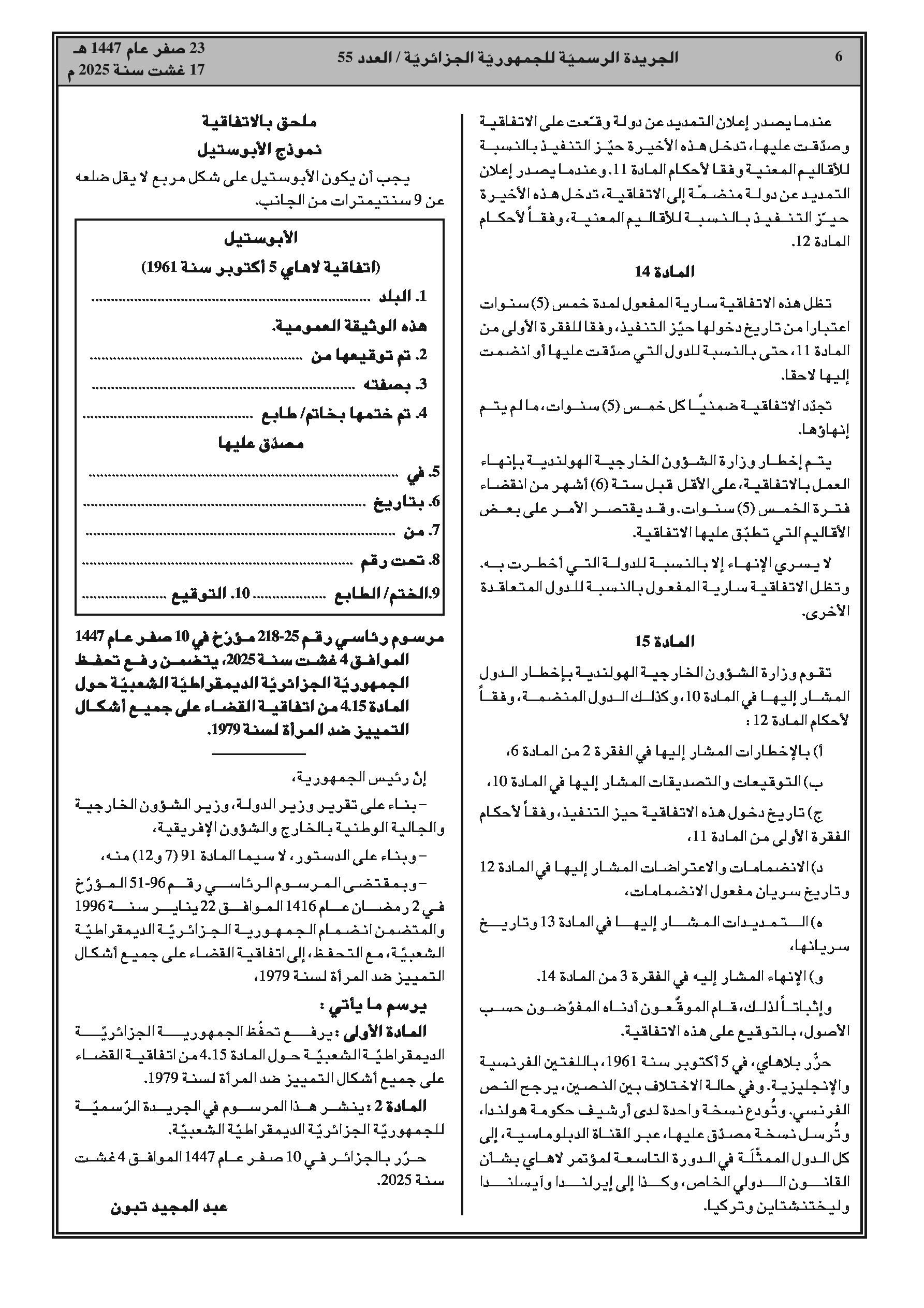 انضمام الجزائر إلى اتفاقية لاهاي ('الأبوستيل') لتبسيط التعامل بالوثائق الرسمية الأجنبية، ورفع التحفظ على مادة تضمن للمرأة المساواة أمام القانون وحرية التنقل.