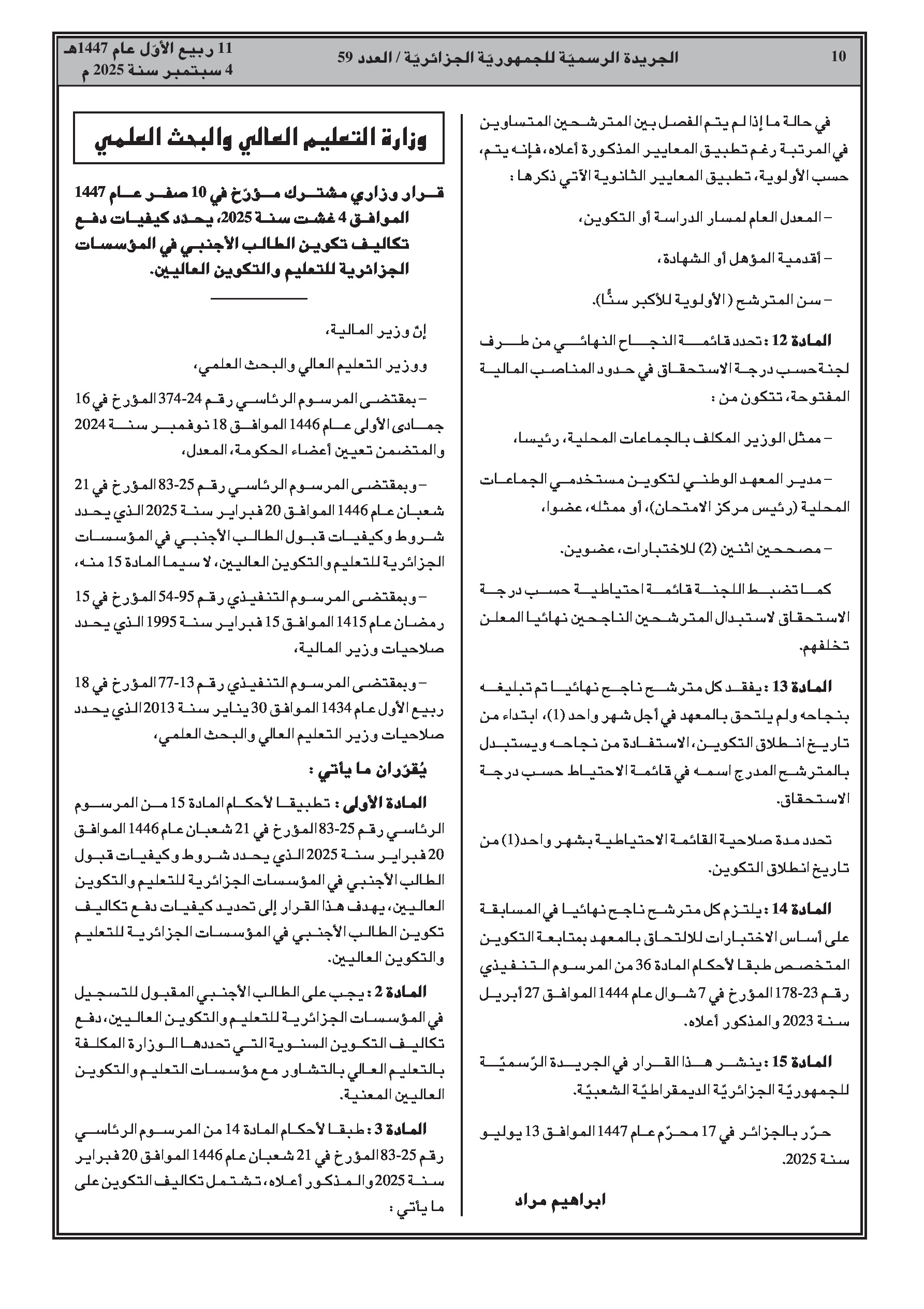 قرار وزاري مشترك يحدد كيفيات دفع رسوم تكوين الطالب الأجنبي في مؤسسات التعليم والتكوين العاليين الجزائرية.