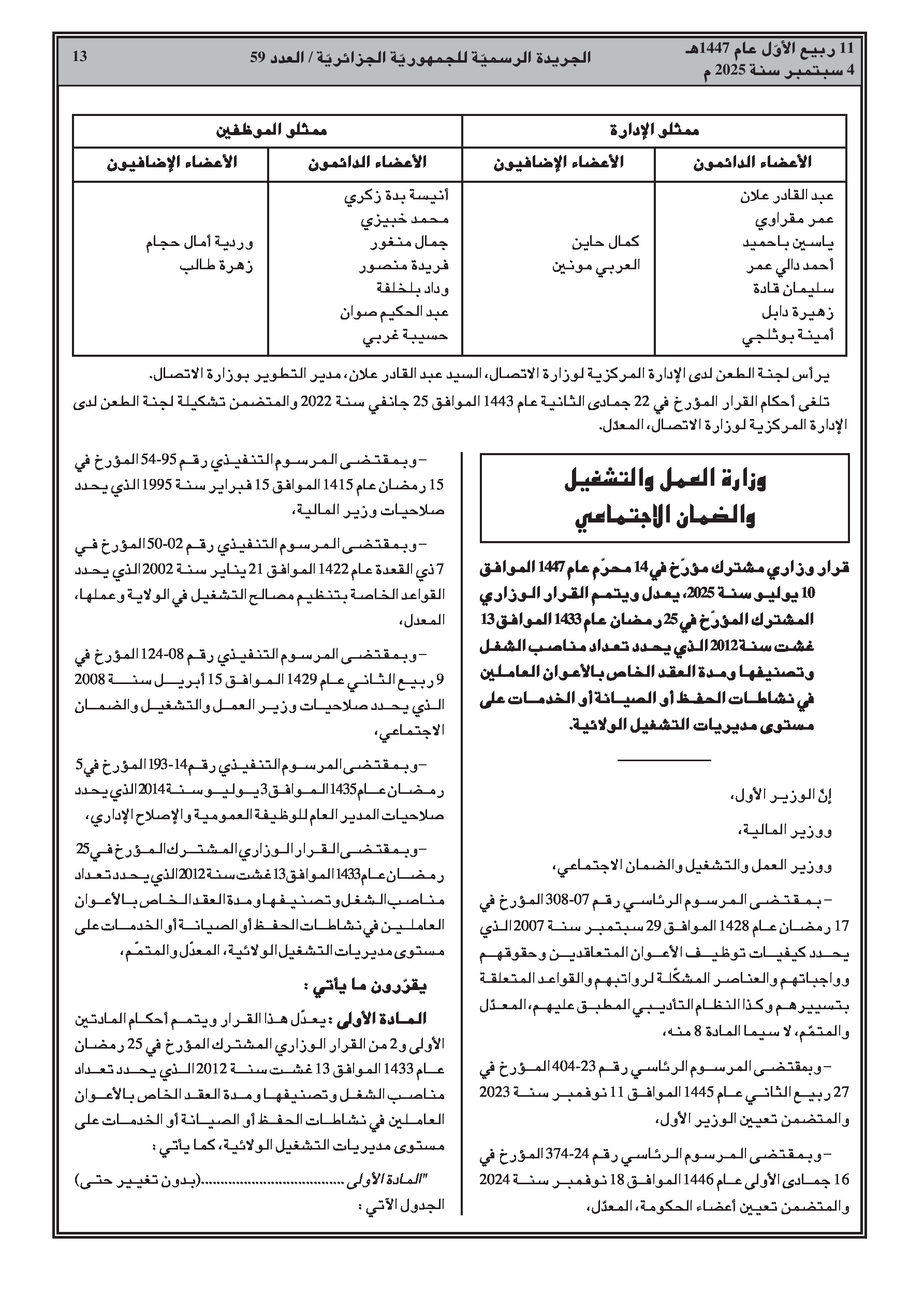 قرار وزاري مشترك يعدل القرار المؤرخ في 13 أوت 2012 الذي يحدد تعداد المناصب وتصنيفها ومدة عقود الأعوان المكلفين بنشاطات الحفظ أو الصيانة أو الخدمات على مستوى مديريات التشغيل للولاية.