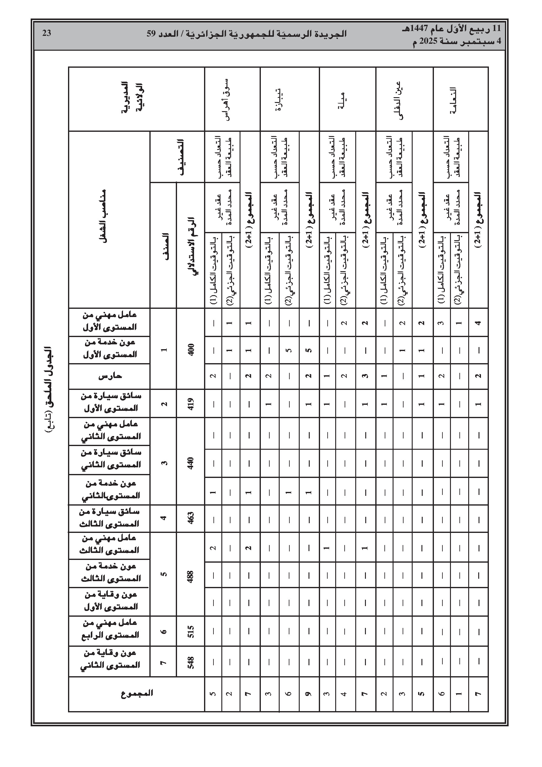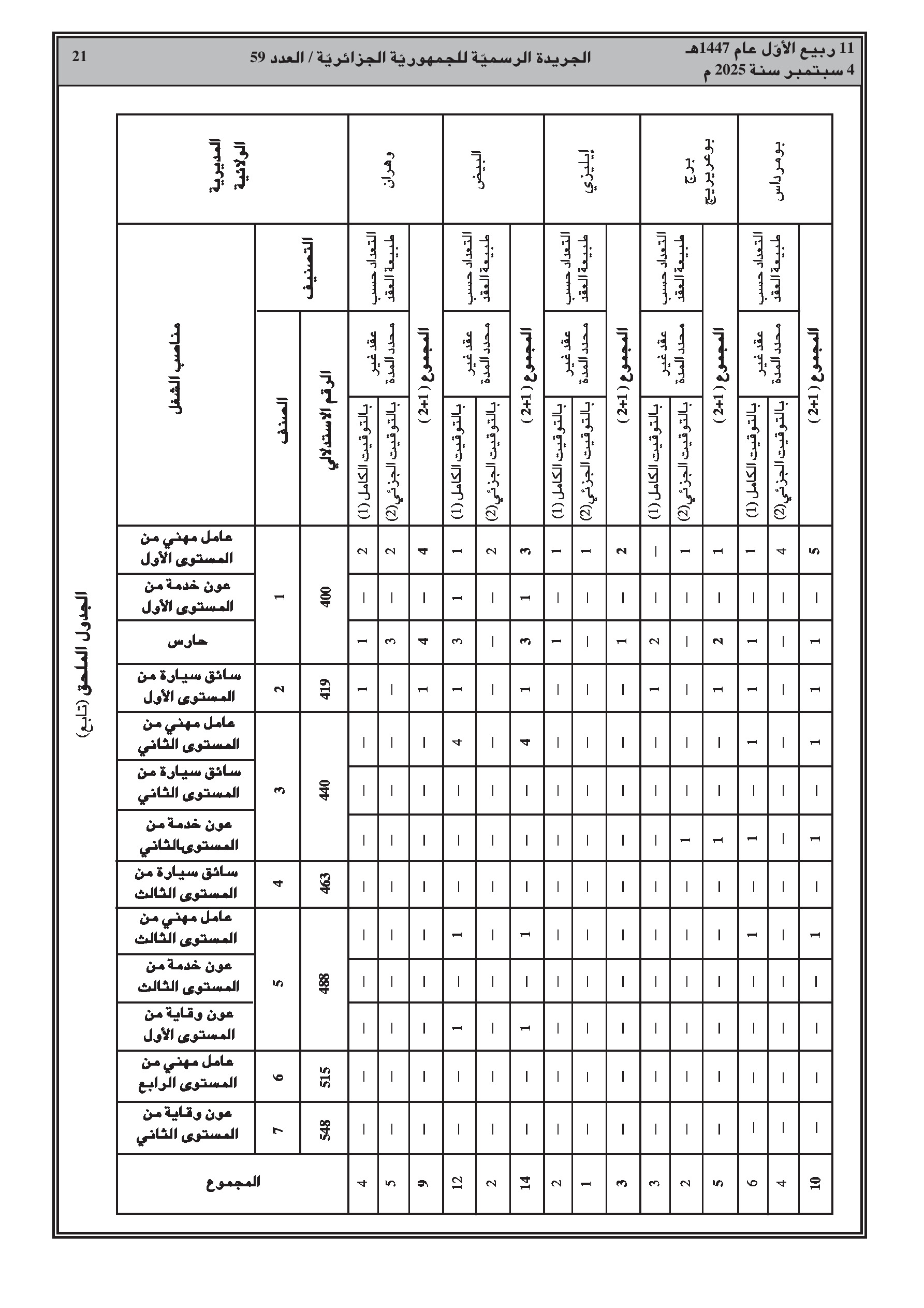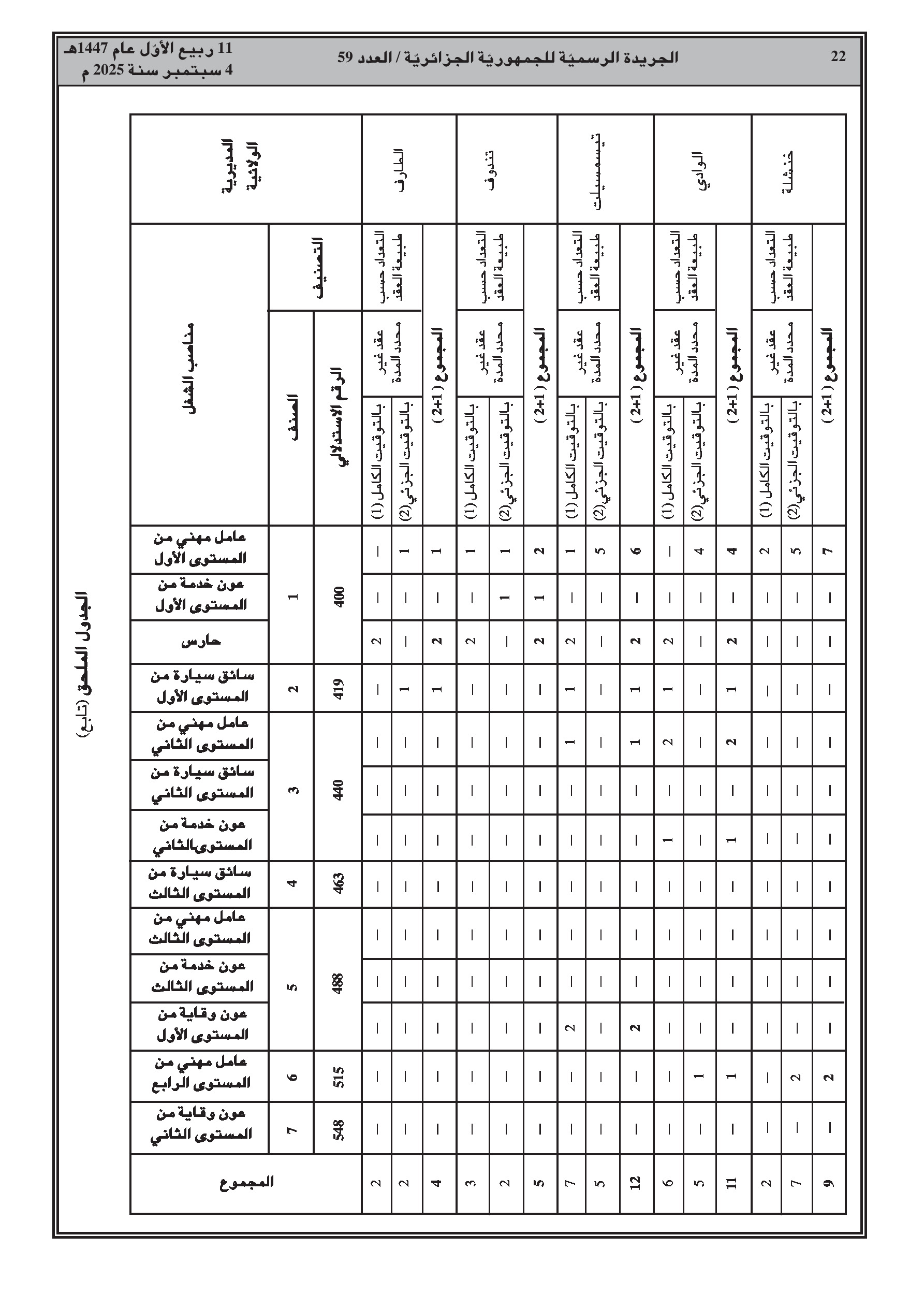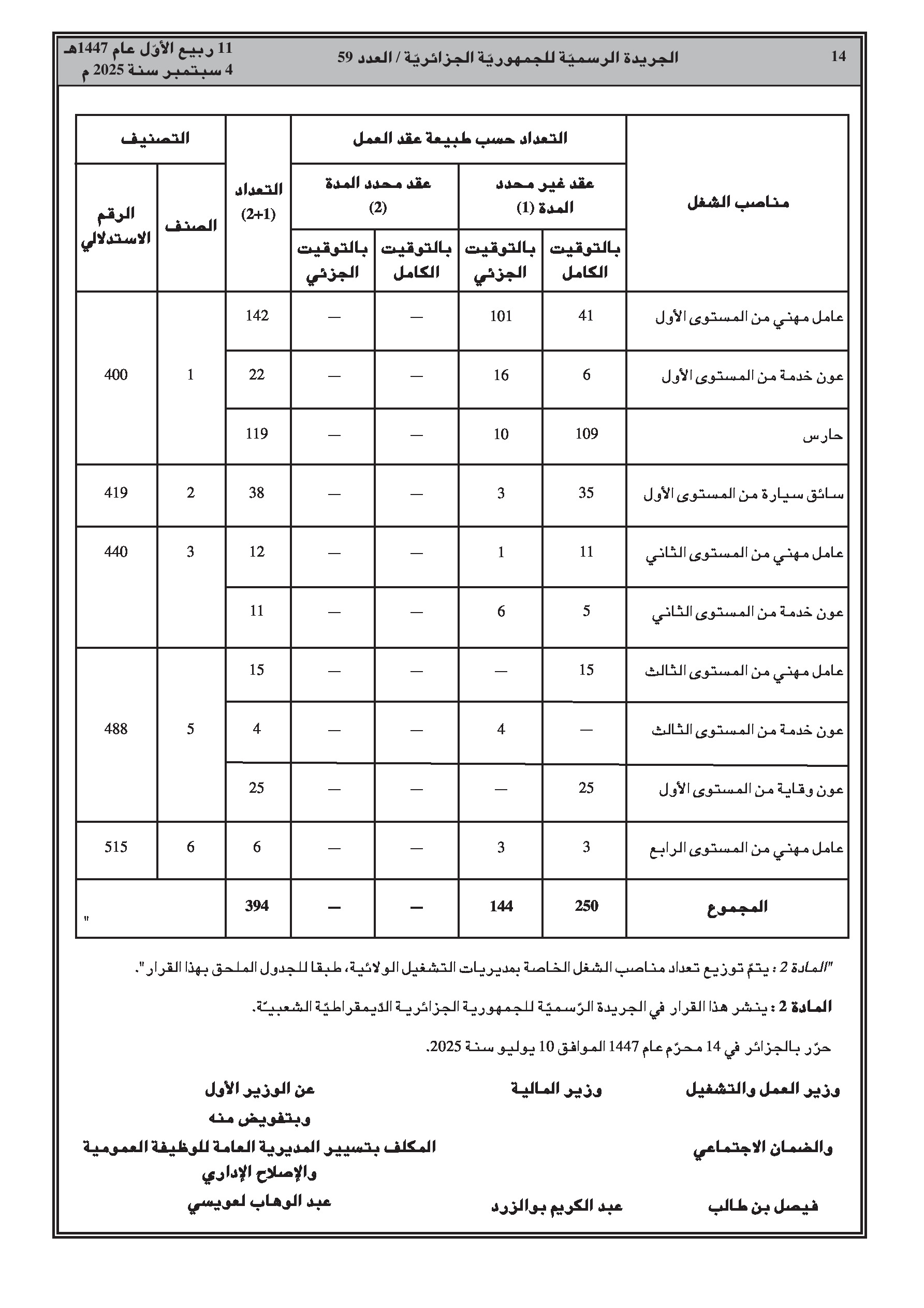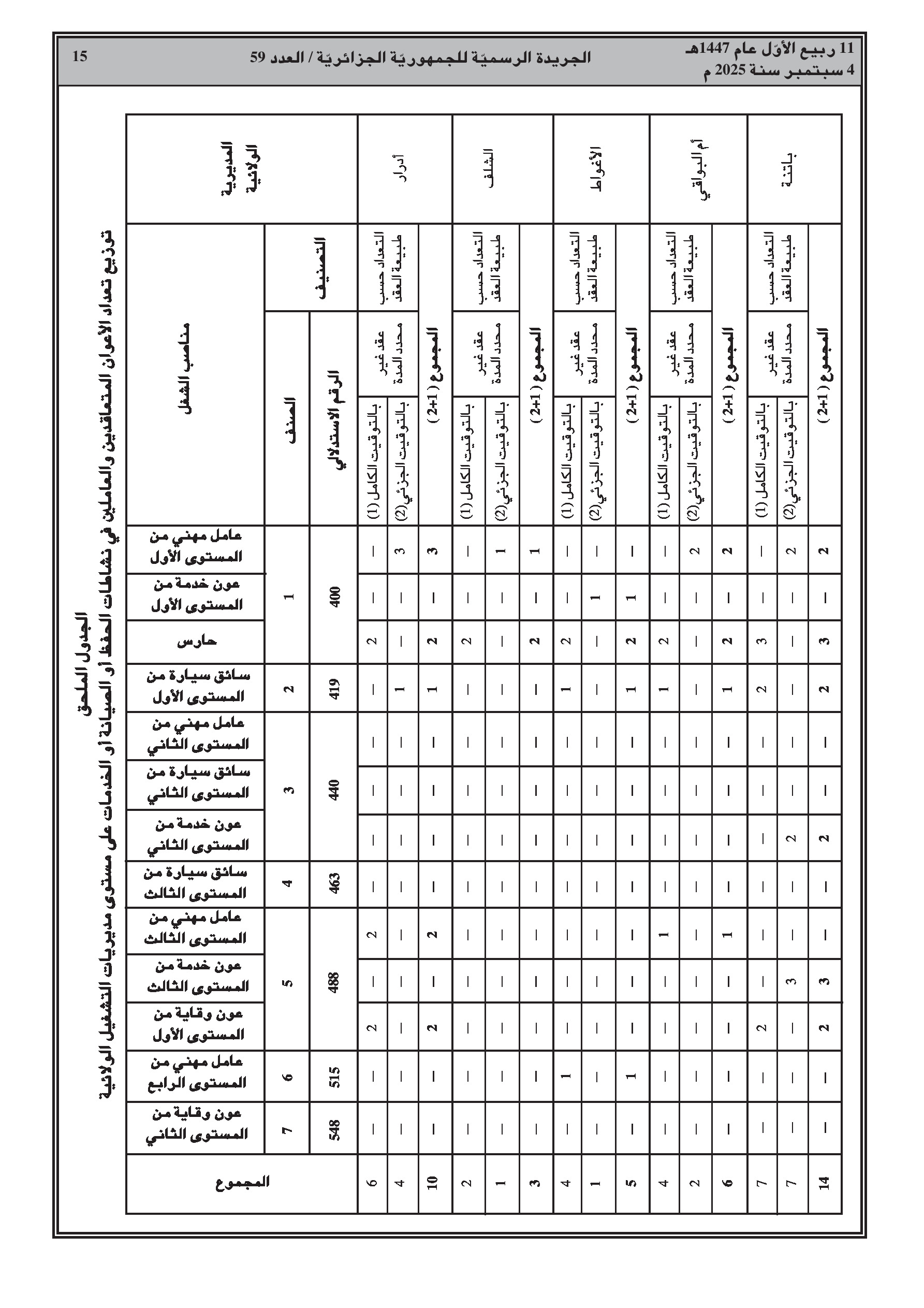 يحدد القرار الجديد العدد الإجمالي لمناصب العمل بـ 394 منصبًا، موزعة بين عقود غير محددة المدة (250) ومحددة المدة (144). يتضمن القرار جداول تفصيلية لتوزيع هذه المناصب حسب كل ولاية ونوع المنصب (عامل مهني، عون خدمة، حارس، سائق).