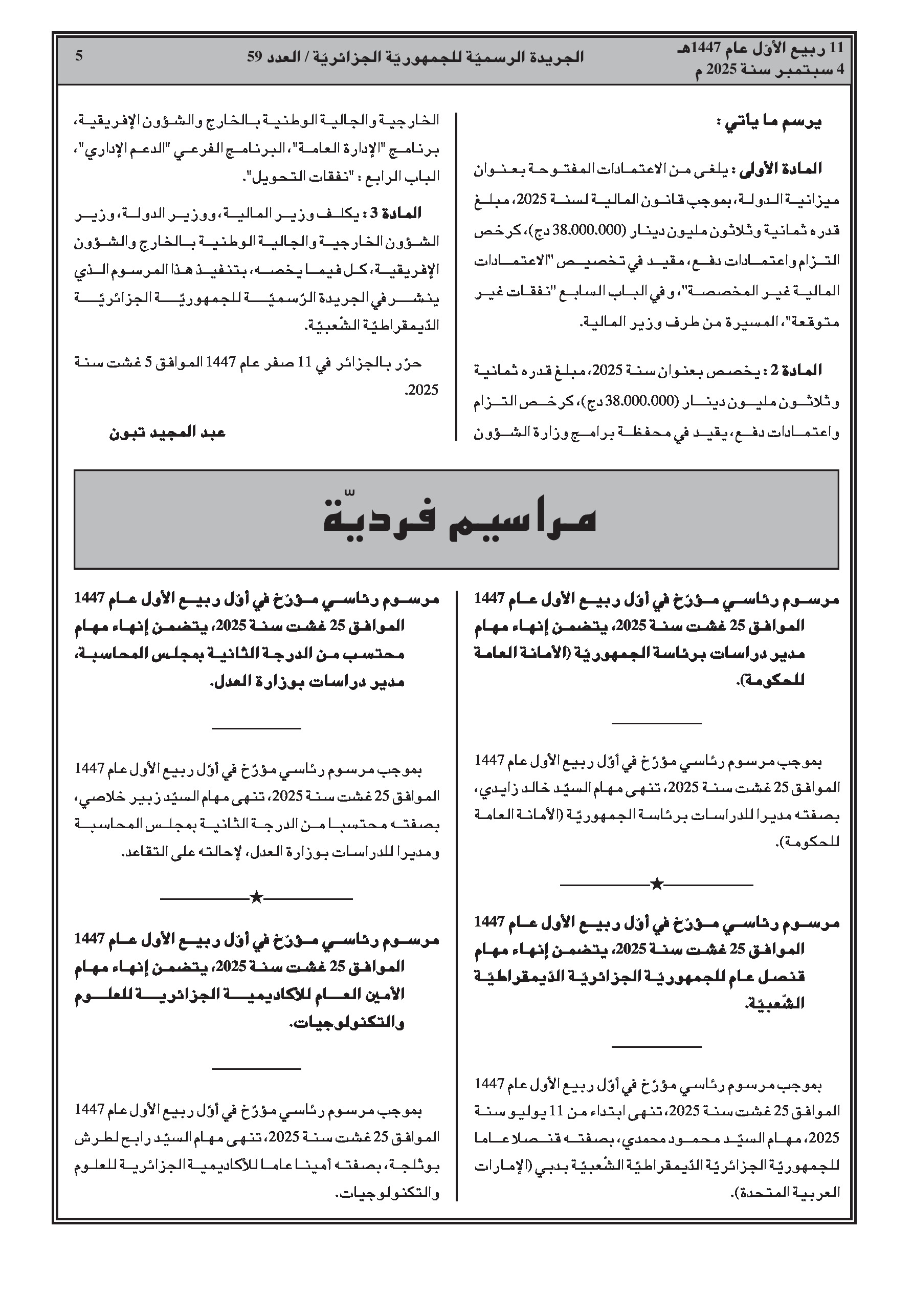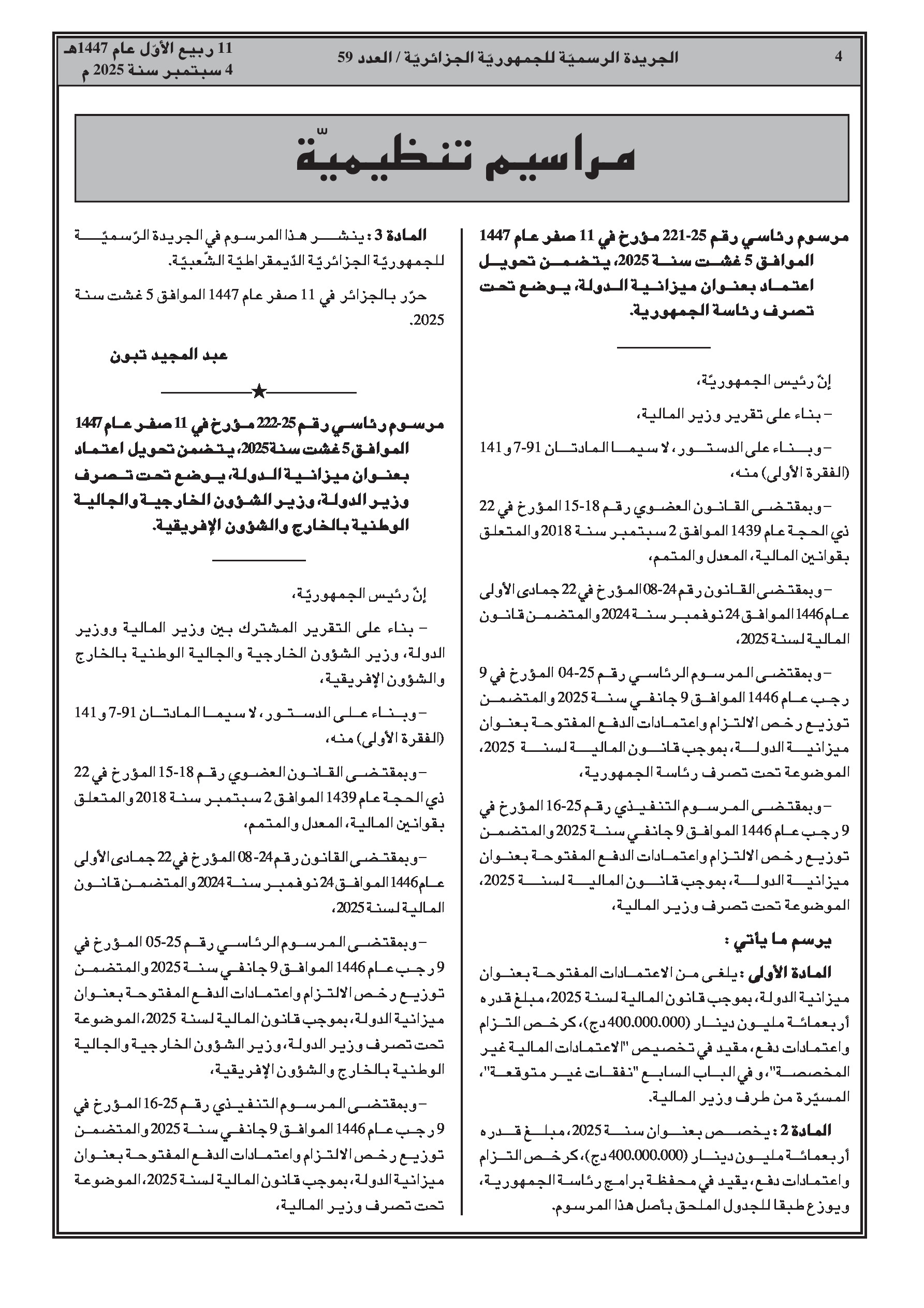 مرسومان رئاسيان يقضيان بتحويل اعتمادات مالية من ميزانية الدولة لسنة 2025.