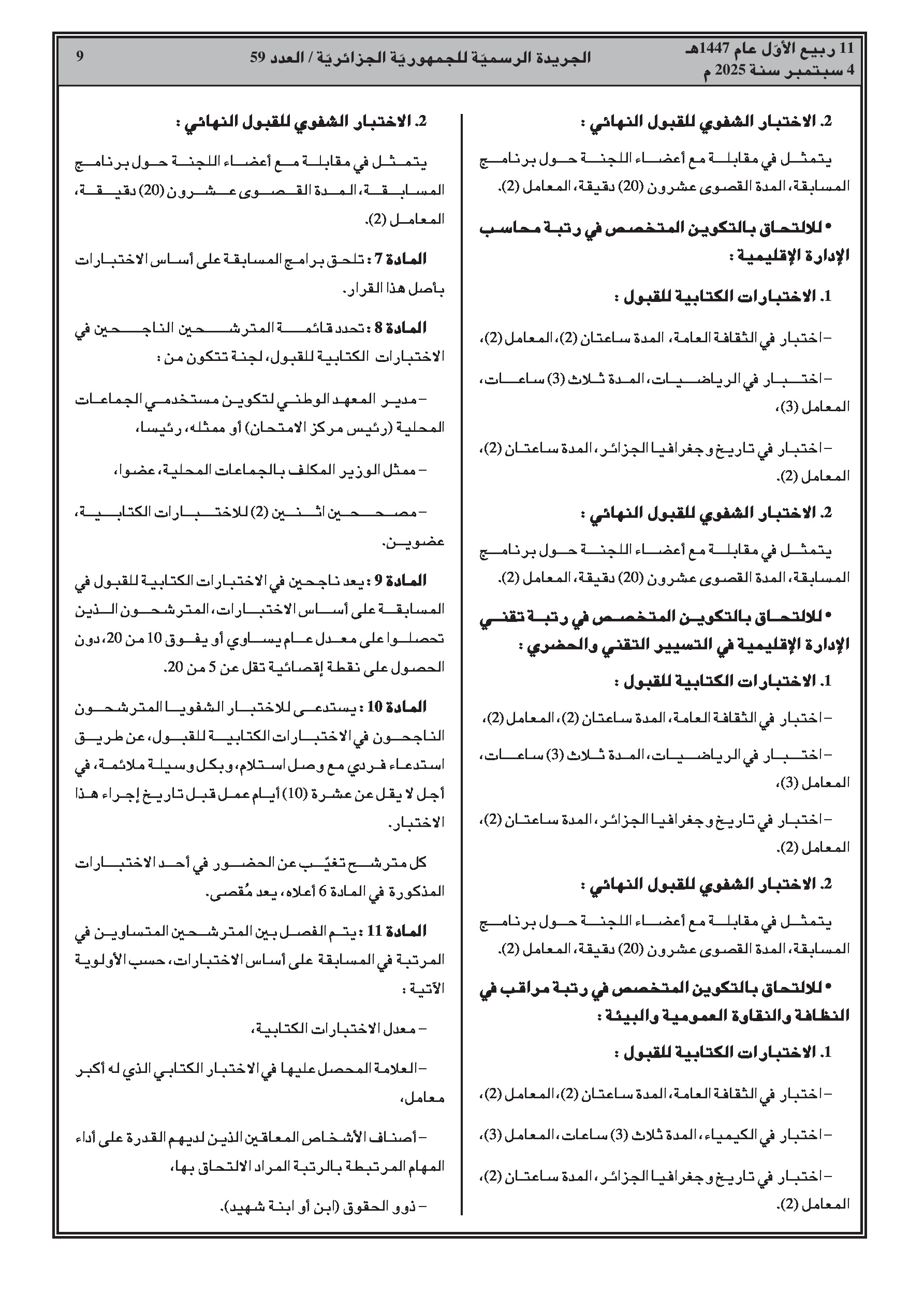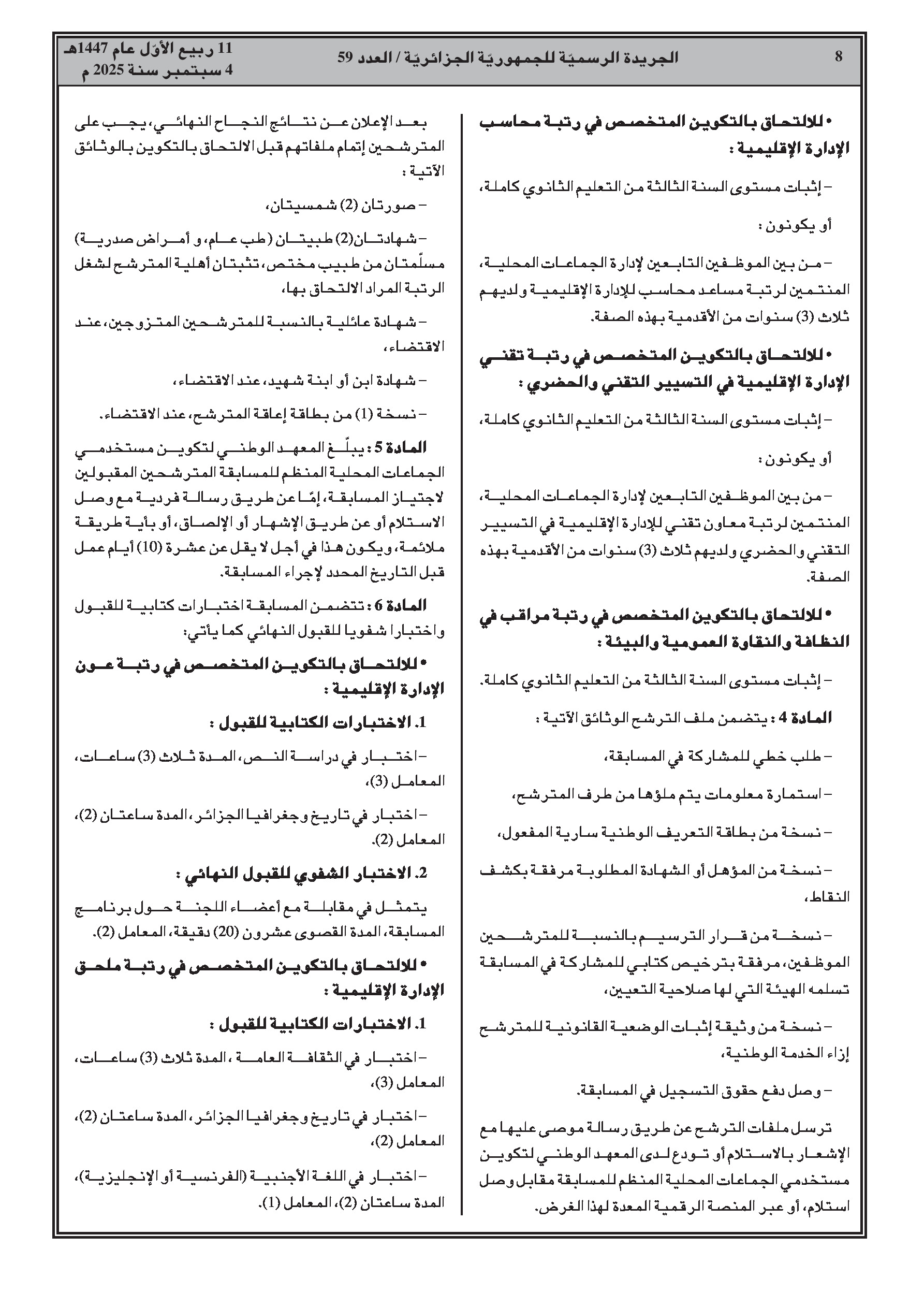 قرار وزاري يحدد كيفيات تنظيم المسابقة على أساس الاختبارات للالتحاق بالمعاهد الوطنية لتكوين مستخدمي الجماعات المحلية.