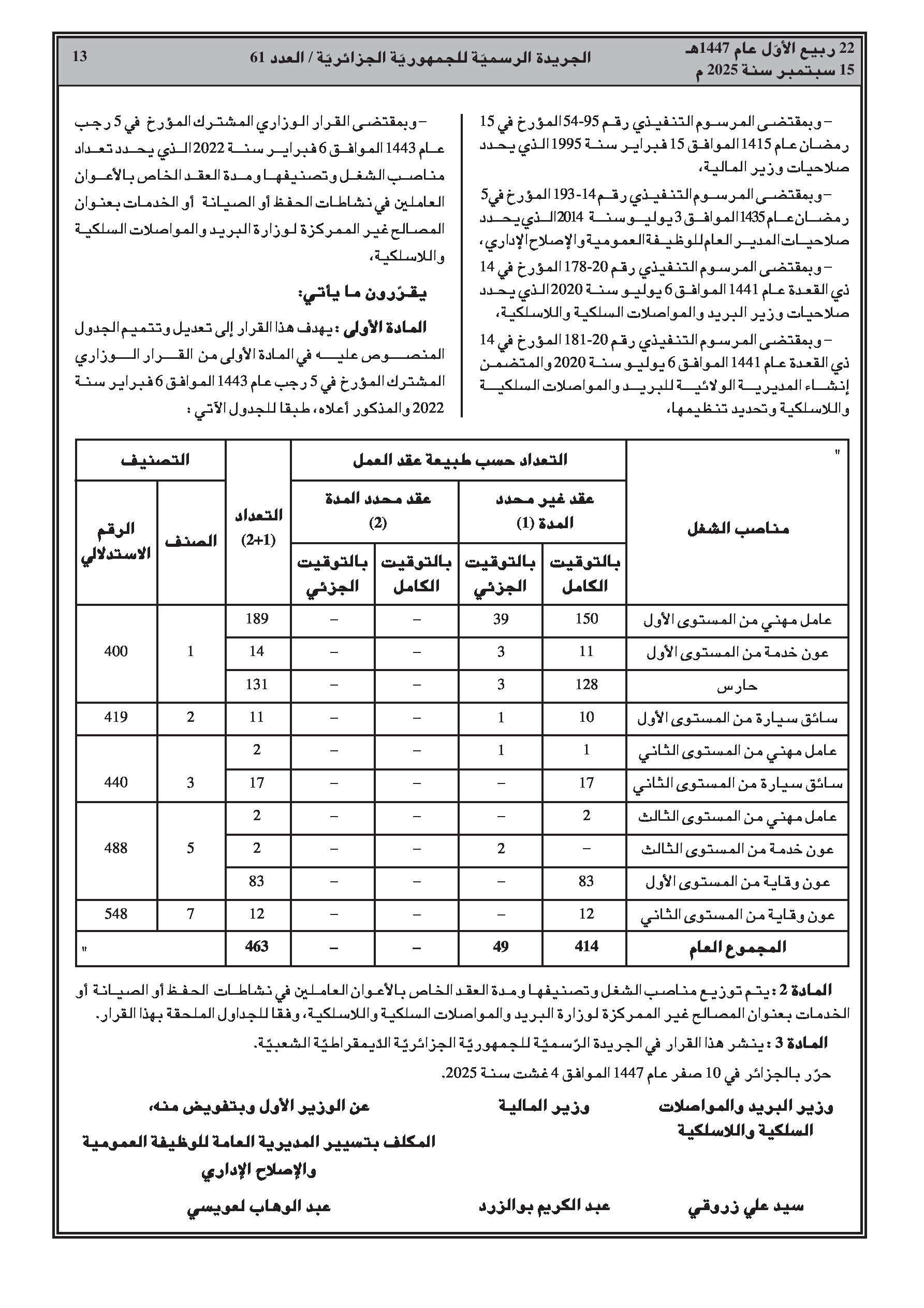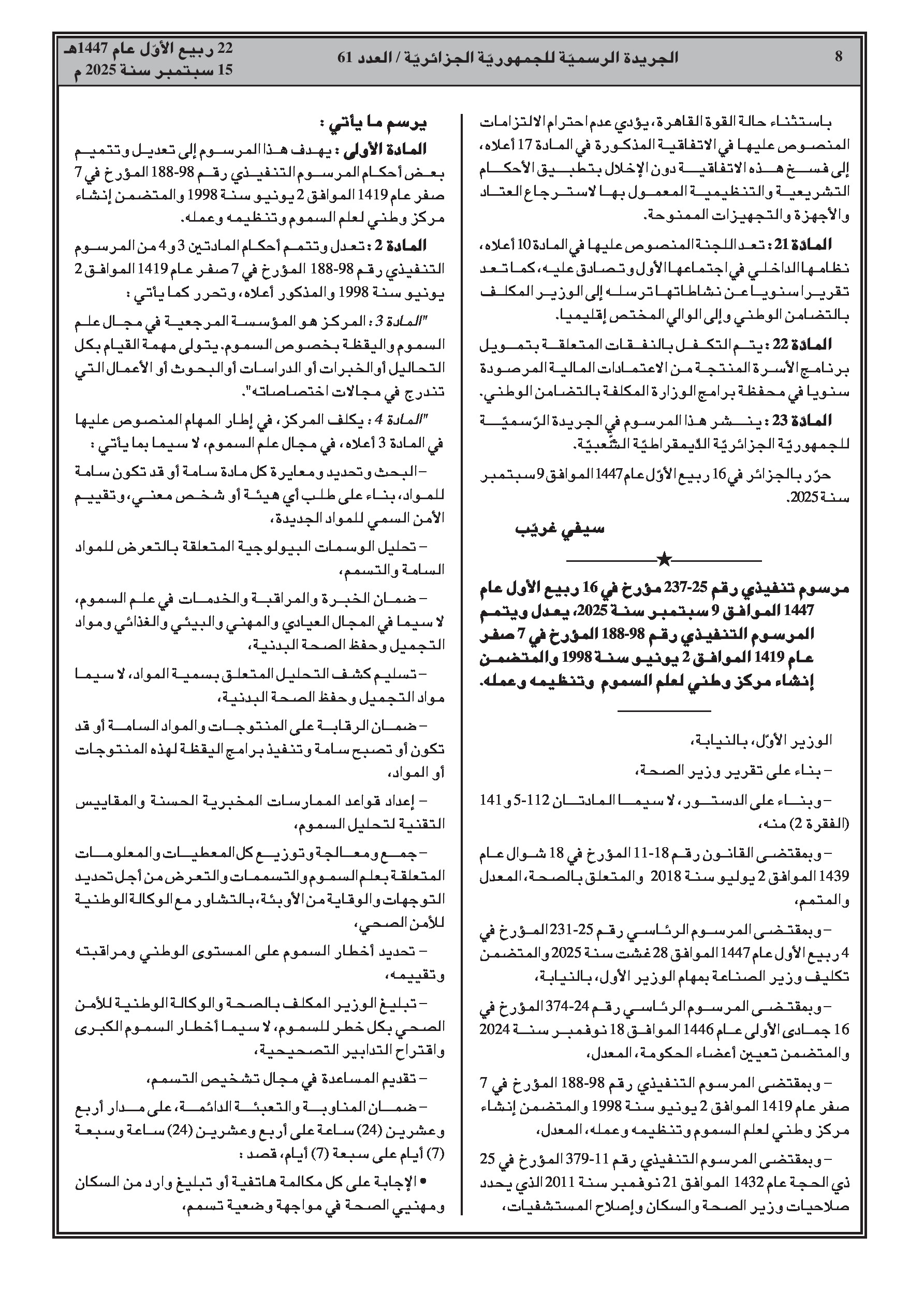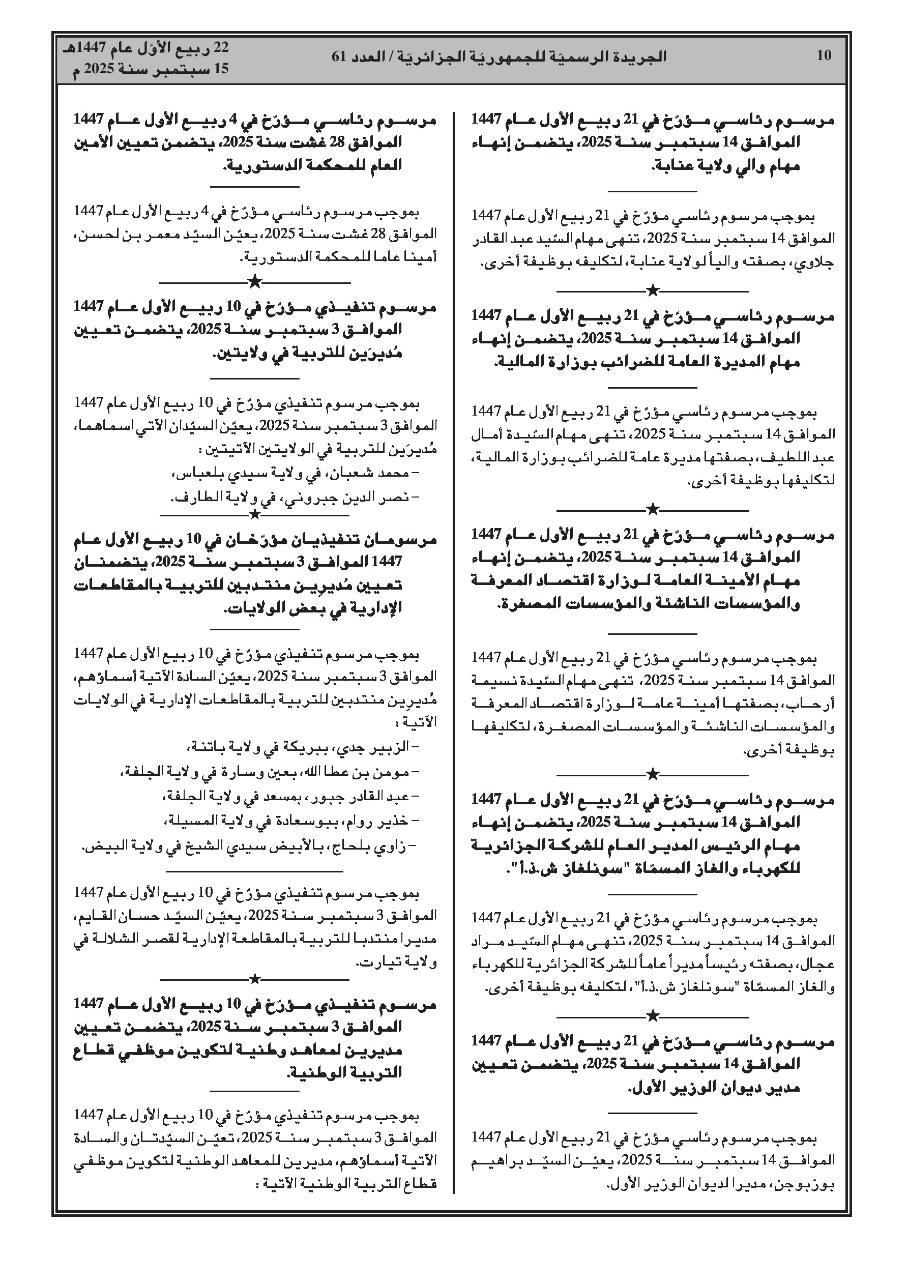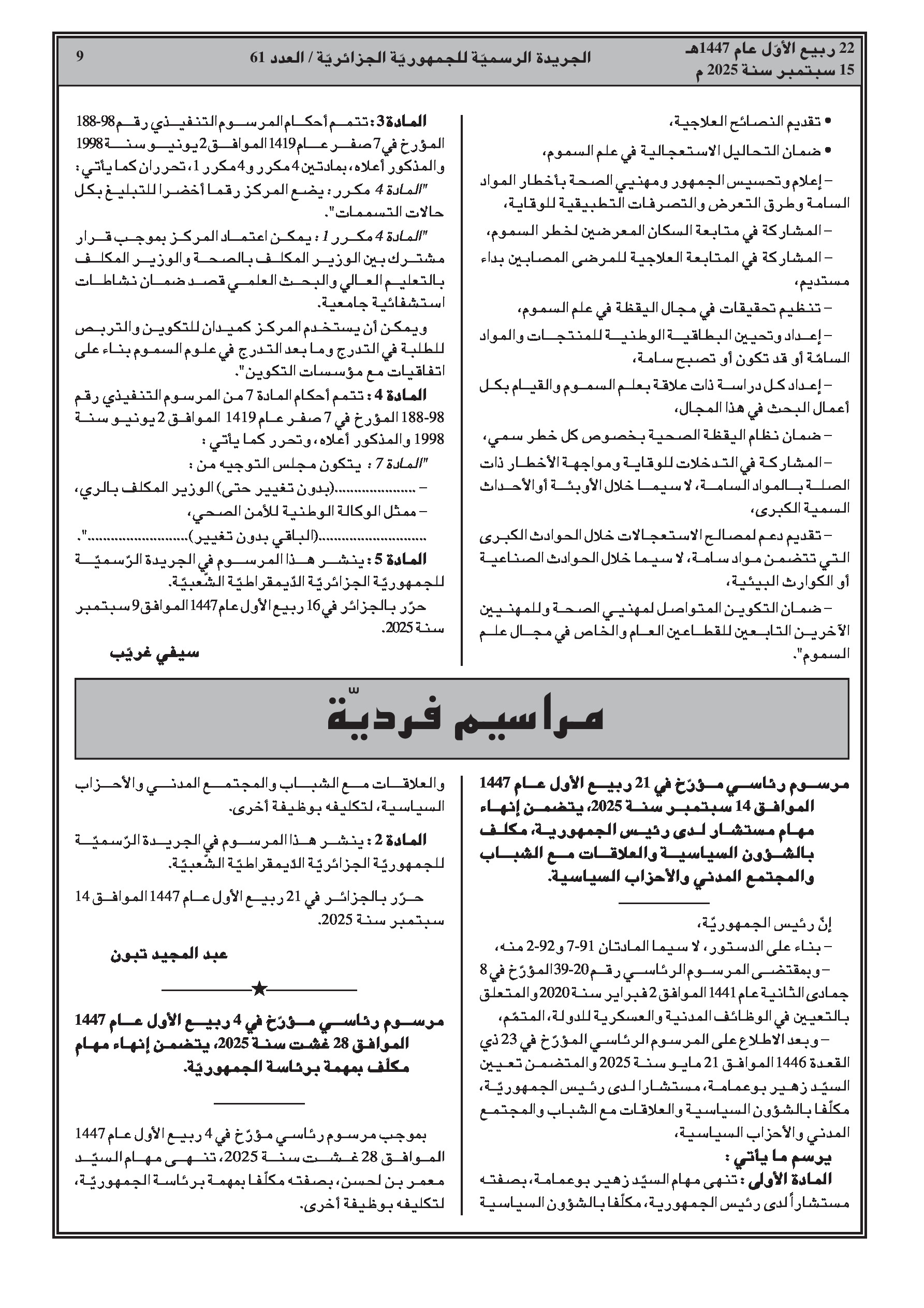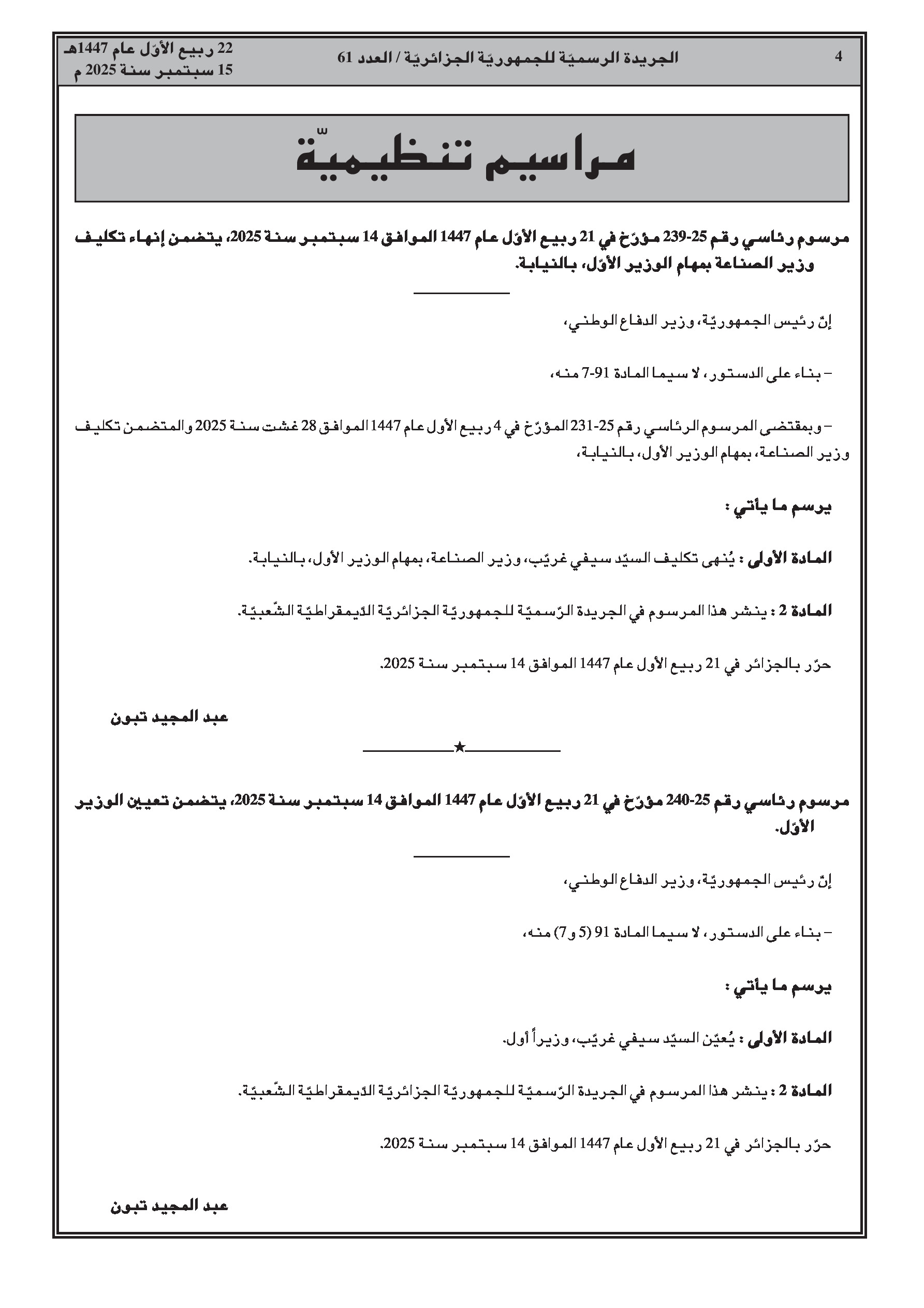 - مرسوم رئاسي رقم 25-240 يعين السيد سيفي غريب وزيرا أول.