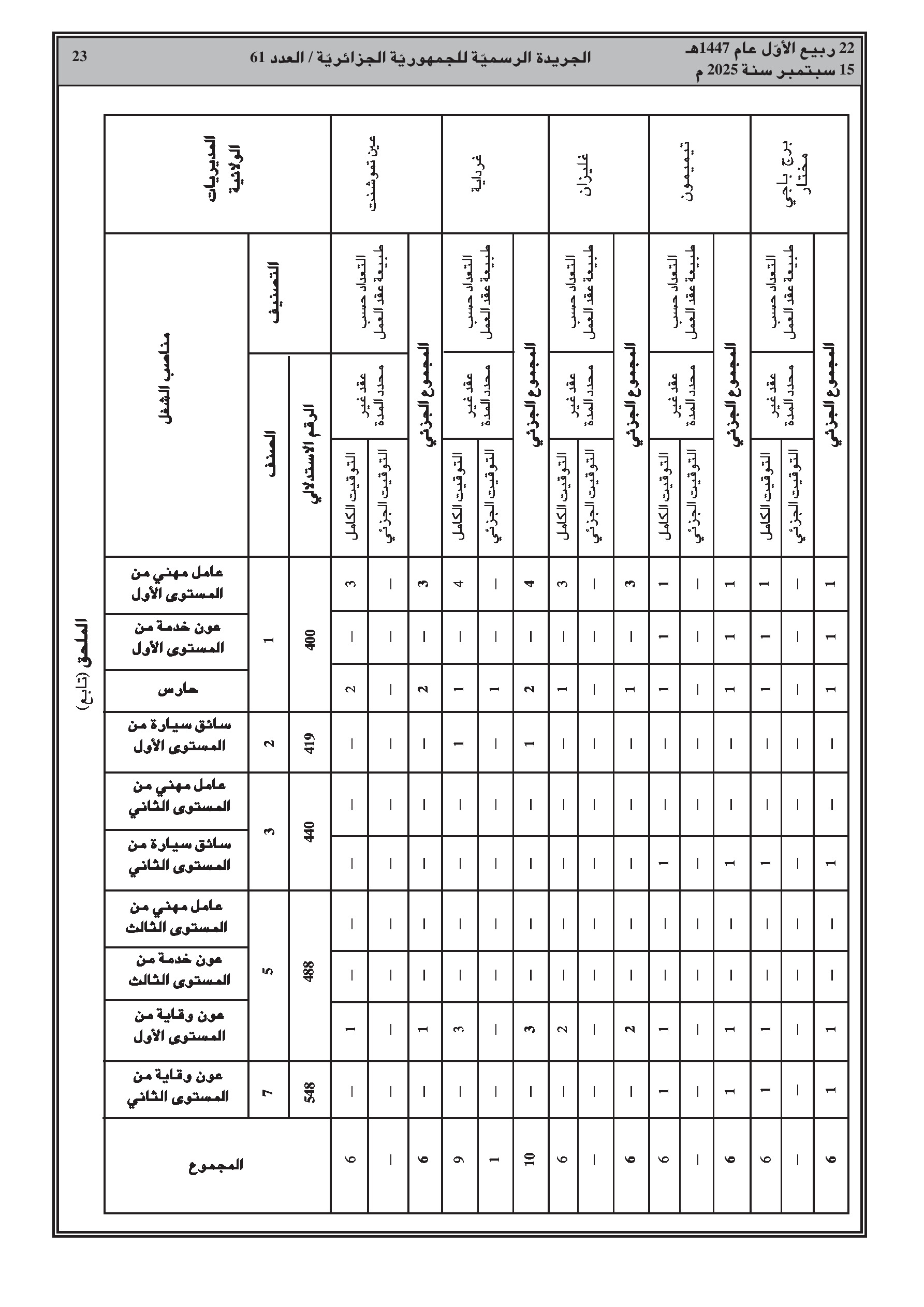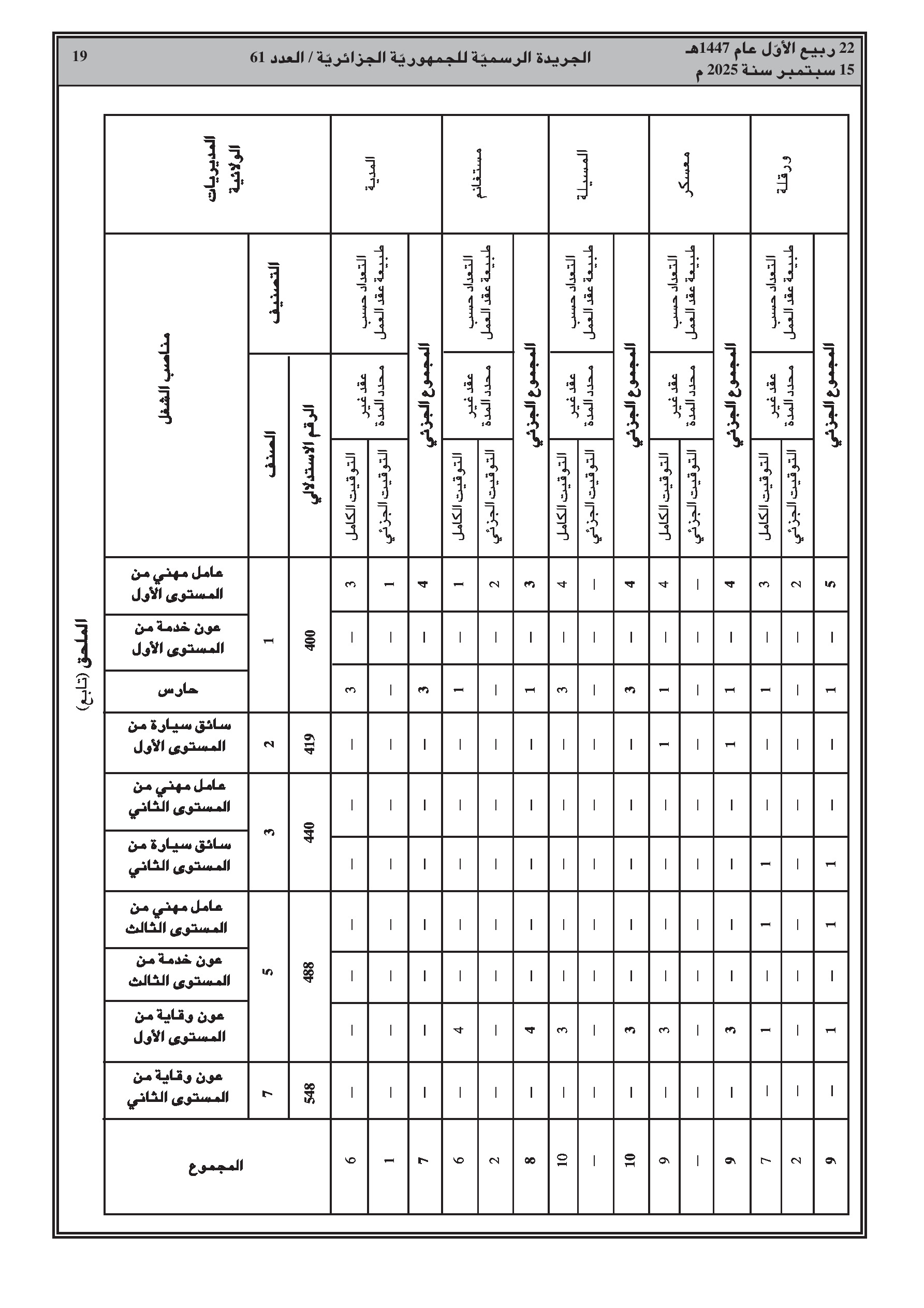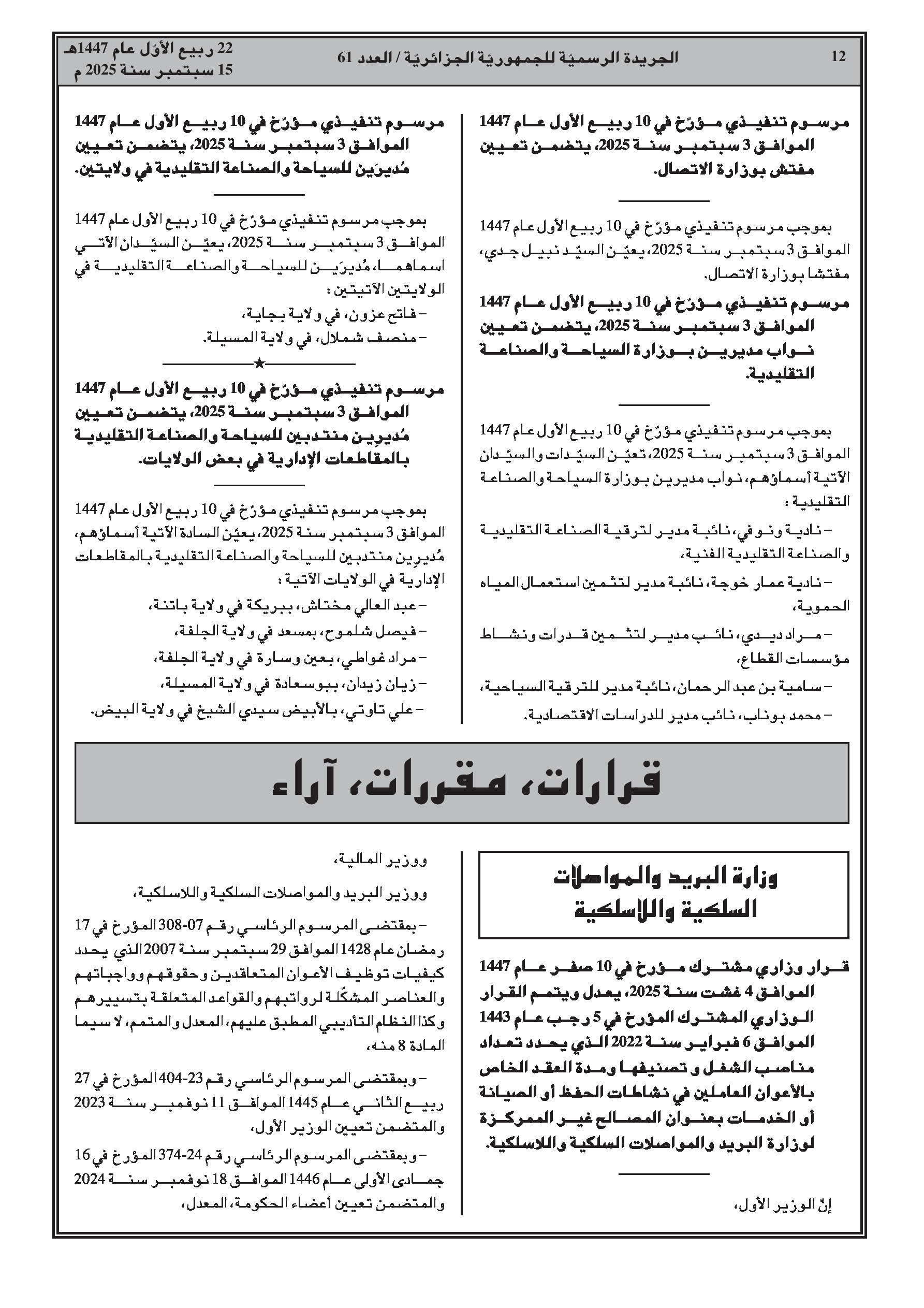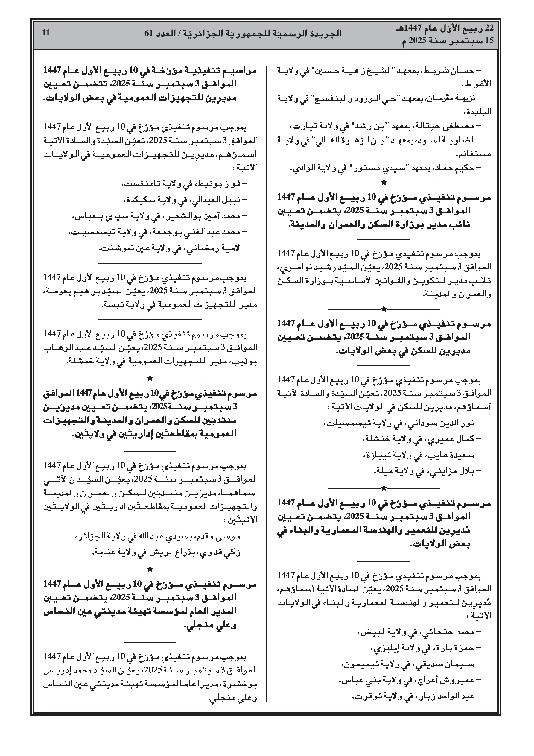 - تعيين مدراء جدد في قطاعات التربية، السكن، التعمير، السياحة، والتجهيزات العمومية في عدة ولايات.