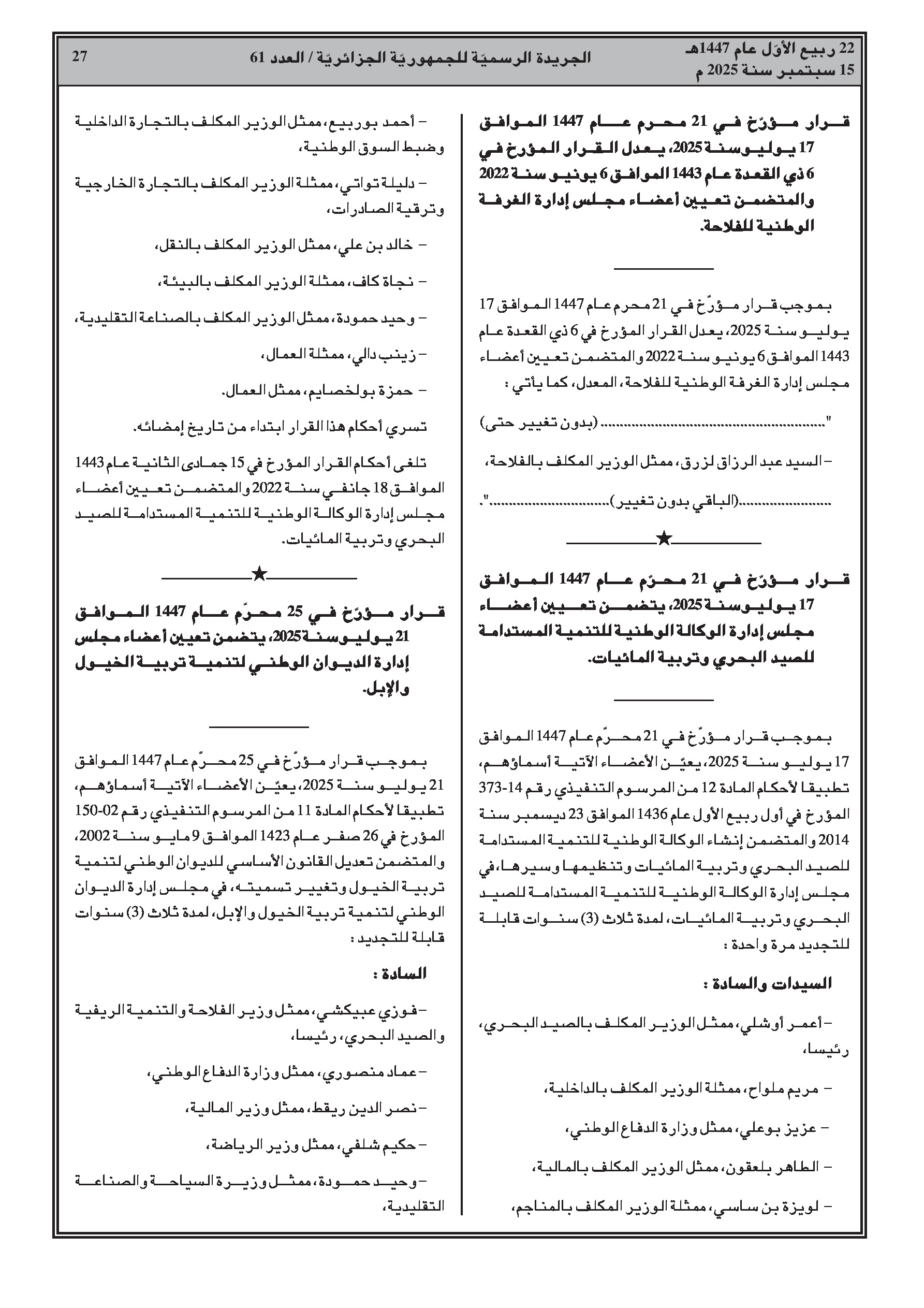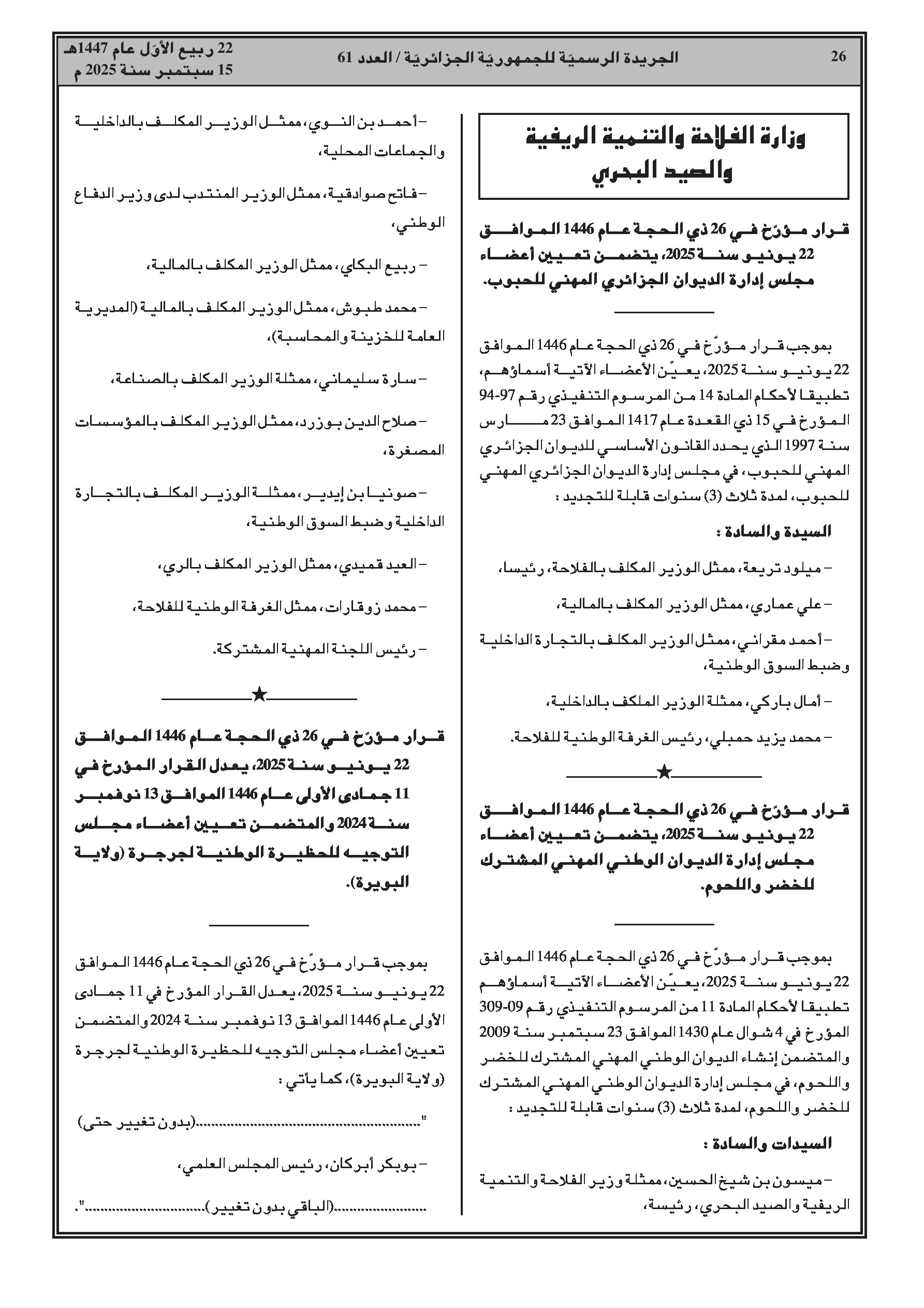 - الفلاحة: تعيين أعضاء مجالس إدارة الديوان الجزائري المهني للحبوب، الديوان الوطني للخضر واللحوم، الوكالة الوطنية لتنمية الصيد البحري وتربية المائيات، والديوان الوطني لتطوير تربية الخيل والإبل.