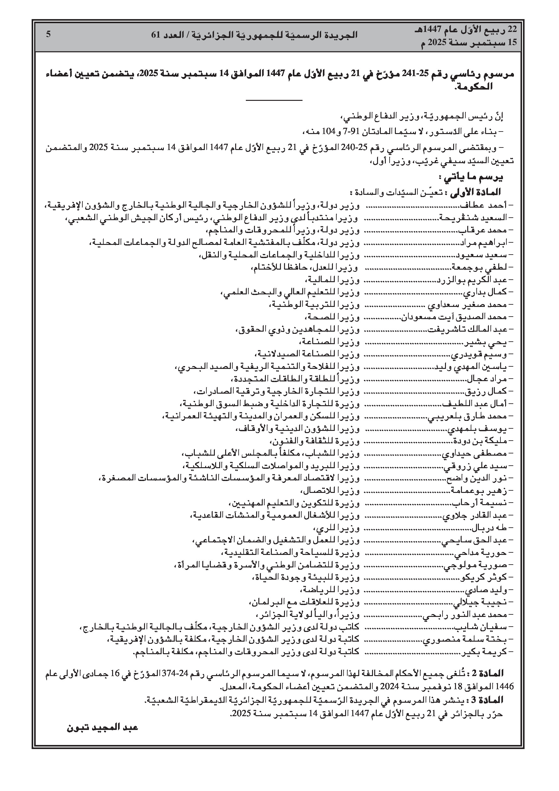 - مرسوم رئاسي رقم 25-241 يعين أعضاء الحكومة الجدد في مختلف الحقائب الوزارية.