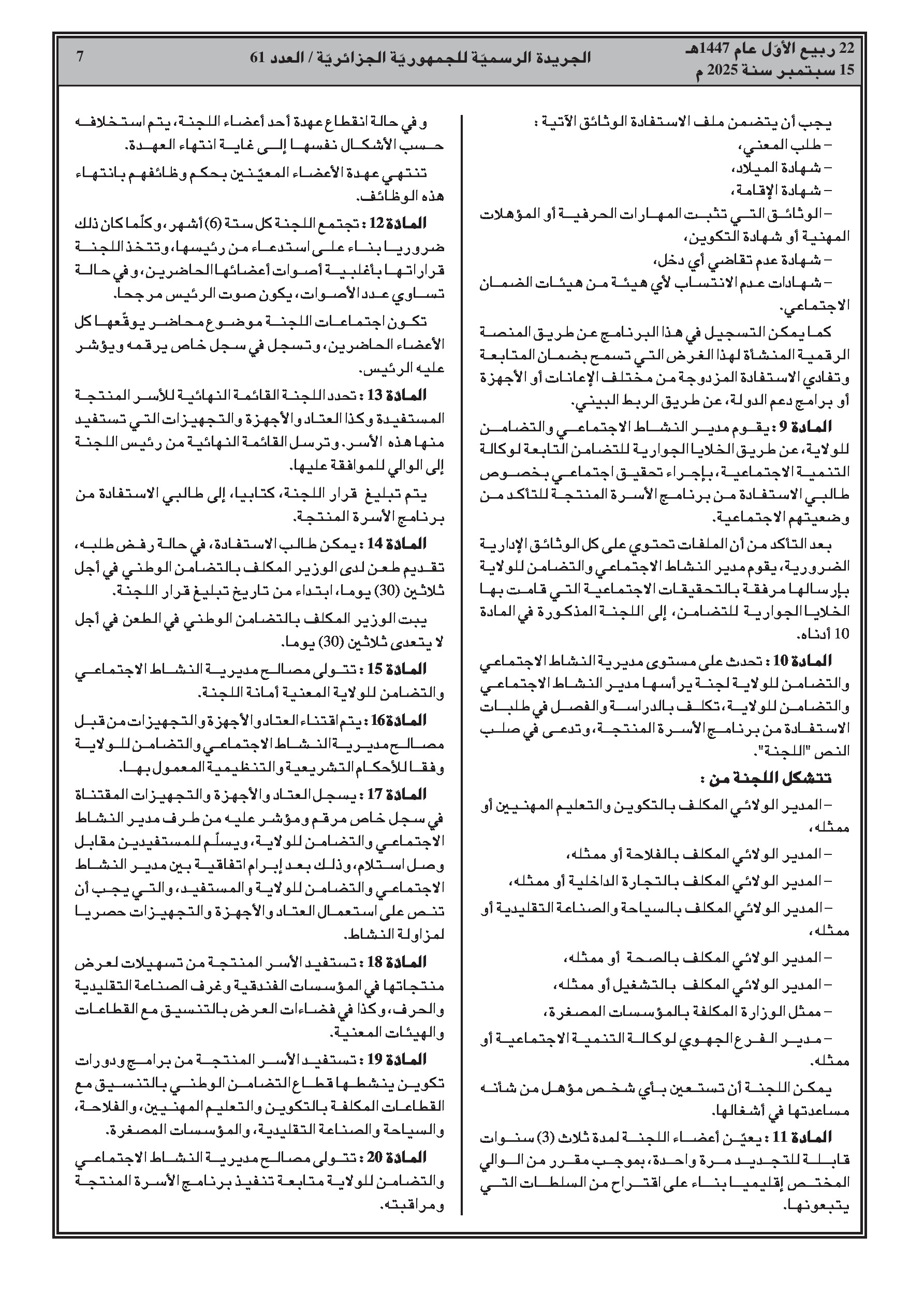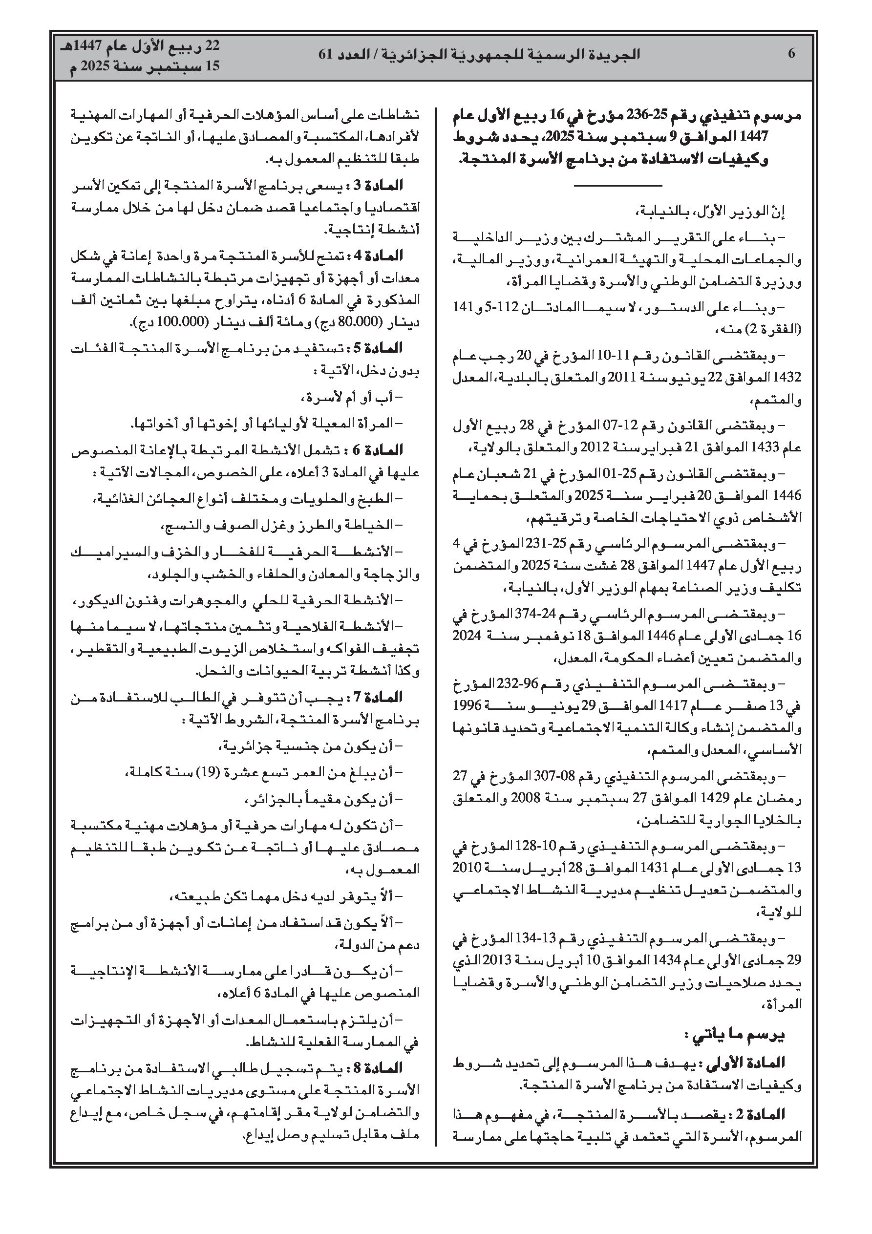 مرسوم تنفيذي يحدد شروط وكيفيات الاستفادة من برنامج 'الأسرة المنتجة' بهدف التمكين الاقتصادي والاجتماعي للأسر التي لا تملك دخلاً عبر دعم أنشطتها الإنتاجية.