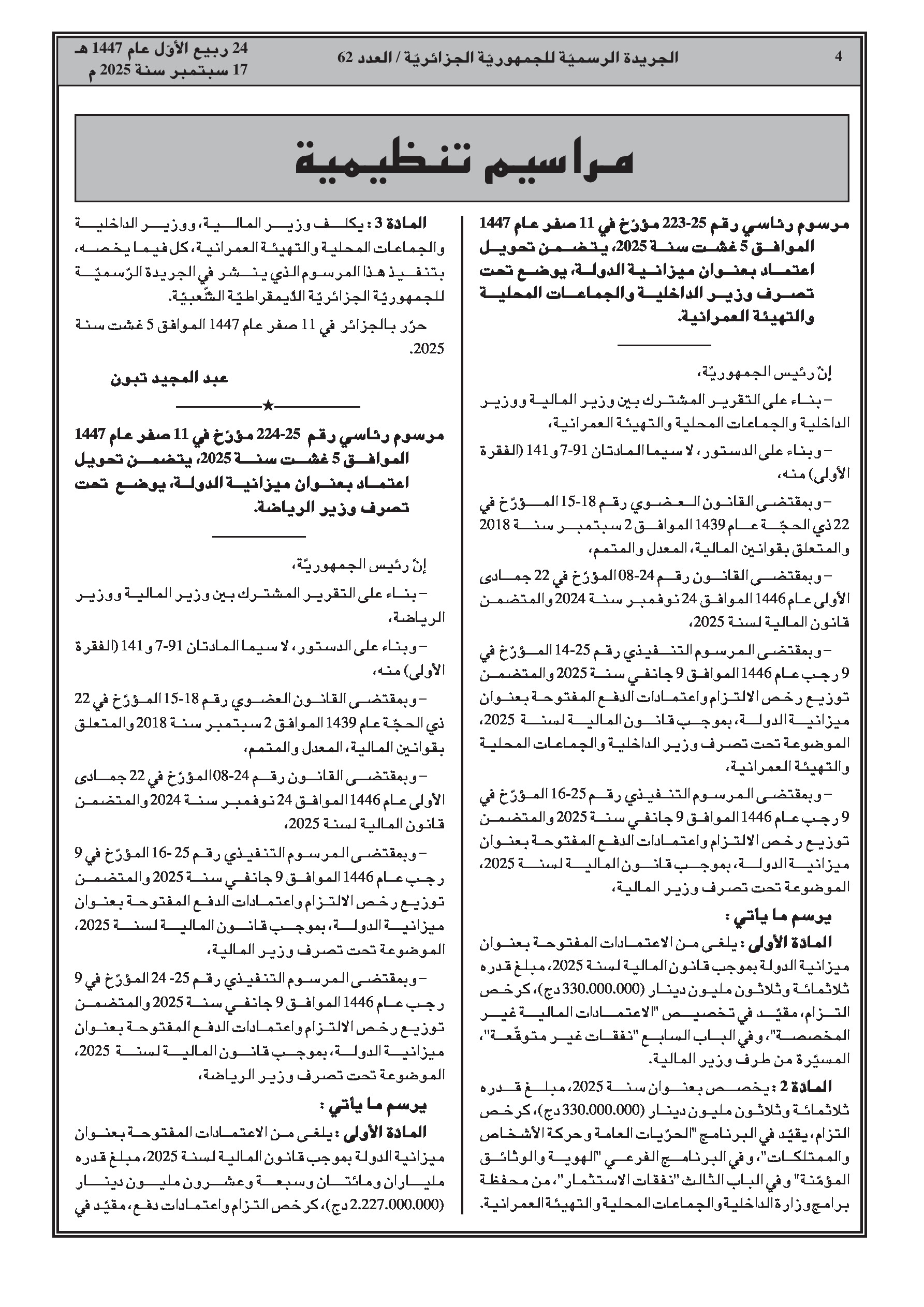 مراسيم رئاسية تقضي بتحويل اعتمادات مالية ضمن ميزانية الدولة لفائدة قطاعي الداخلية والرياضة. كما يصدر مرسوم تنفيذي يسمح لأعضاء الحكومة بتفويض توقيعهم للمسؤولين في إداراتهم المركزية.