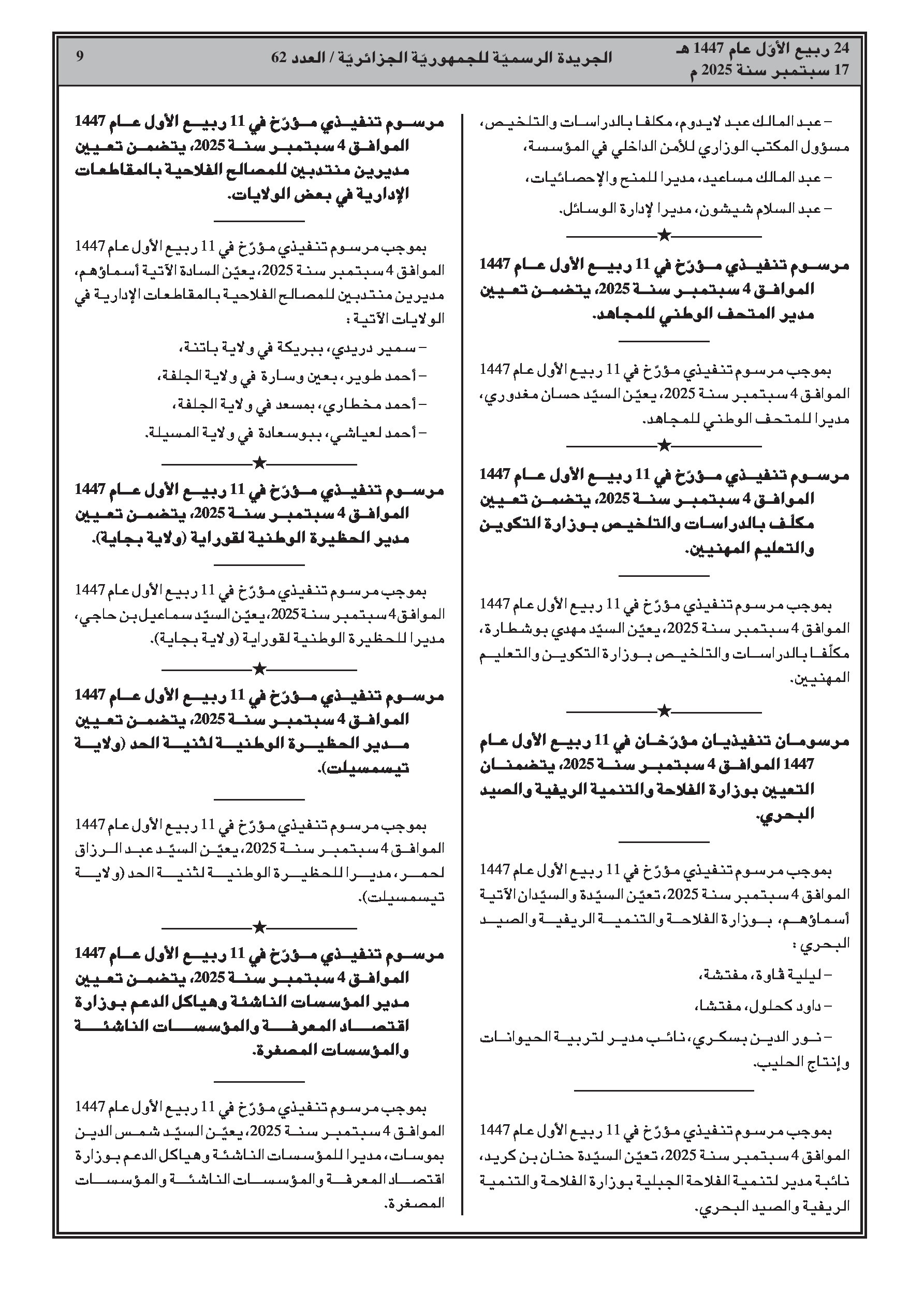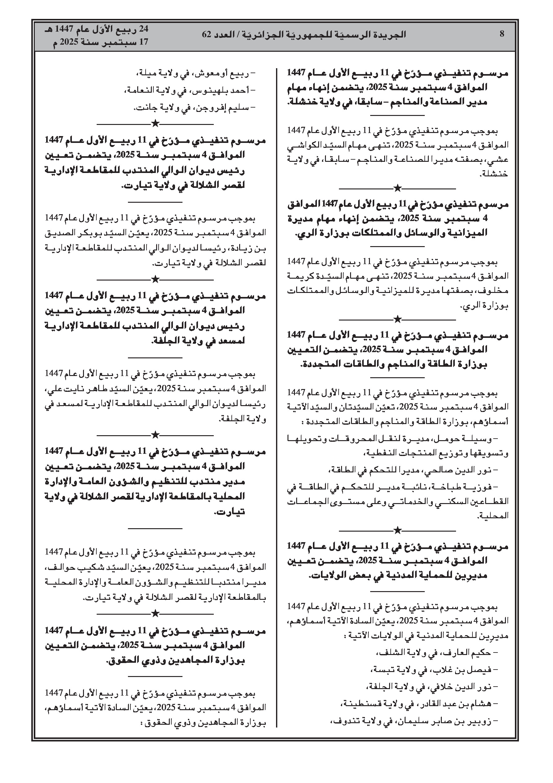 تضمنت الجريدة الرسمية سلسلة من المراسيم التنفيذية المتعلقة بإنهاء مهام وتعيين مسؤولين سامين في عدة قطاعات وزارية وإدارات محلية، بما في ذلك الطاقة والمناجم، المجاهدين، الصناعة، الحماية المدنية، والفلاحة.