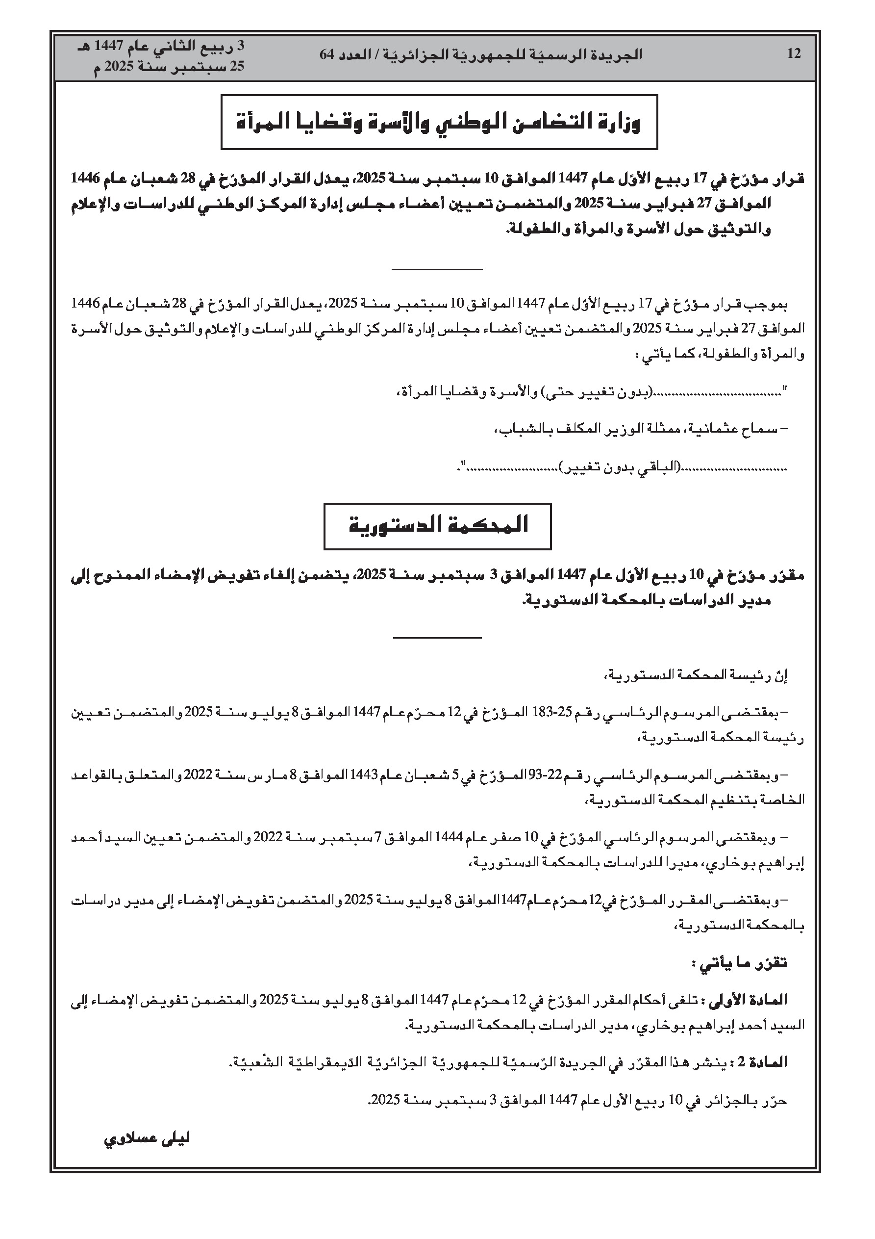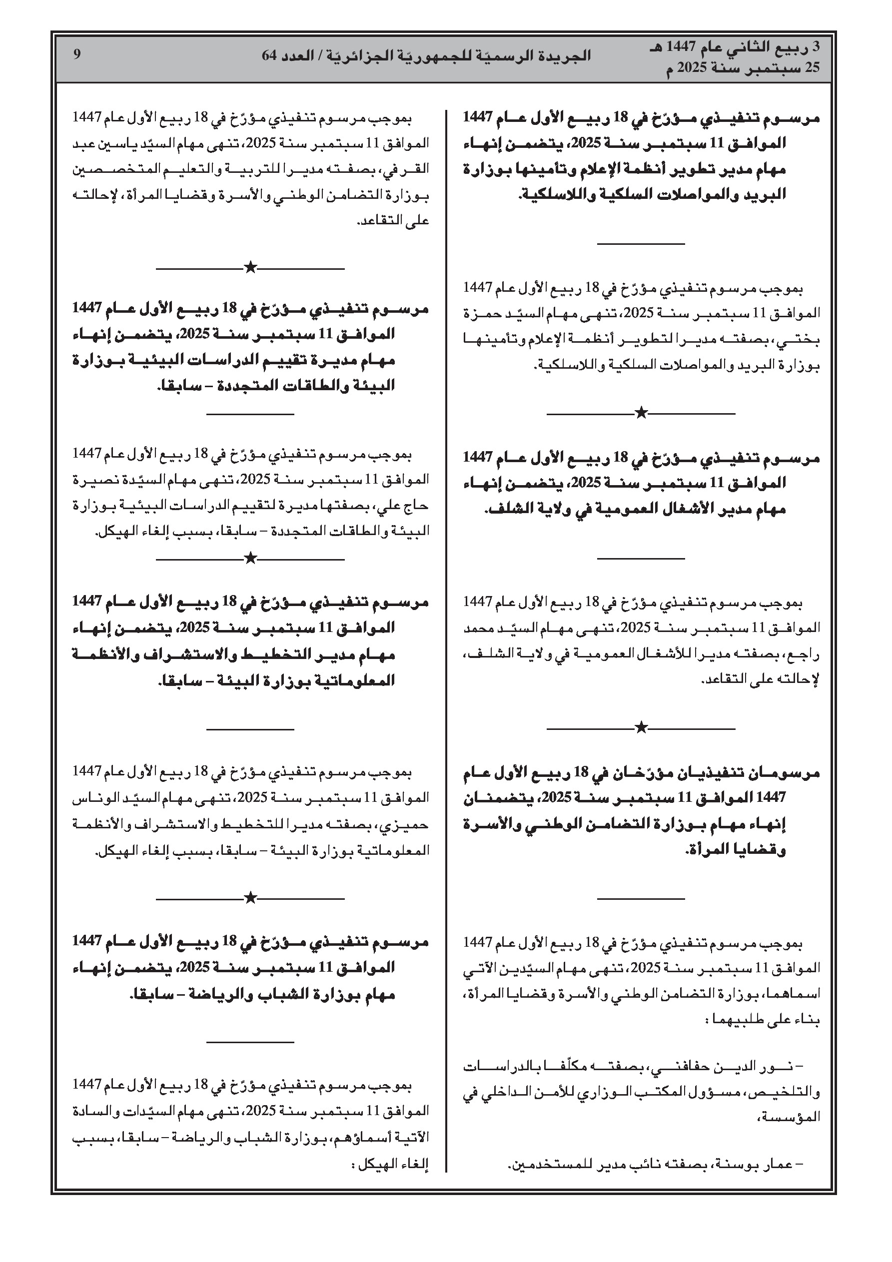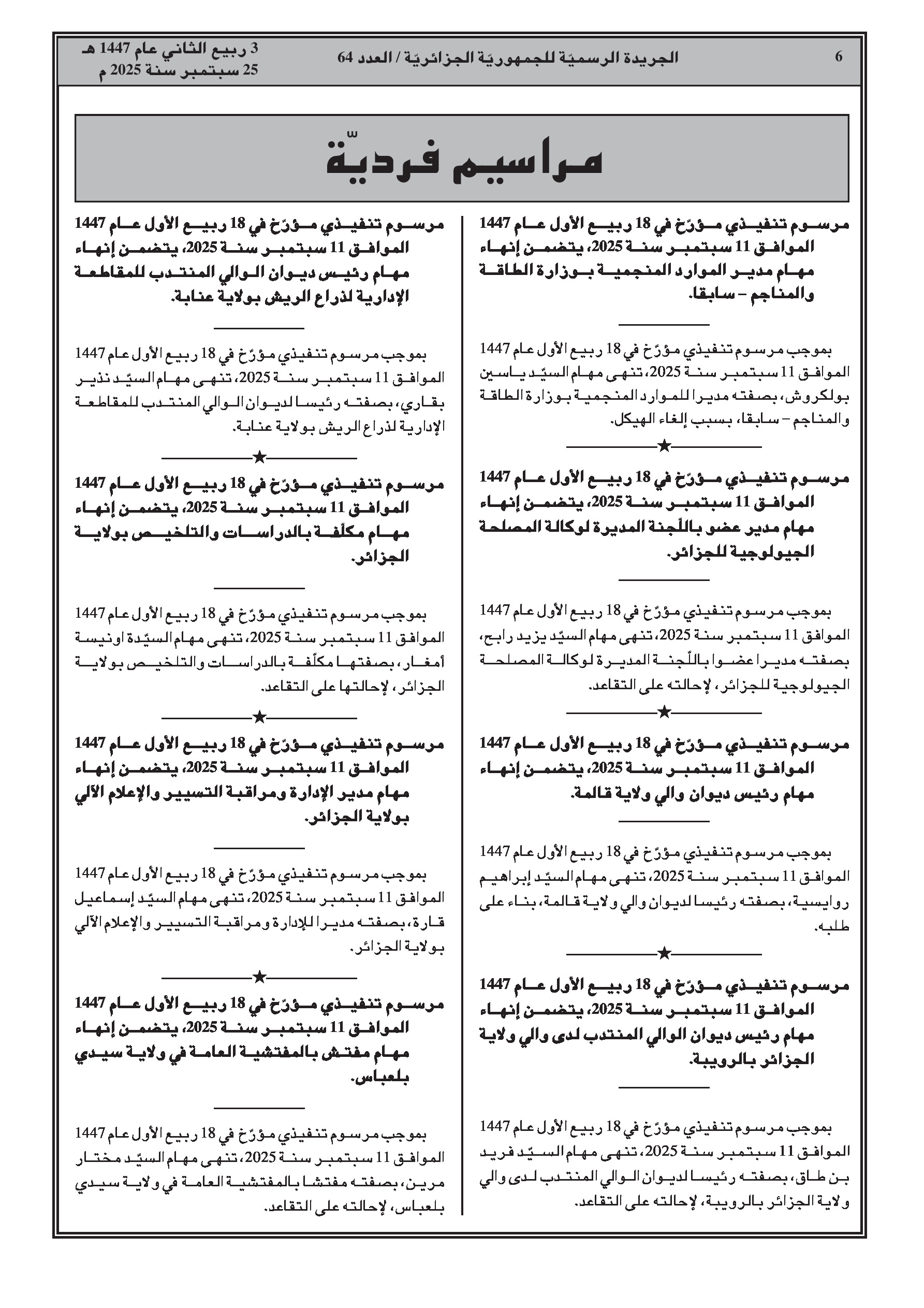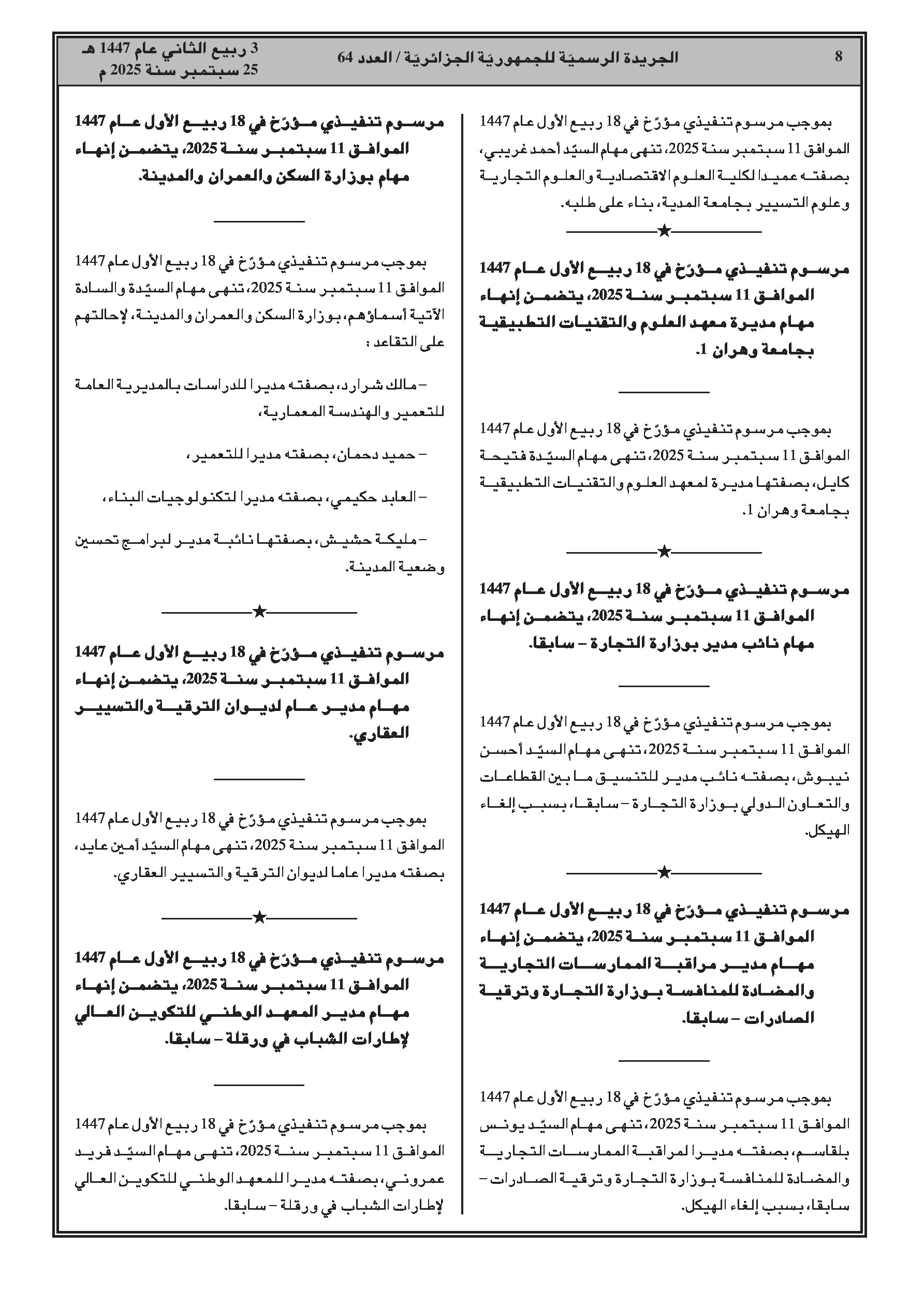 سلسلة من المراسيم التنفيذية تنهي مهام وتعين مسؤولين جدد في مختلف الوزارات، الولايات، الجامعات والهيئات العمومية.