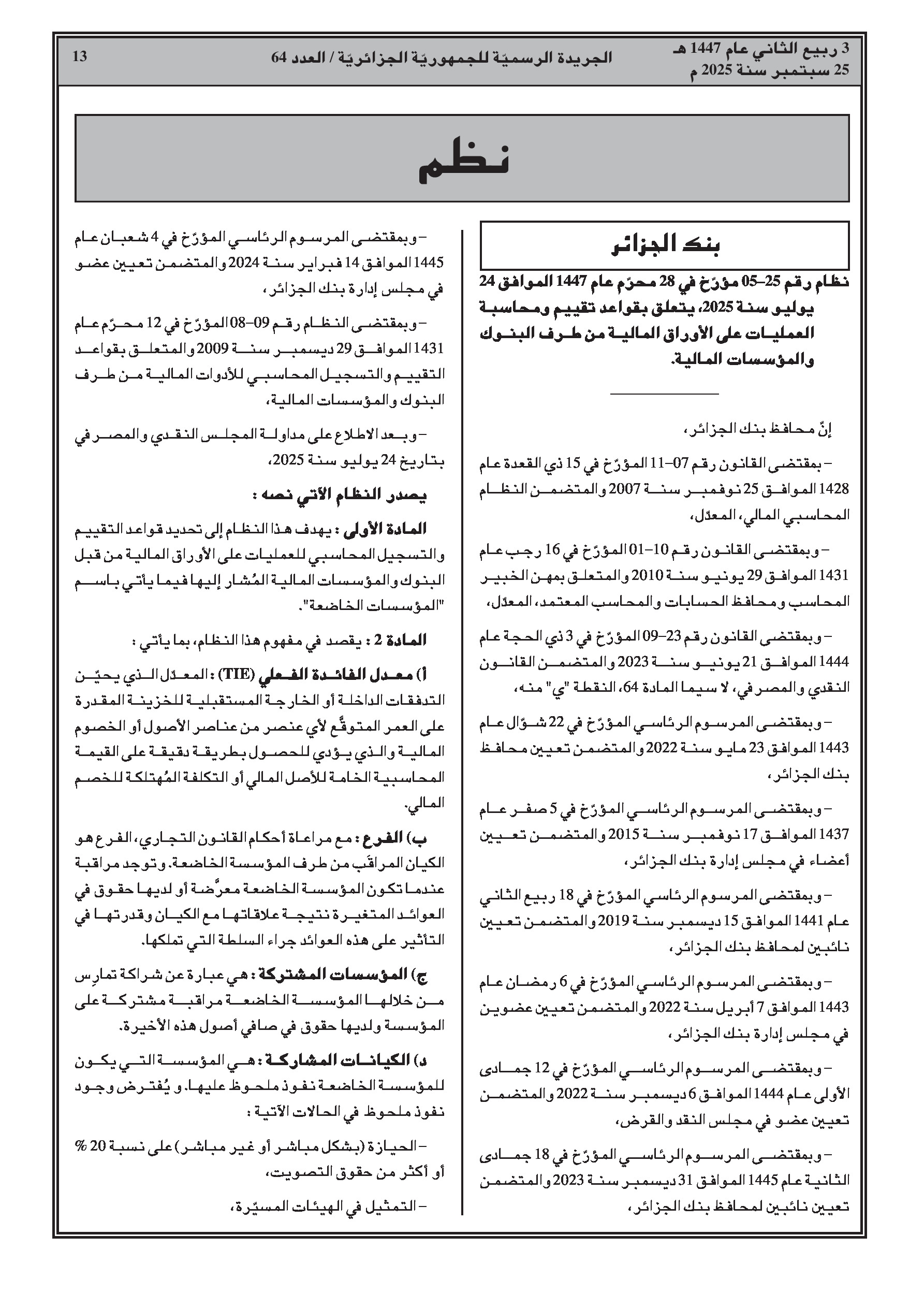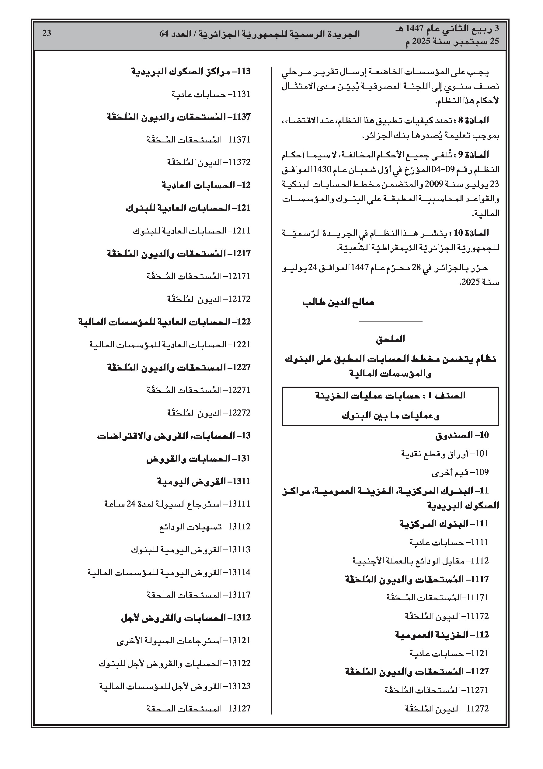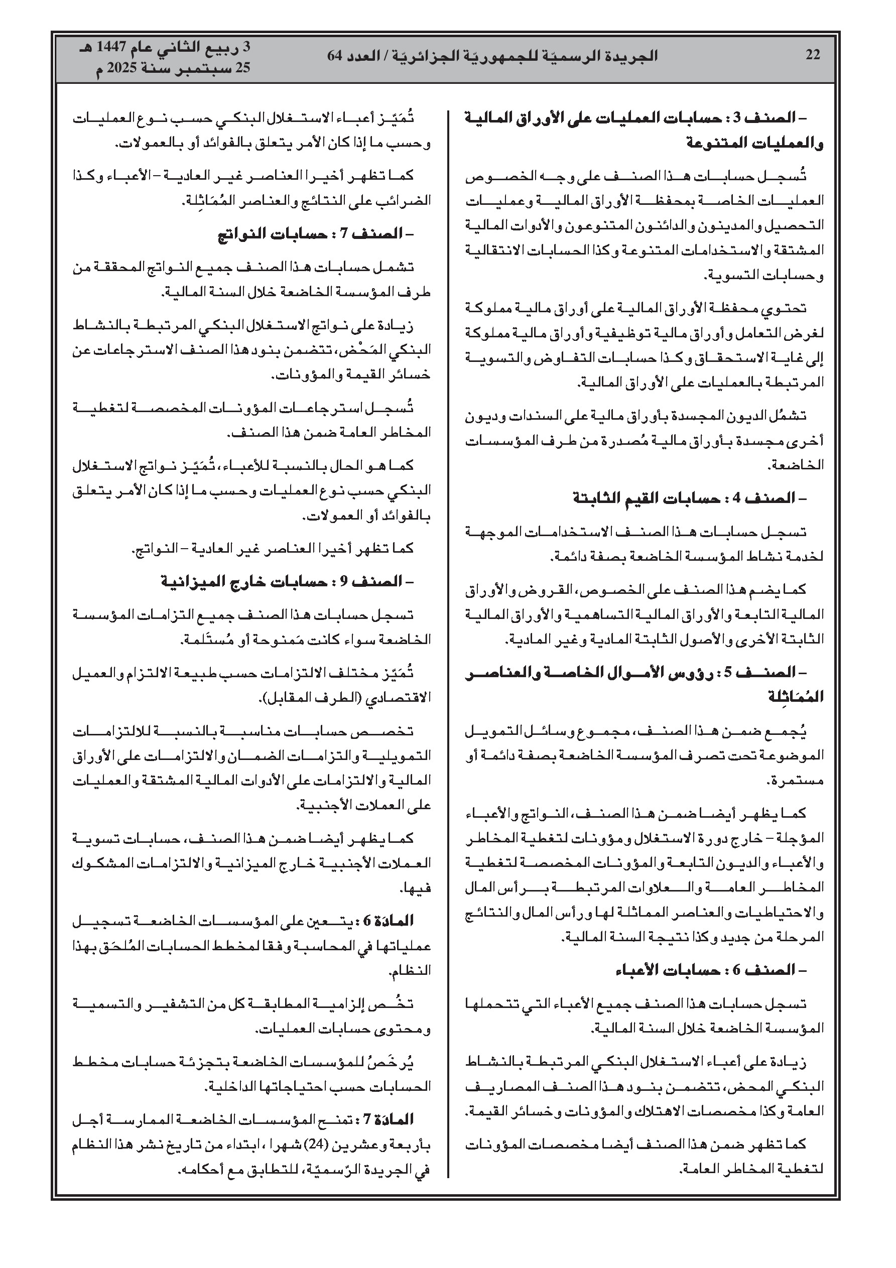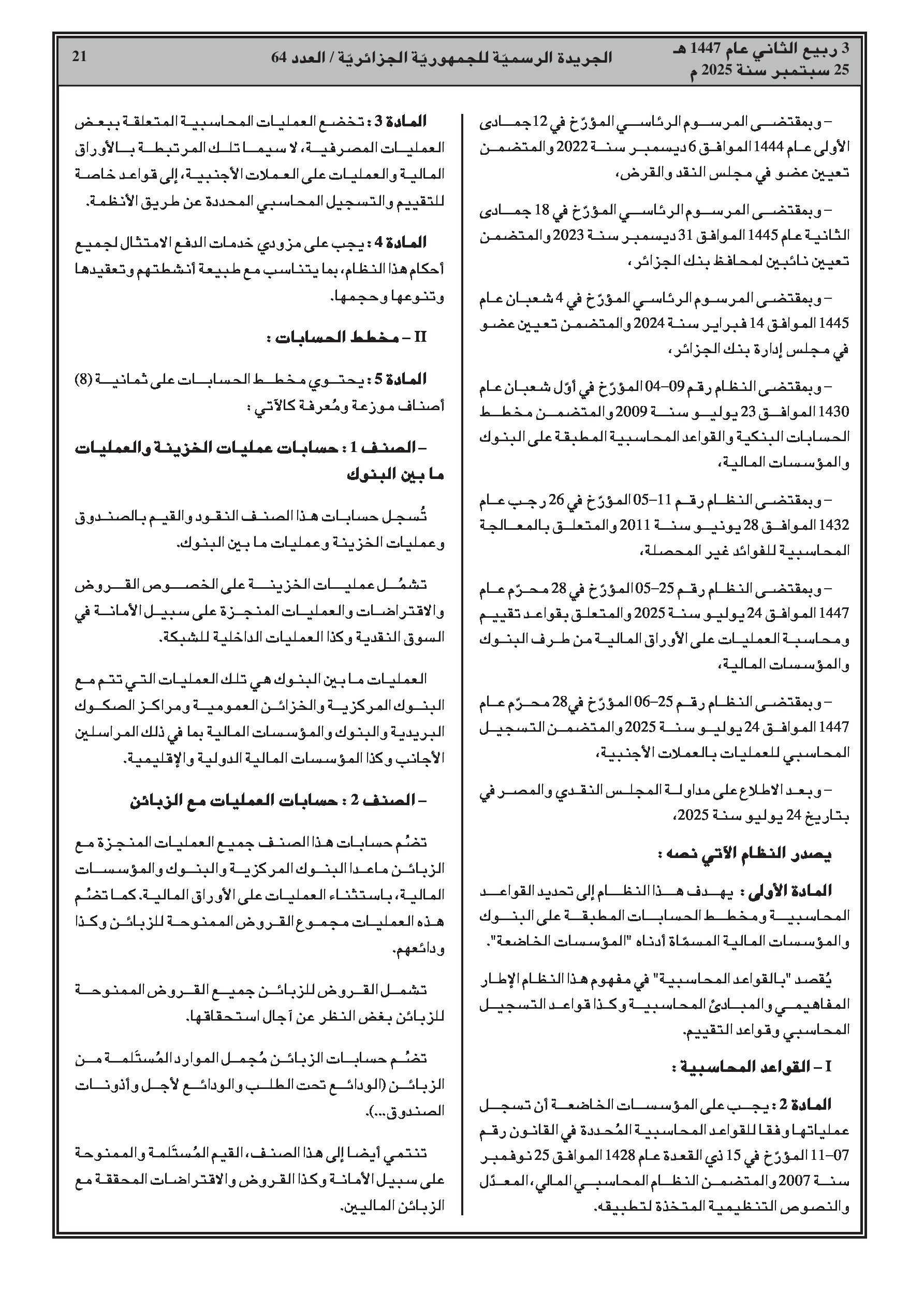 النظام 25-07: يضع مخطط الحسابات الجديد المطبق على البنوك والمؤسسات المالية.