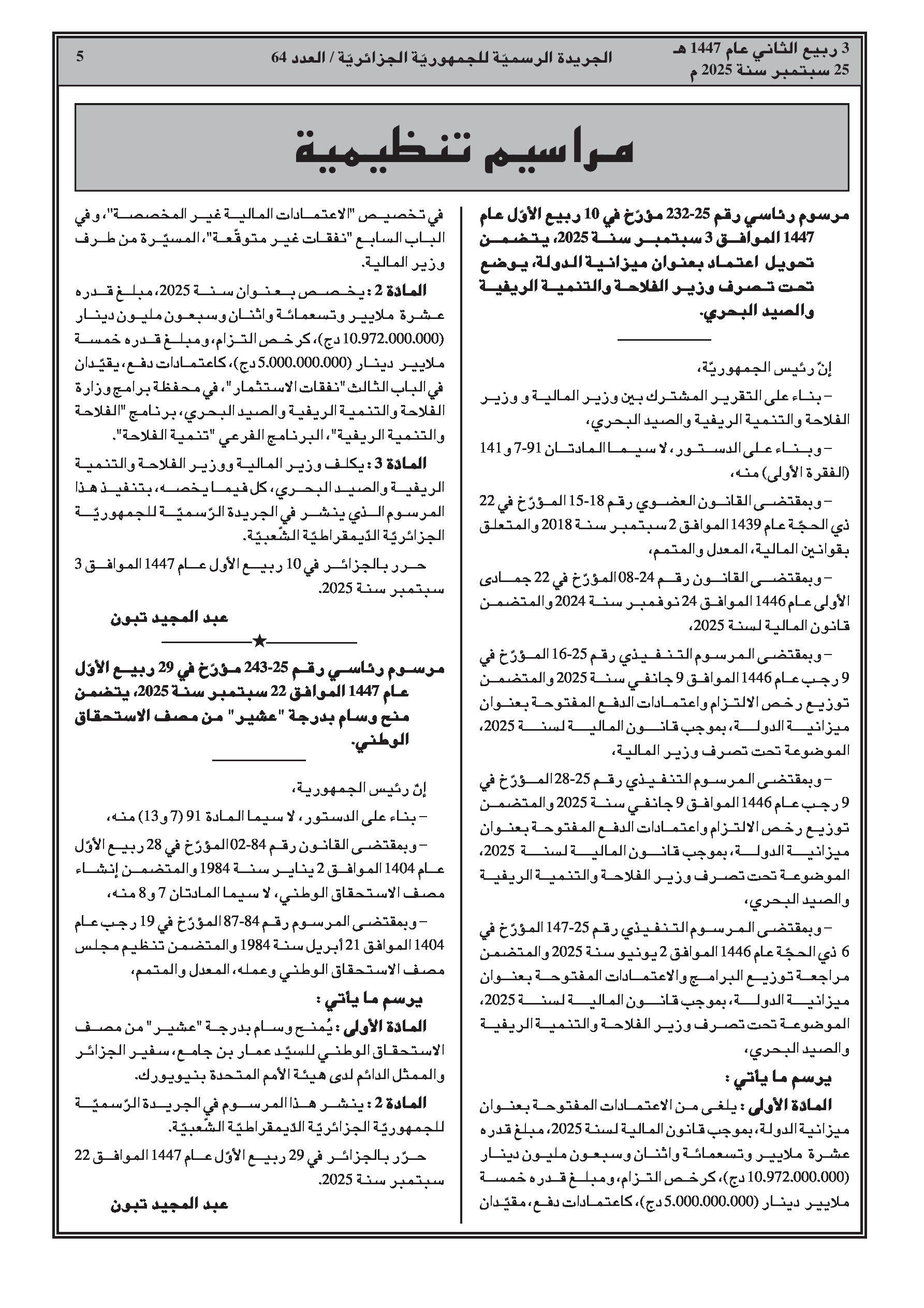 بموجب المرسوم الرئاسي 25-232، تم تحويل 10.97 مليار دينار كرخص التزام و 5 مليارات دينار كاعتمادات دفع من 'النفقات غير المخصصة' إلى برنامج 'تنمية الفلاحة'.