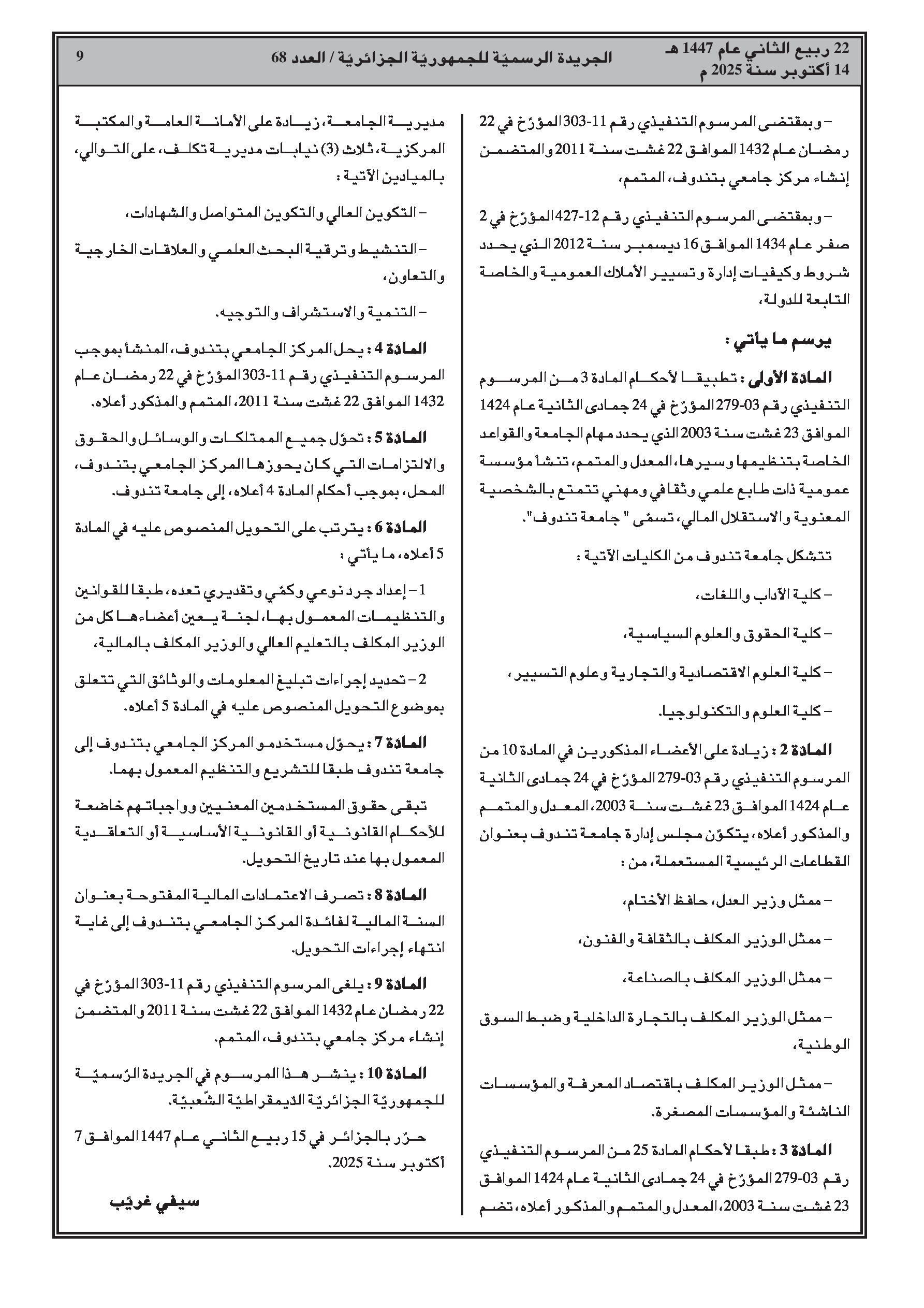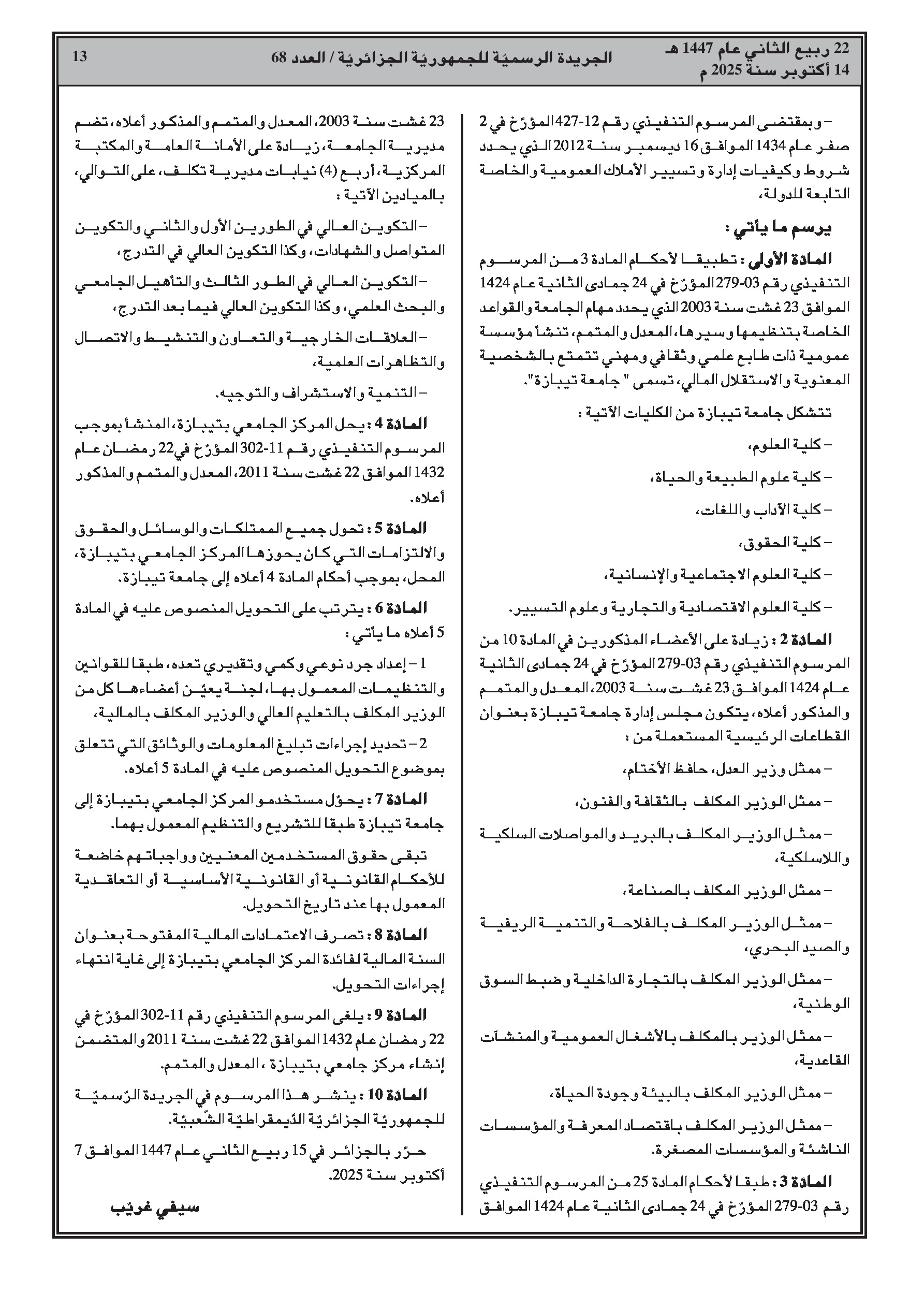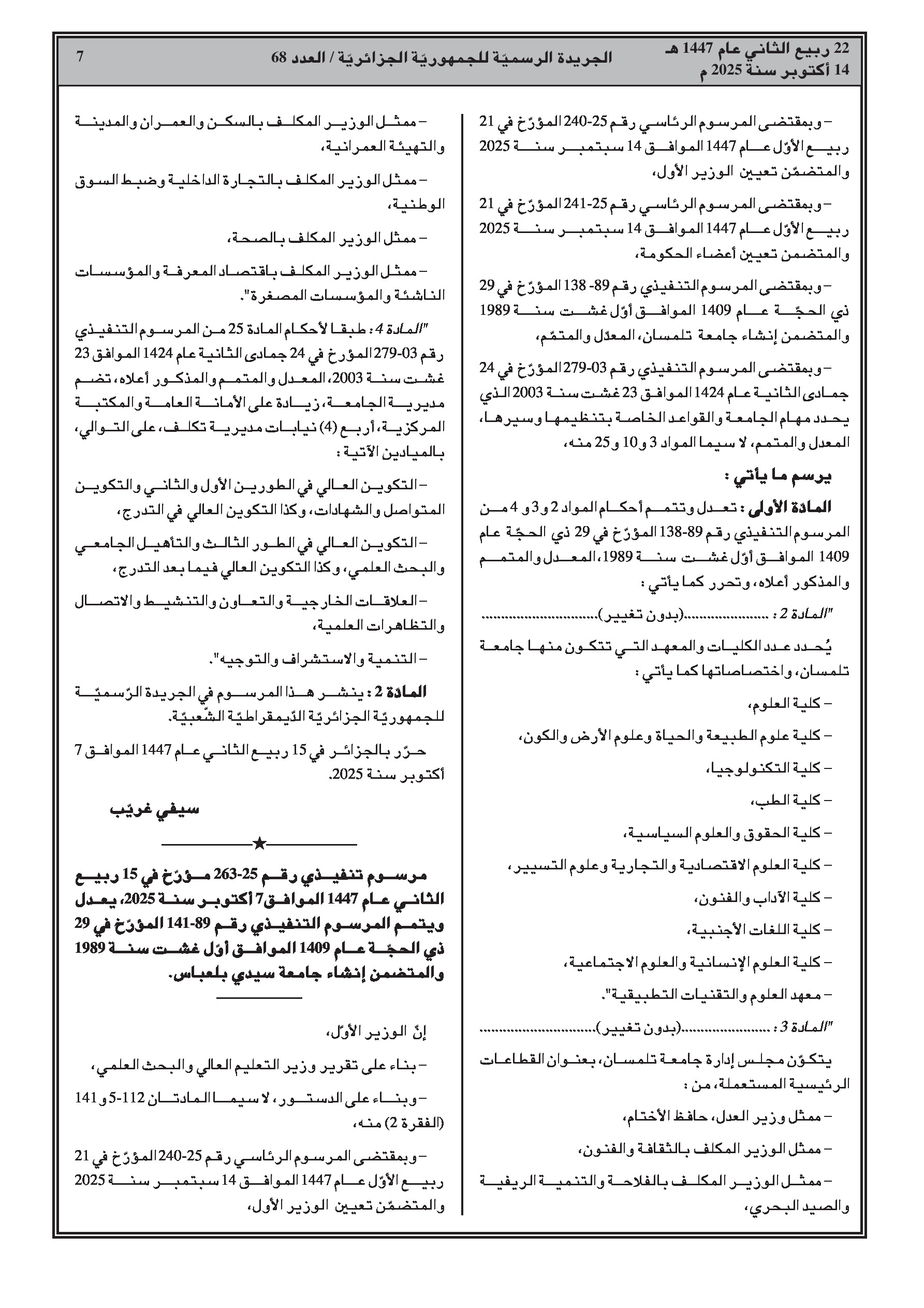 - تعديل وتتميم المراسيم المتعلقة بإنشاء جامعتي تلمسان وسيدي بلعباس، مع إعادة تحديد عدد الكليات والمعاهد المكونة لهما.