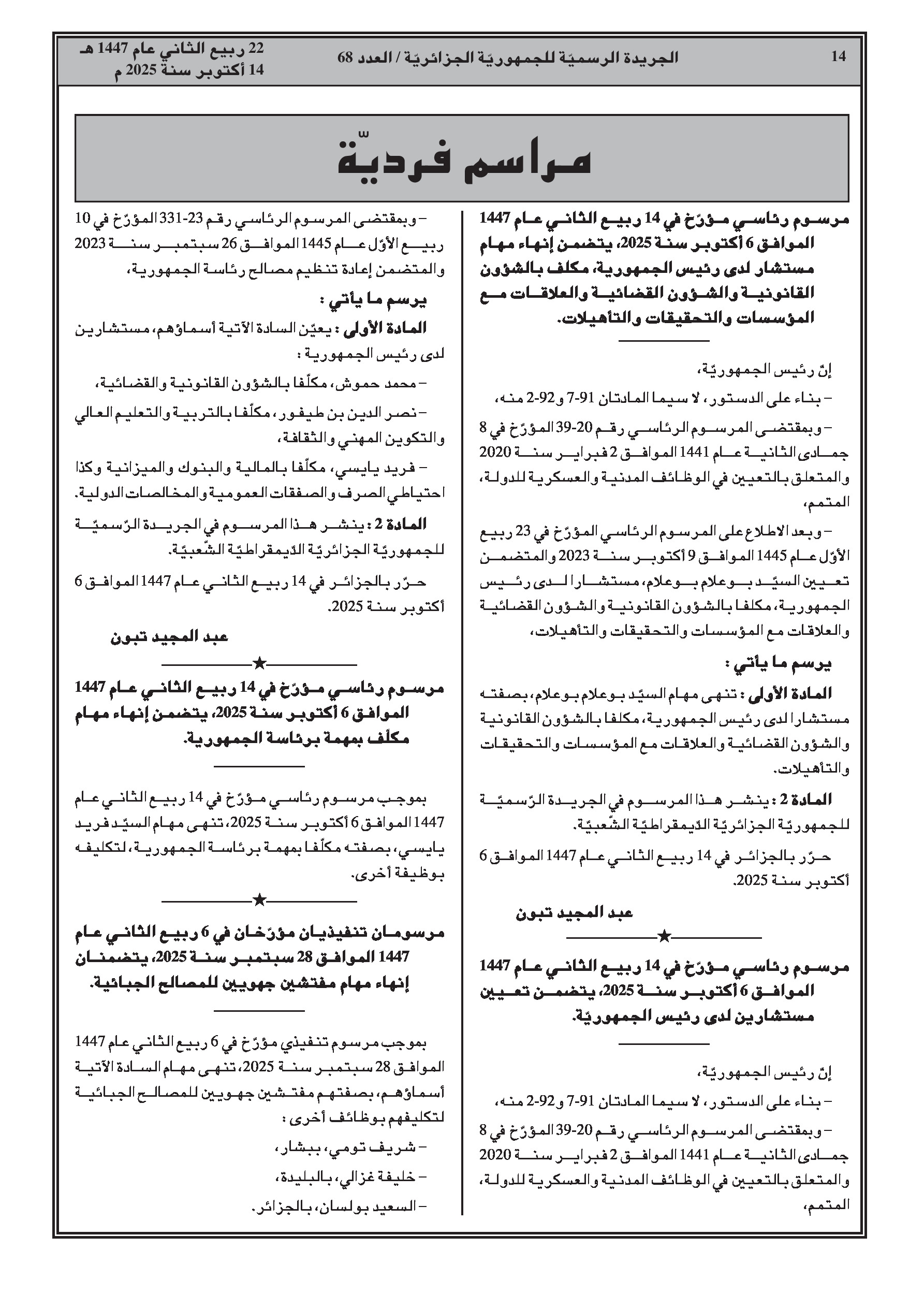 - تم تعيين مستشارين جدد لدى رئيس الجمهورية في الشؤون القانونية والمالية والتربوية.