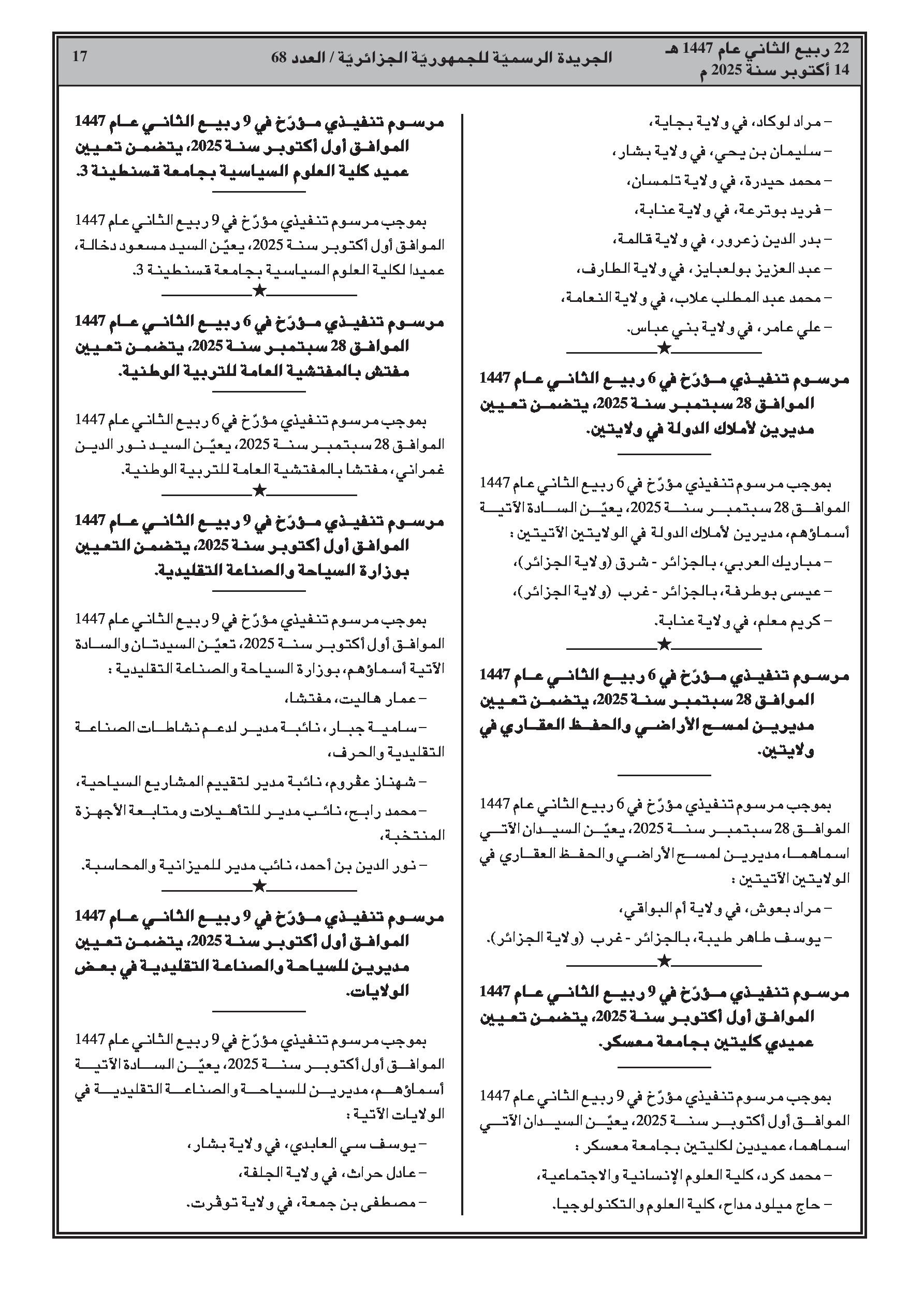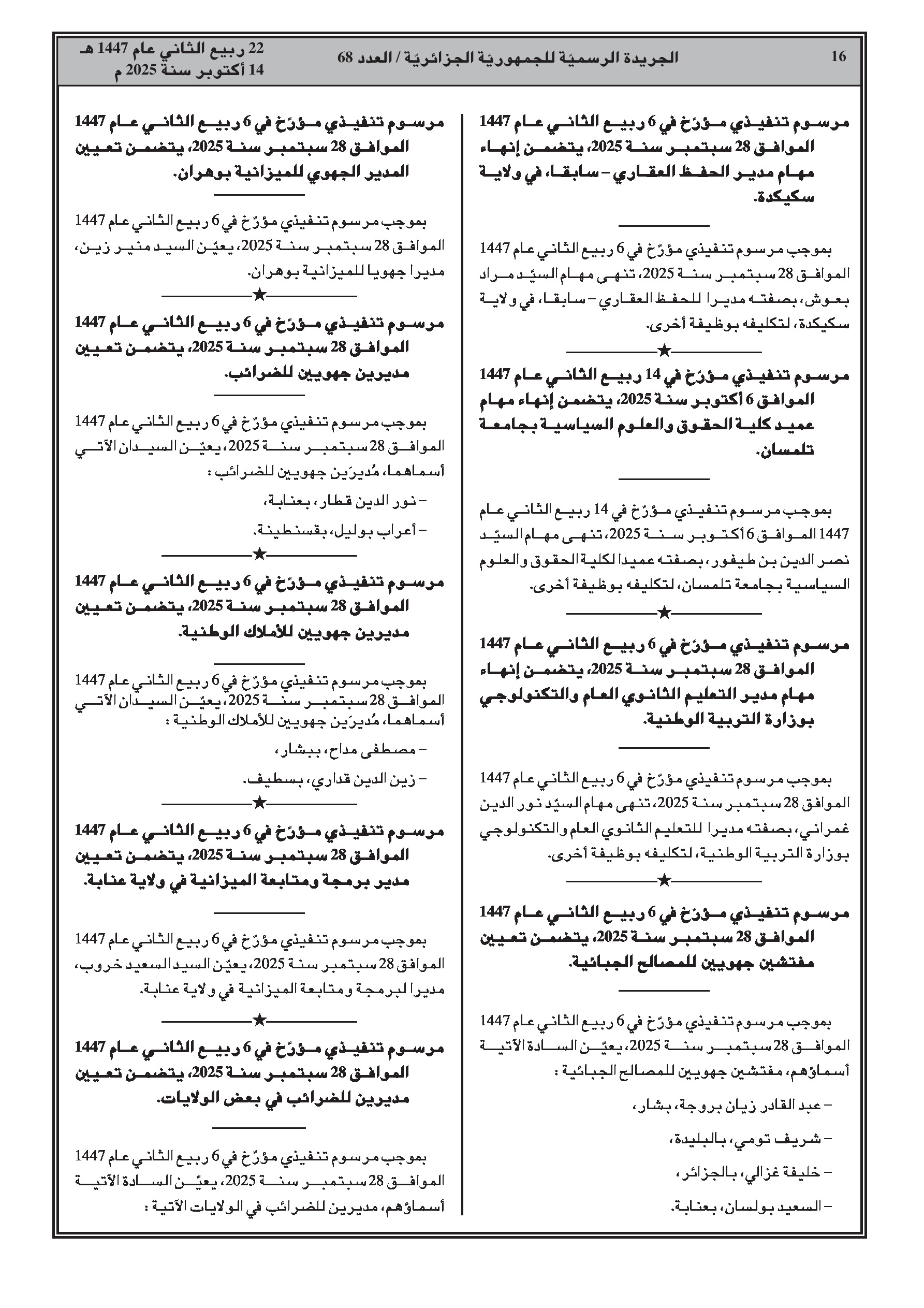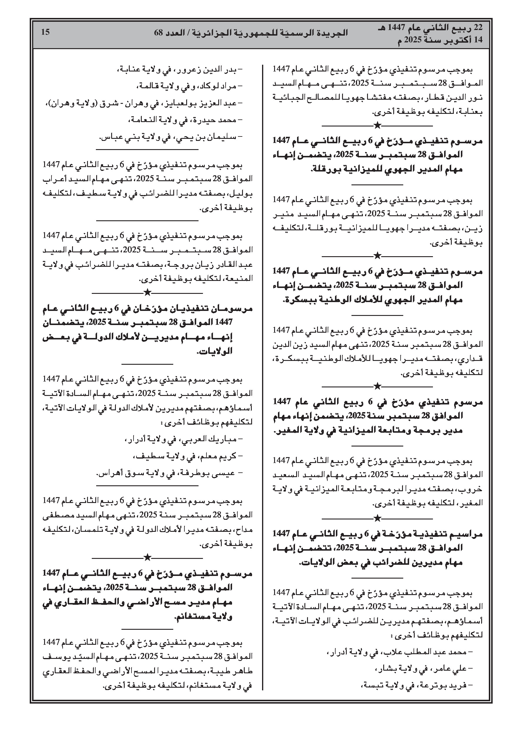 - حركة واسعة في مناصب المديرين الجهويين والولائيين للمالية والضرائب وأملاك الدولة عبر عدة ولايات.