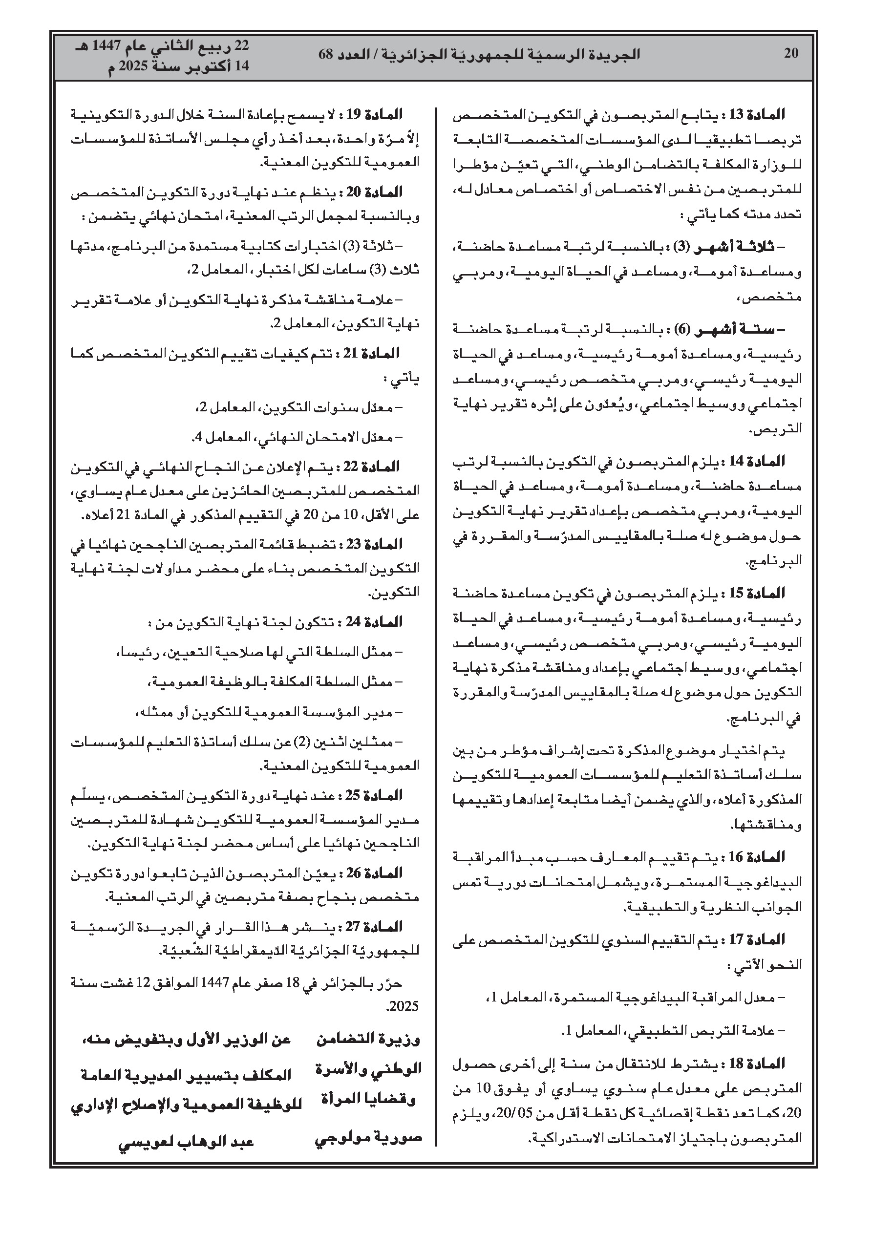- تحديد شروط وتنظيم التكوين المتخصص للالتحاق ببعض الرتب الخاصة بإدارة التضامن الوطني.