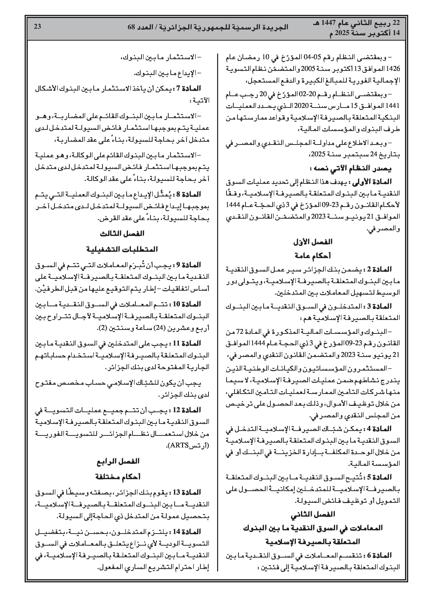 - نظام رقم 25-13: يحدد عمليات السوق النقدية الإسلامية بين البنوك، بما في ذلك الاستثمار بصيغتي المضاربة والوكالة والإيداع بصيغة القرض.