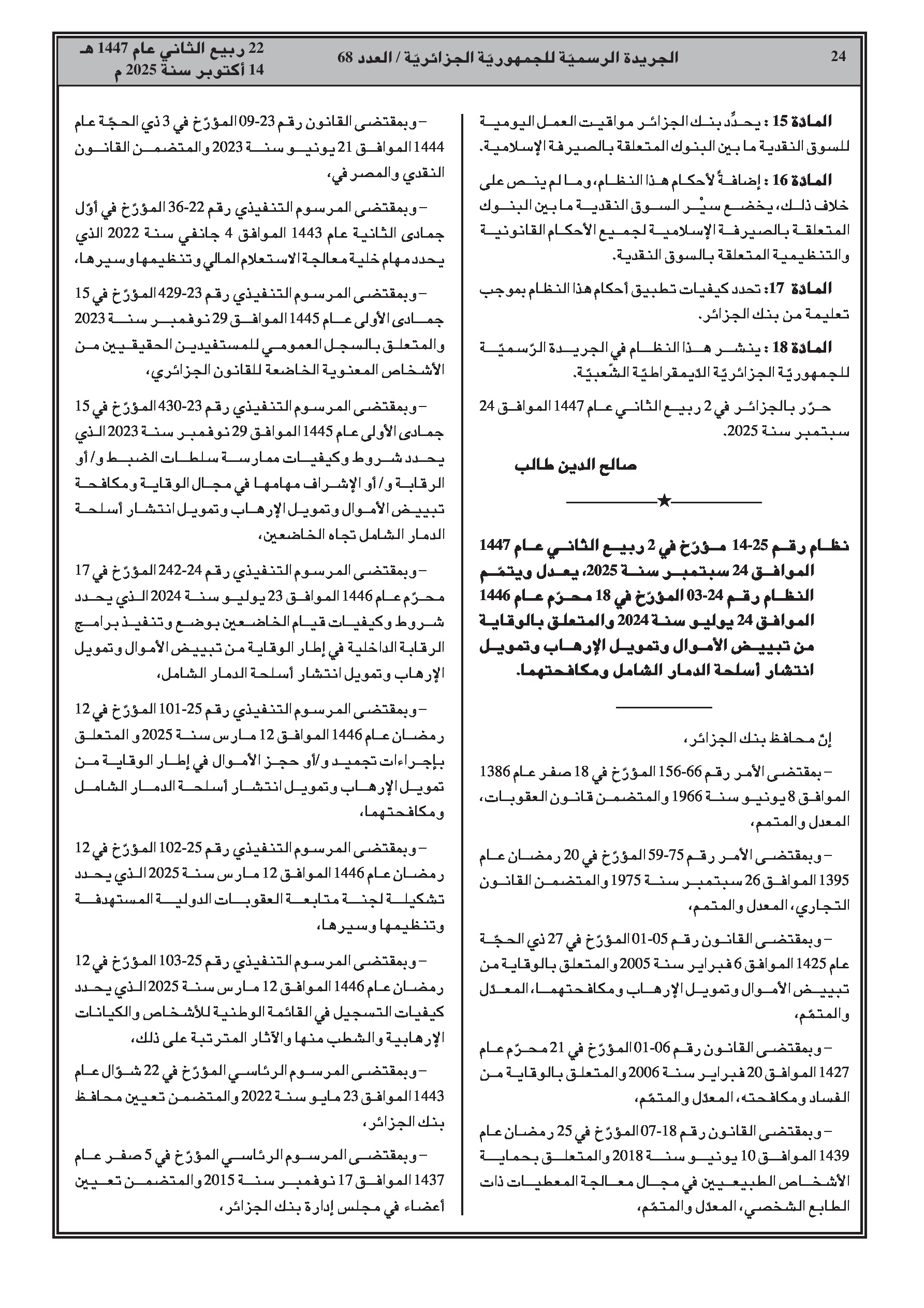 أصدر بنك الجزائر نظامين رئيسيين: الأول يؤسس سوقًا نقدية بين البنوك خاصة بالتمويل الإسلامي، والثاني يعدل ويكمل الإطار القانوني لمكافحة تبييض الأموال وتمويل الإرهاب.