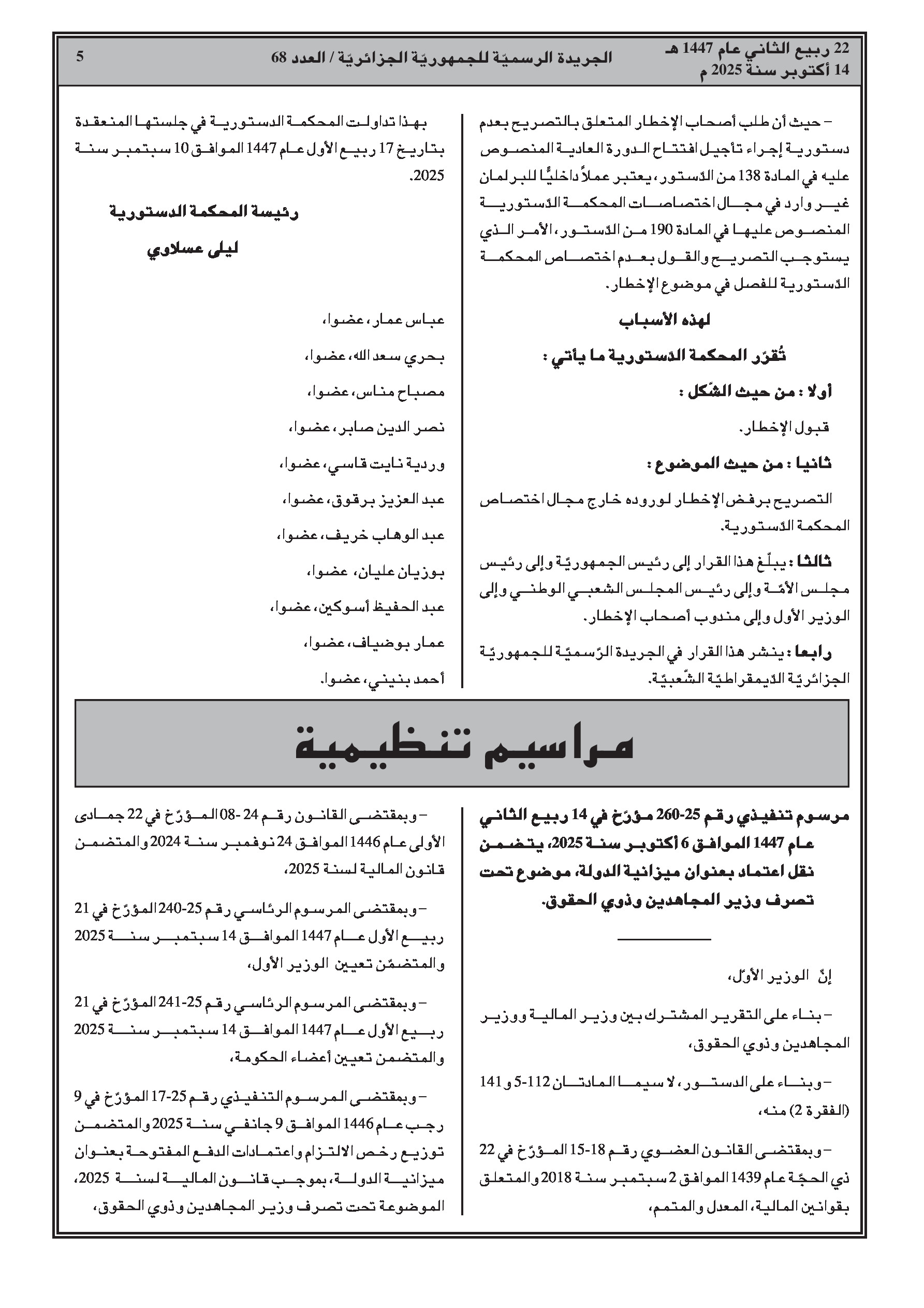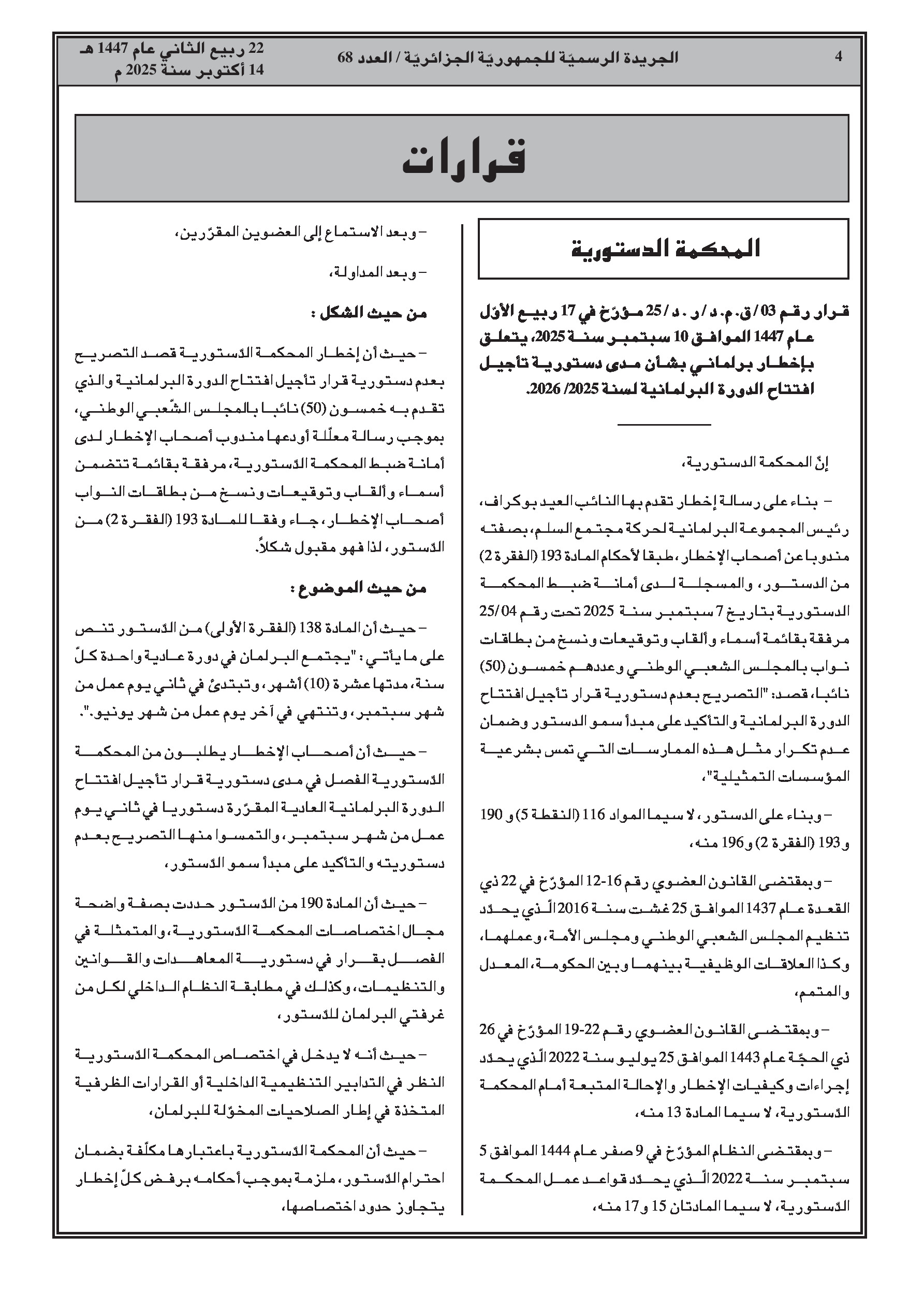 - قرار رقم 03/ق.د.م/م.د/25: ردت المحكمة إخطارًا من 50 نائبًا لعدم الاختصاص.