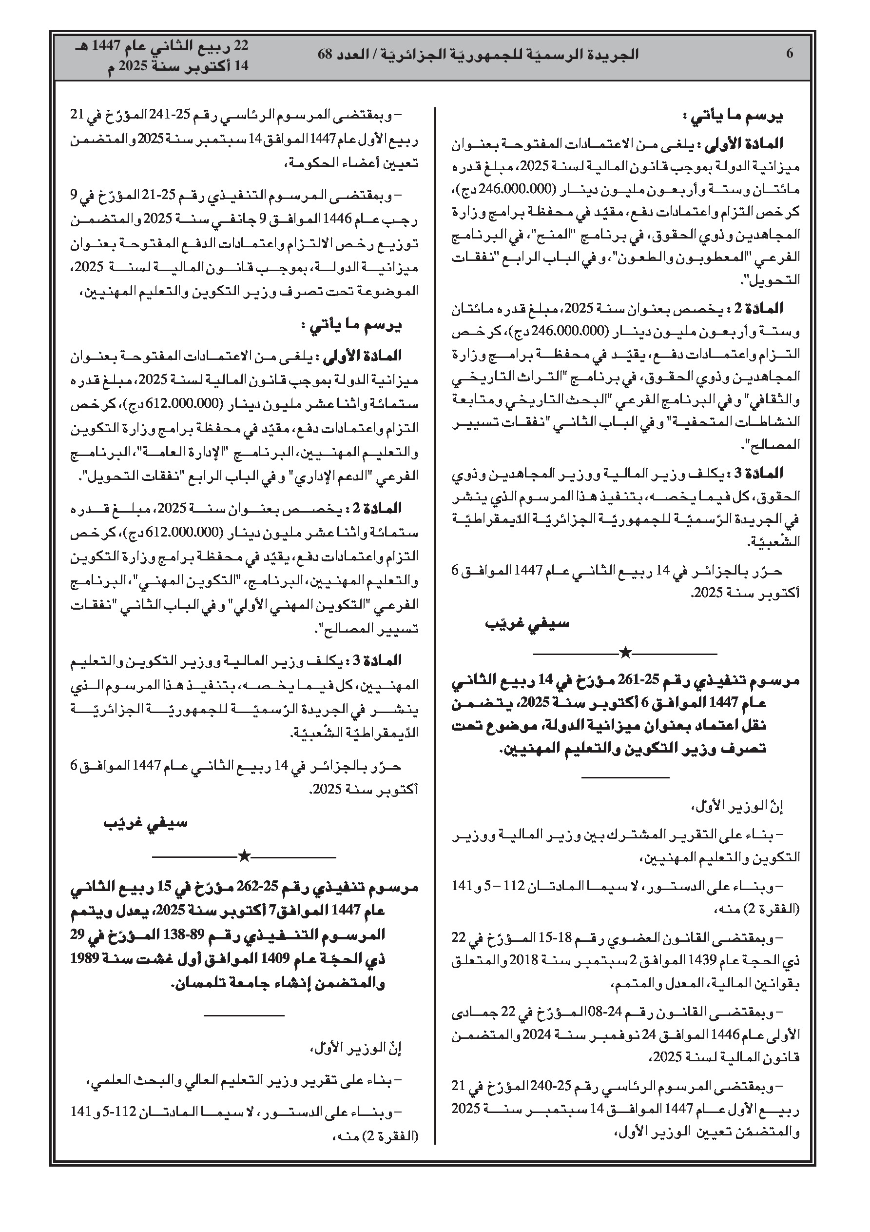 - تحويل اعتمادات بقيمة 246 مليون دينار لوزارة المجاهدين و612 مليون دينار لوزارة التكوين المهني.