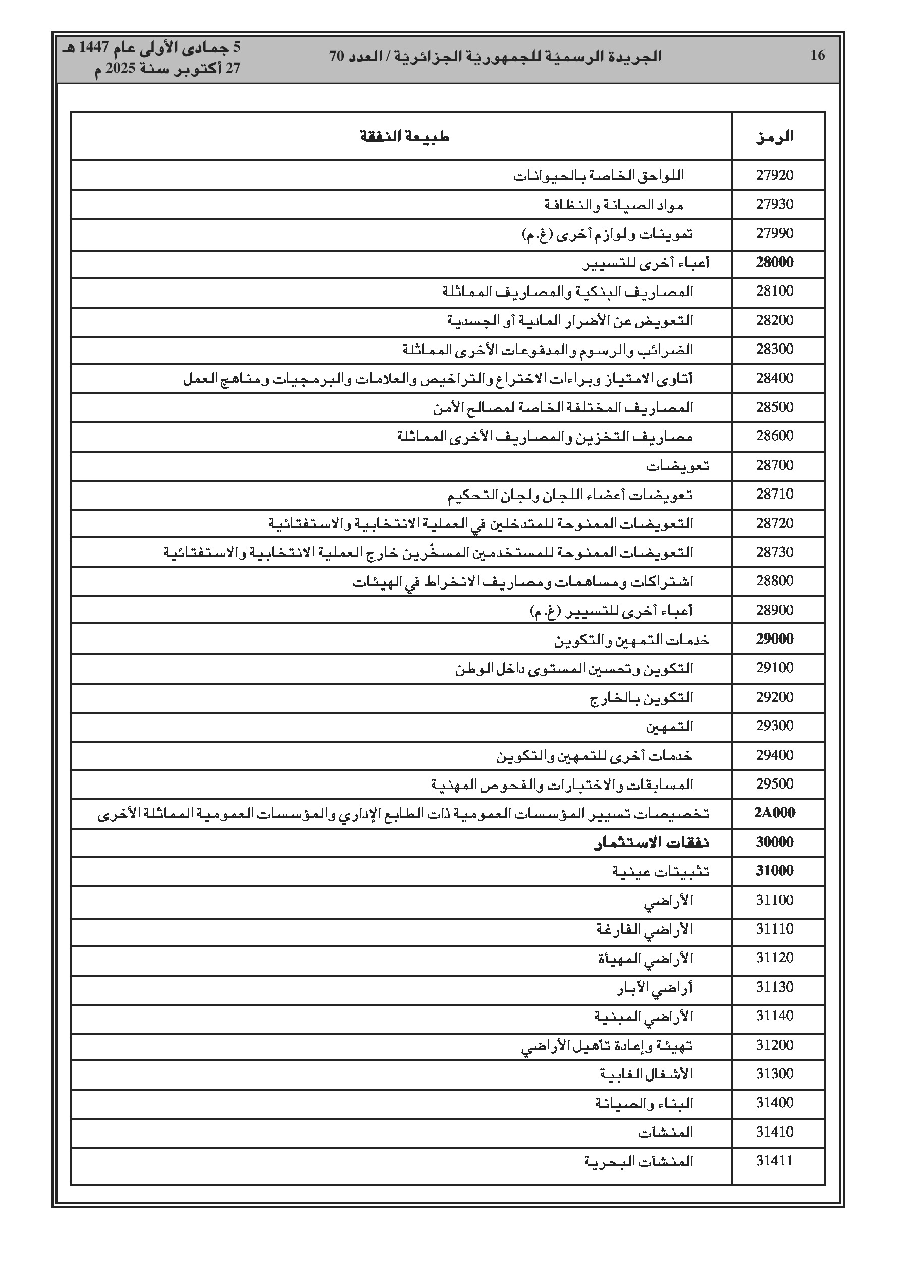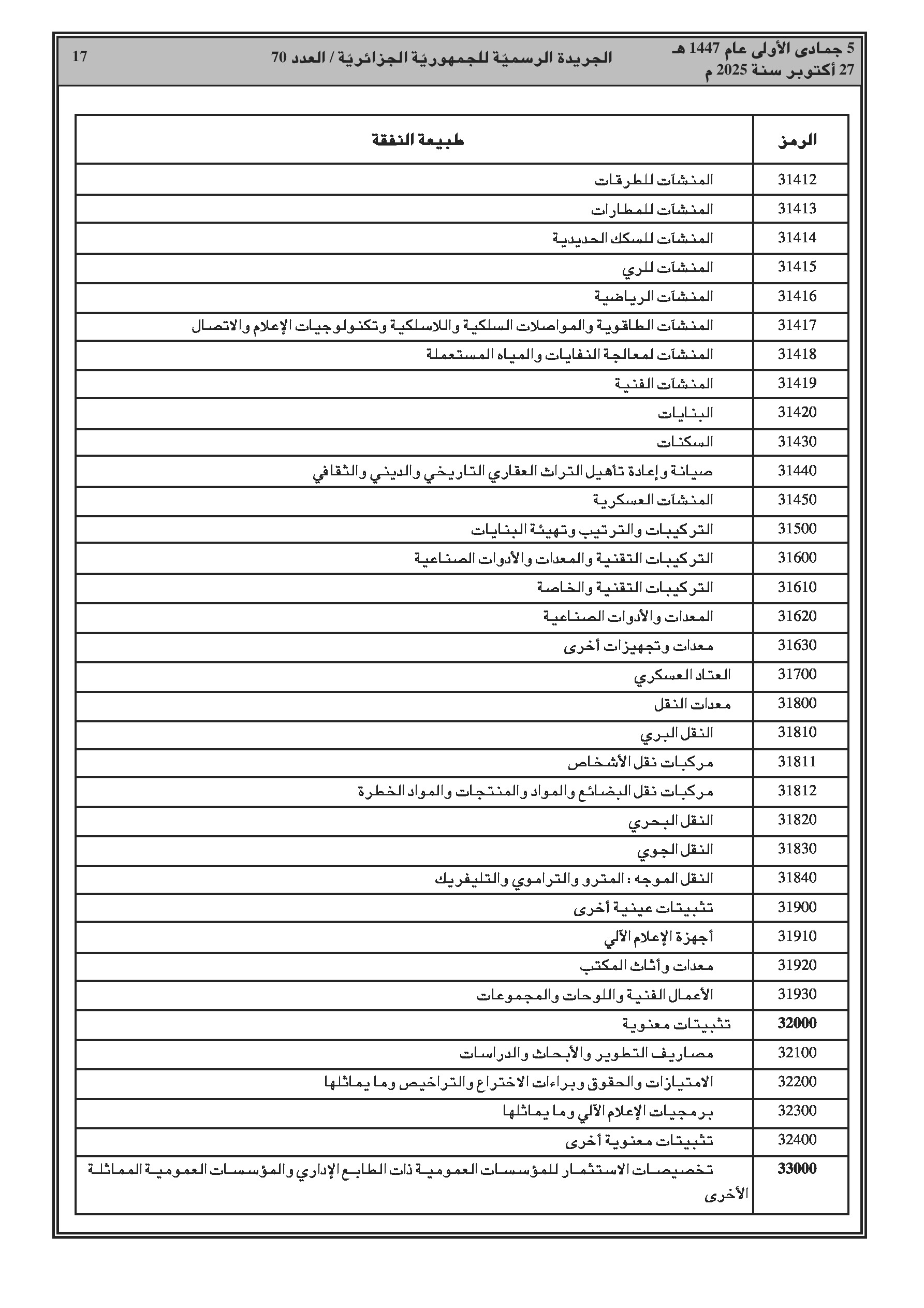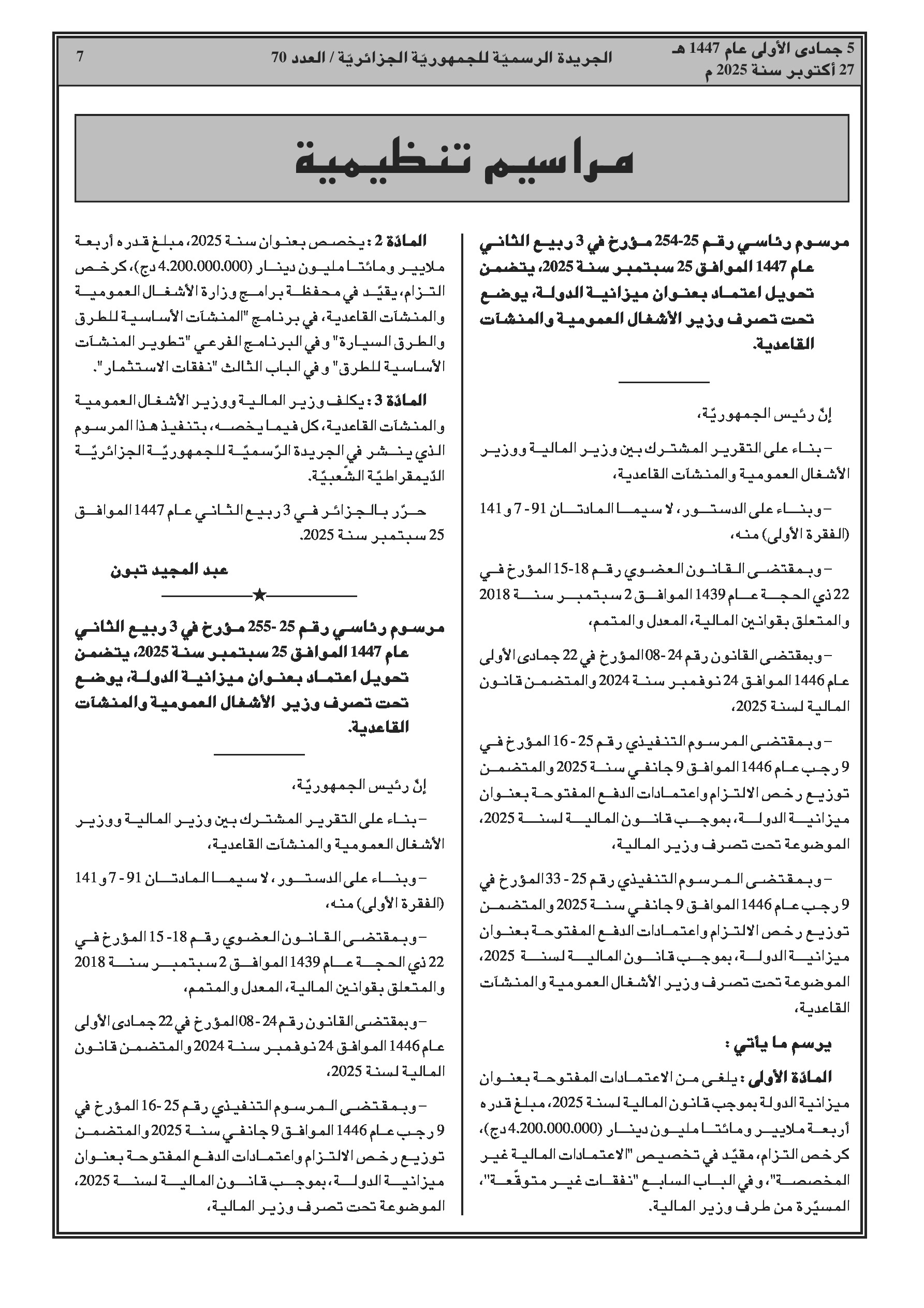 مراسم رئاسية تجيز تحويل اعتمادات لتمويل مشاريع البنية التحتية للطرق والسكك الحديدية. وقرار وزاري أساسي من وزارة المالية يفصل التصنيف الاقتصادي الجديد وترميز نفقات ميزانية الدولة.
