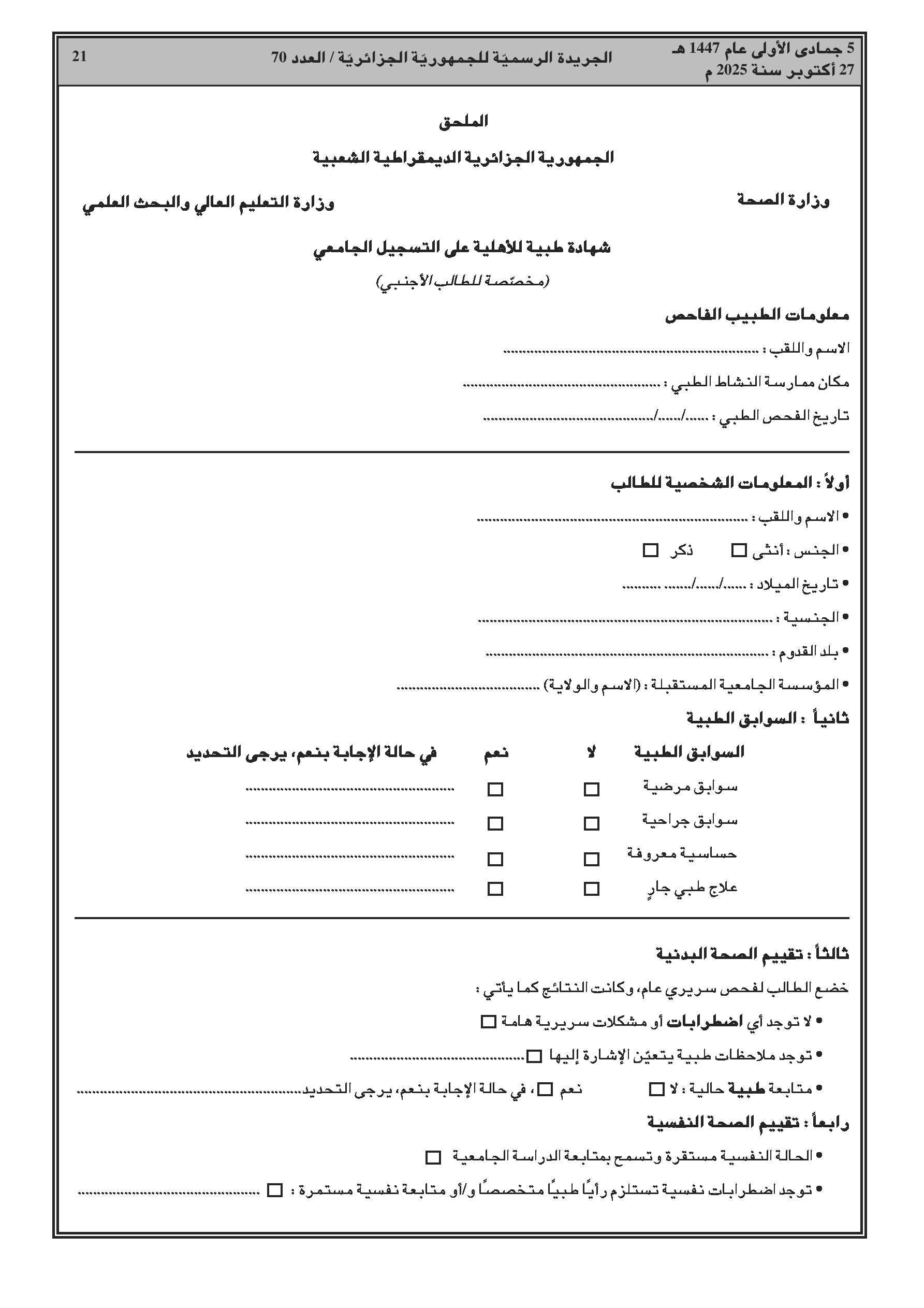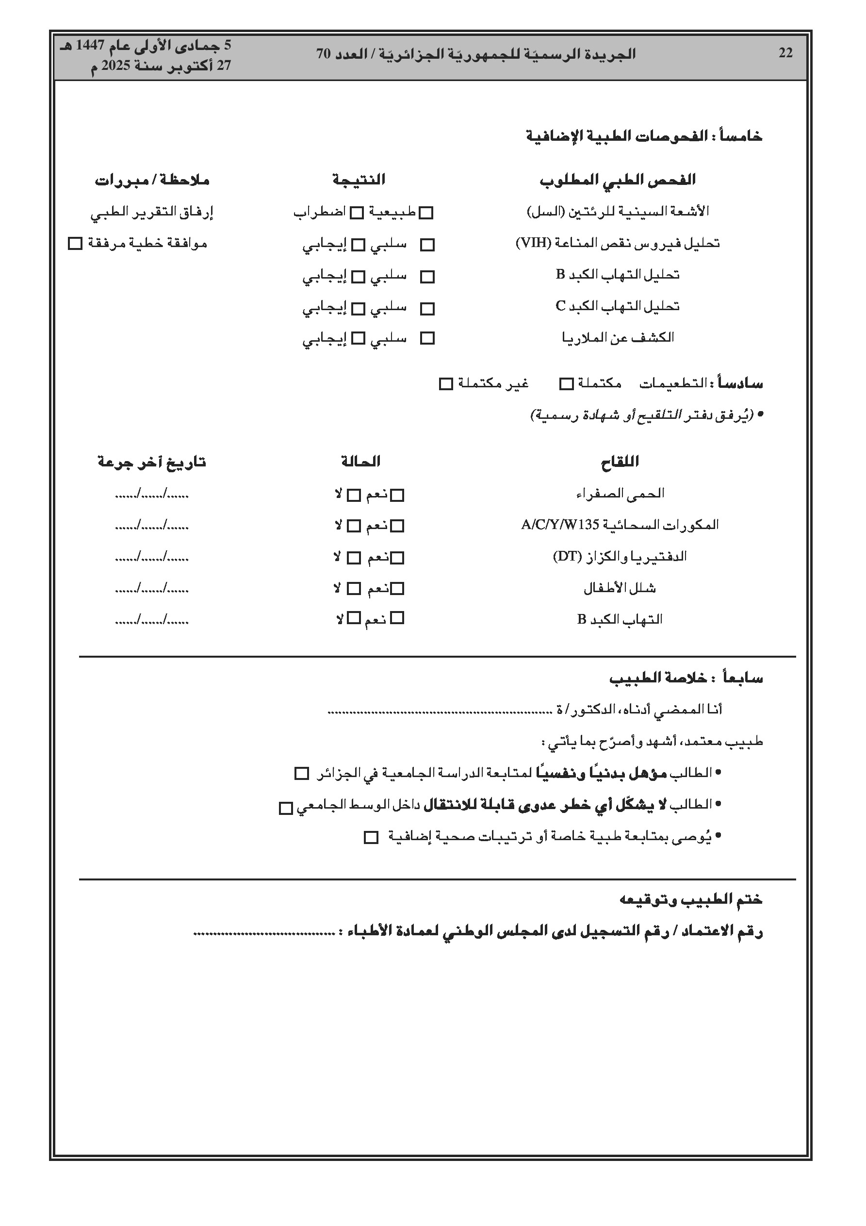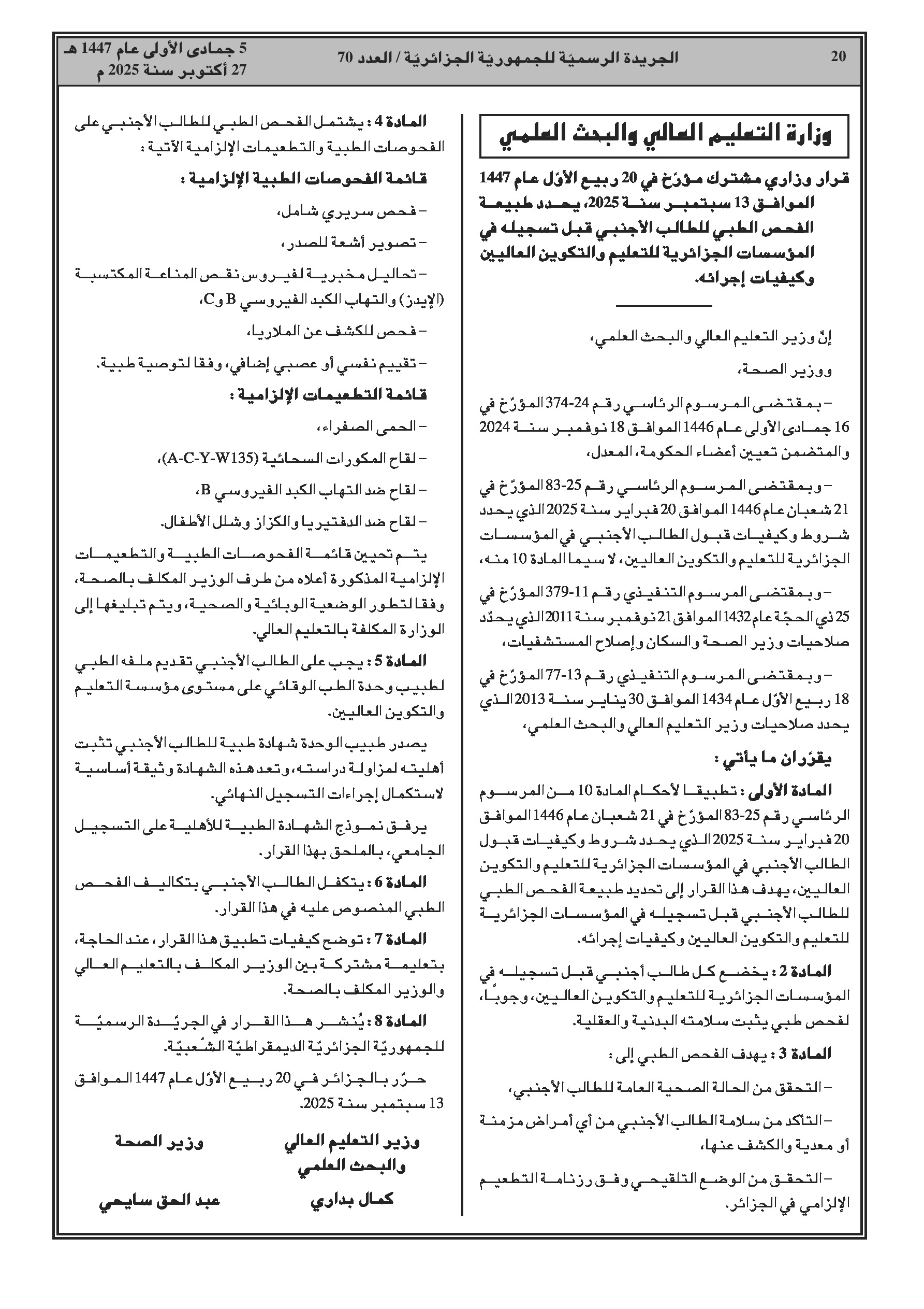 قرار وزاري مشترك جديد يحدد الفحوصات الطبية والتلقيحات الإجبارية التي يجب على الطلبة الأجانب الخضوع لها قبل التسجيل في مؤسسات التعليم العالي الجزائرية.