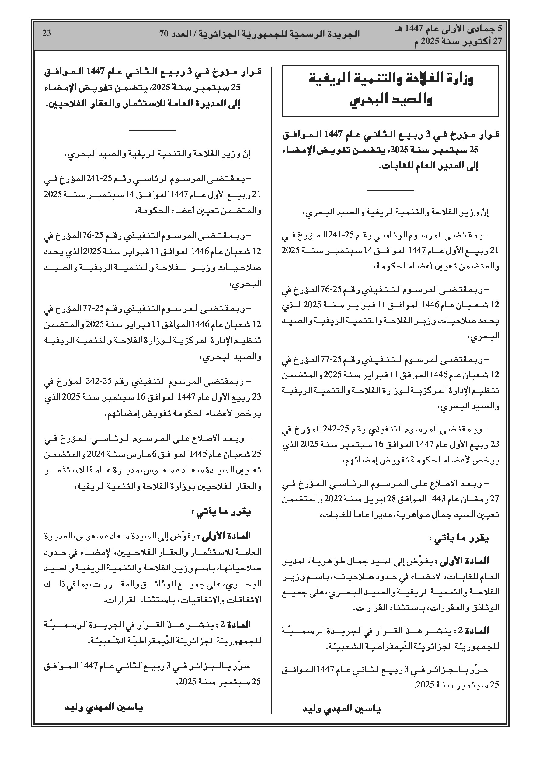 عدة قرارات تفوض سلطة التوقيع لمديرين مركزيين في وزارة الفلاحة. وقرارات أخرى تعدل أو تعين أعضاء اللجان القطاعية للصفقات العمومية لوزارات السكن، الشؤون الدينية والشباب.
