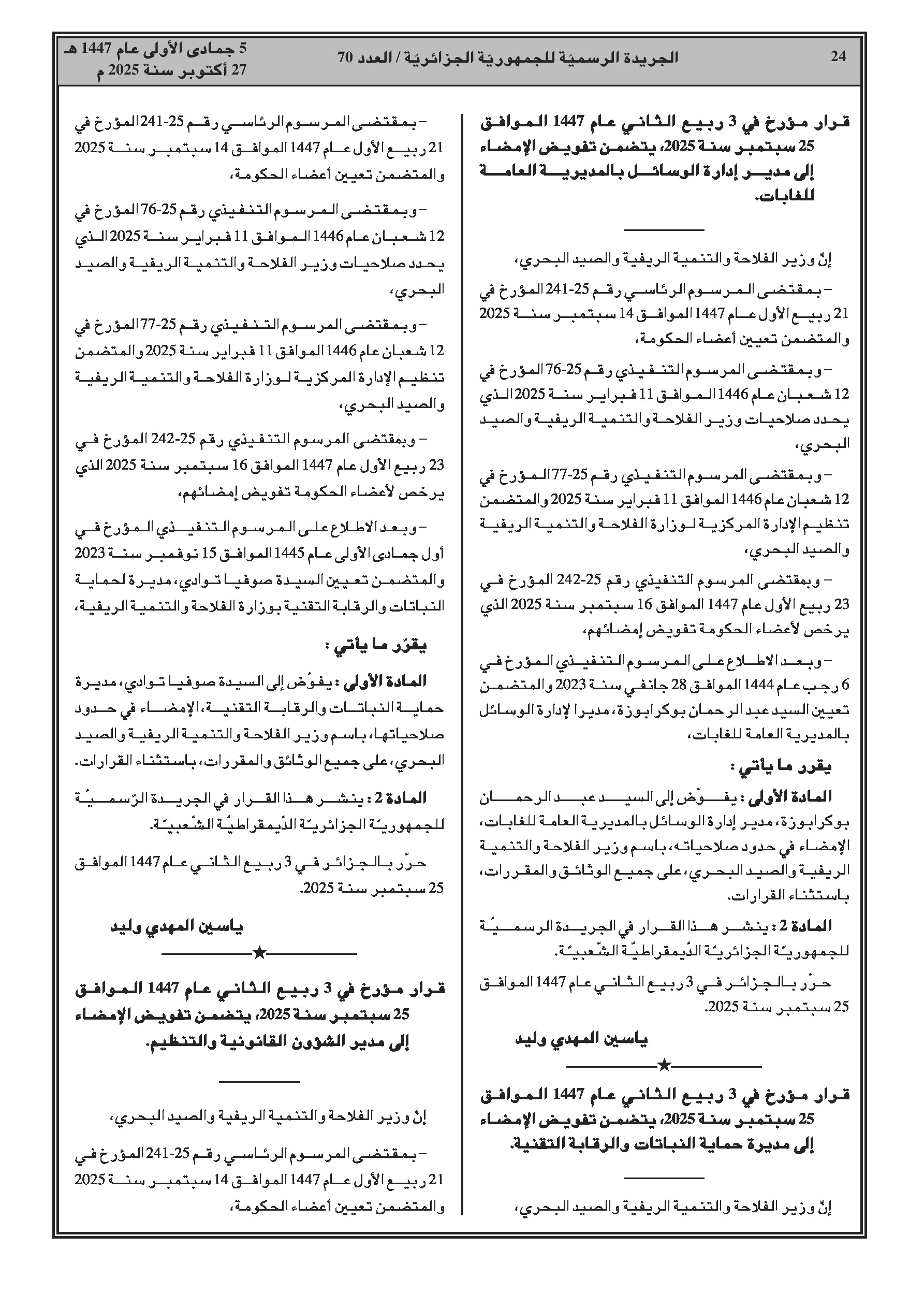 تفويض التوقيع للمديرين العامين للغابات، الاستثمار الفلاحي، وغيرهم. تعيين أعضاء جدد في لجان الصفقات العمومية لوزارة السكن، وزارة الشؤون الدينية والأوقاف، ووزارة الشباب.