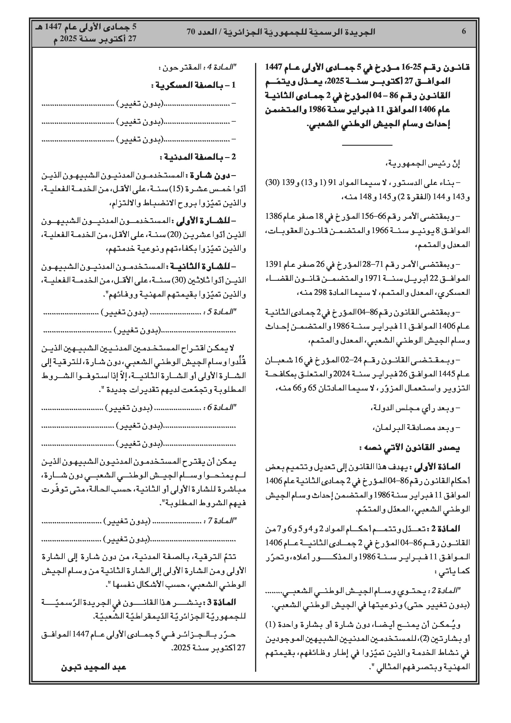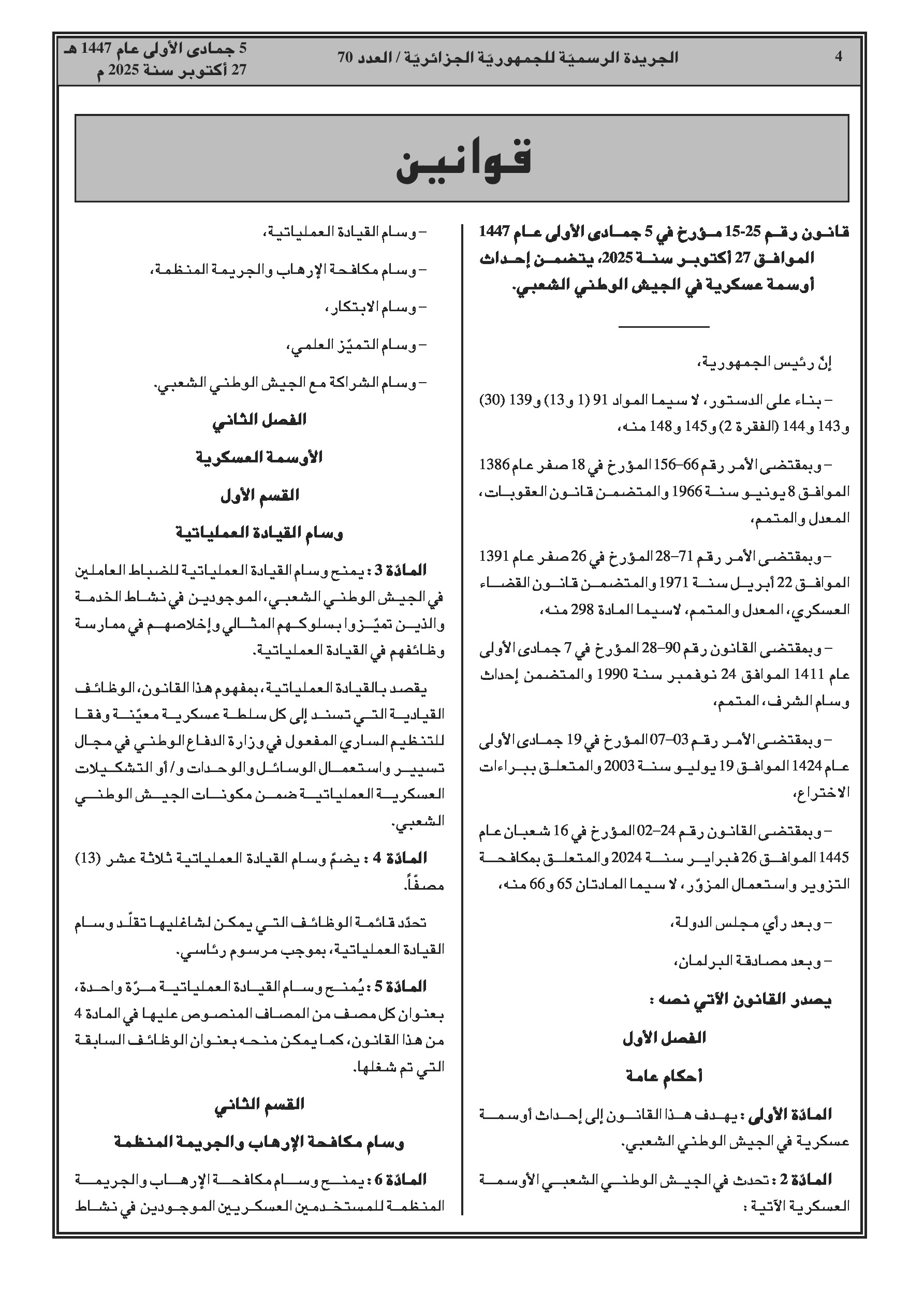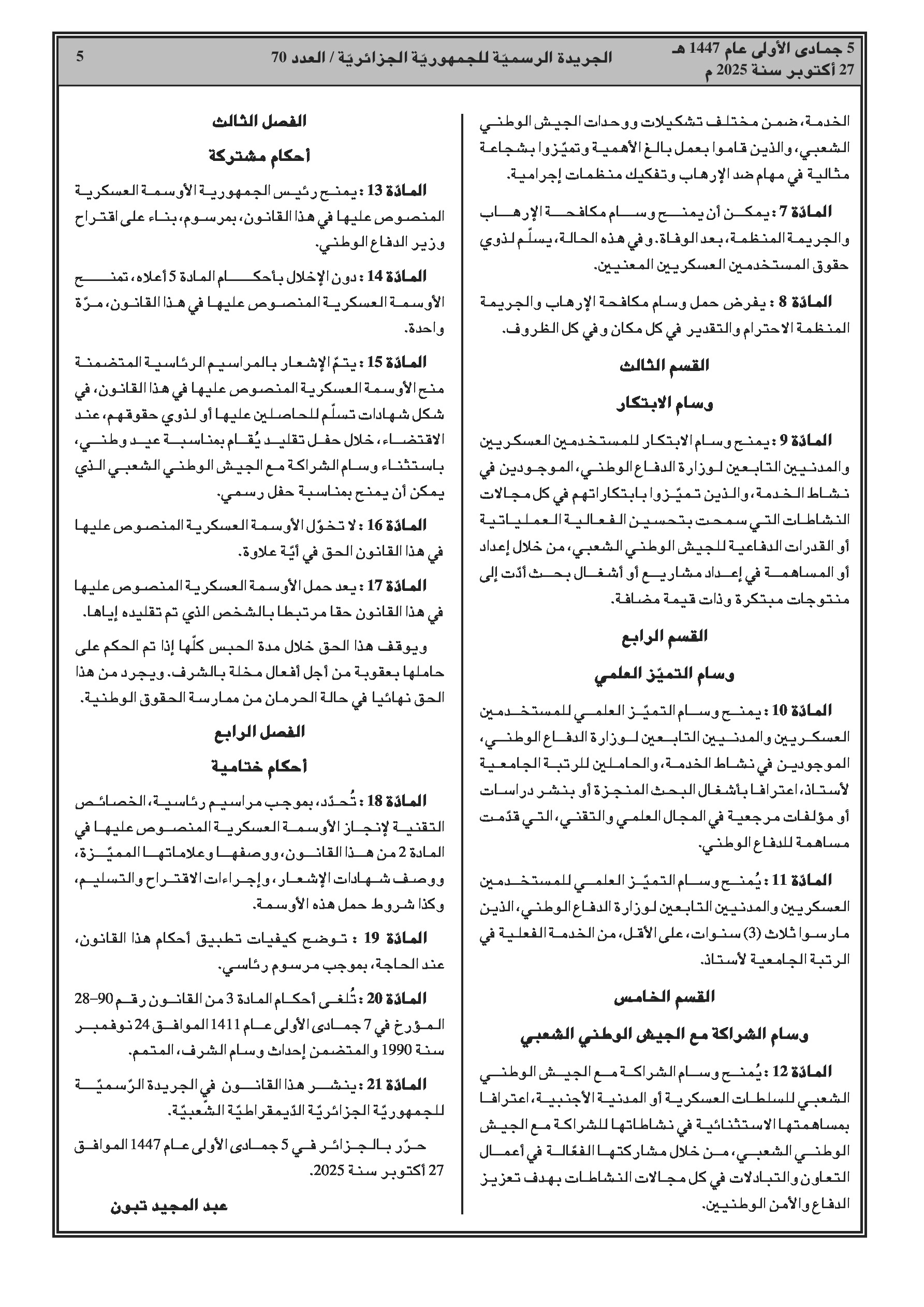 إصدار قانونين: الأول ينشئ خمسة أوسمة عسكرية جديدة لتكريم إنجازات محددة، والثاني يعدل وسام الجيش الوطني الشعبي ليشمل المستخدمين المدنيين الشبيهين.