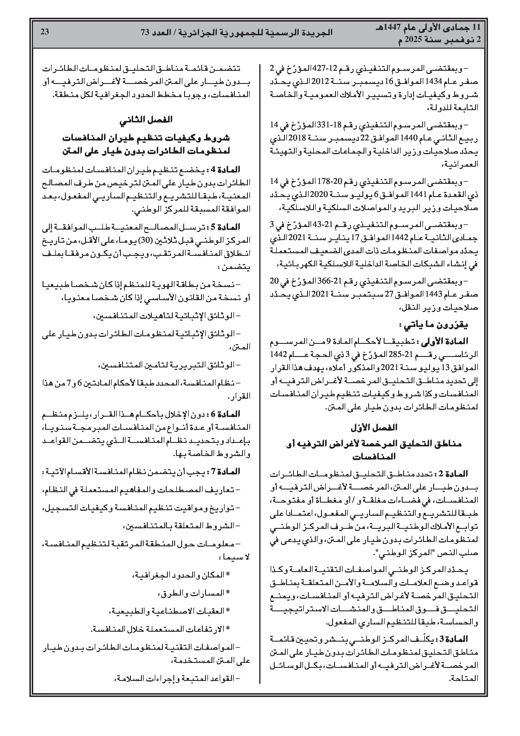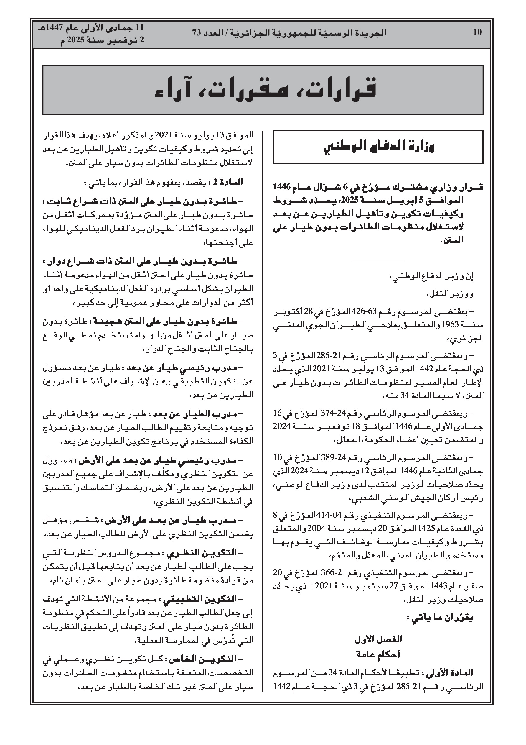 تم إصدار سلسلة من القرارات الوزارية المشتركة التي تضع إطارًا تنظيميًا كاملاً للطائرات بدون طيار، يشمل تكوين الطيارين، قواعد الاستخدام الحكومي، المبادئ التوجيهية للمسابقات، وكيفية التعامل مع الأجهزة المحجوزة.