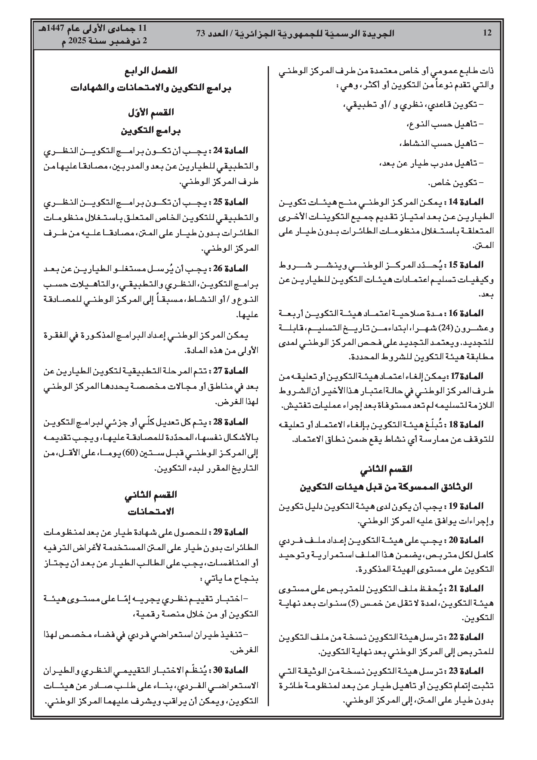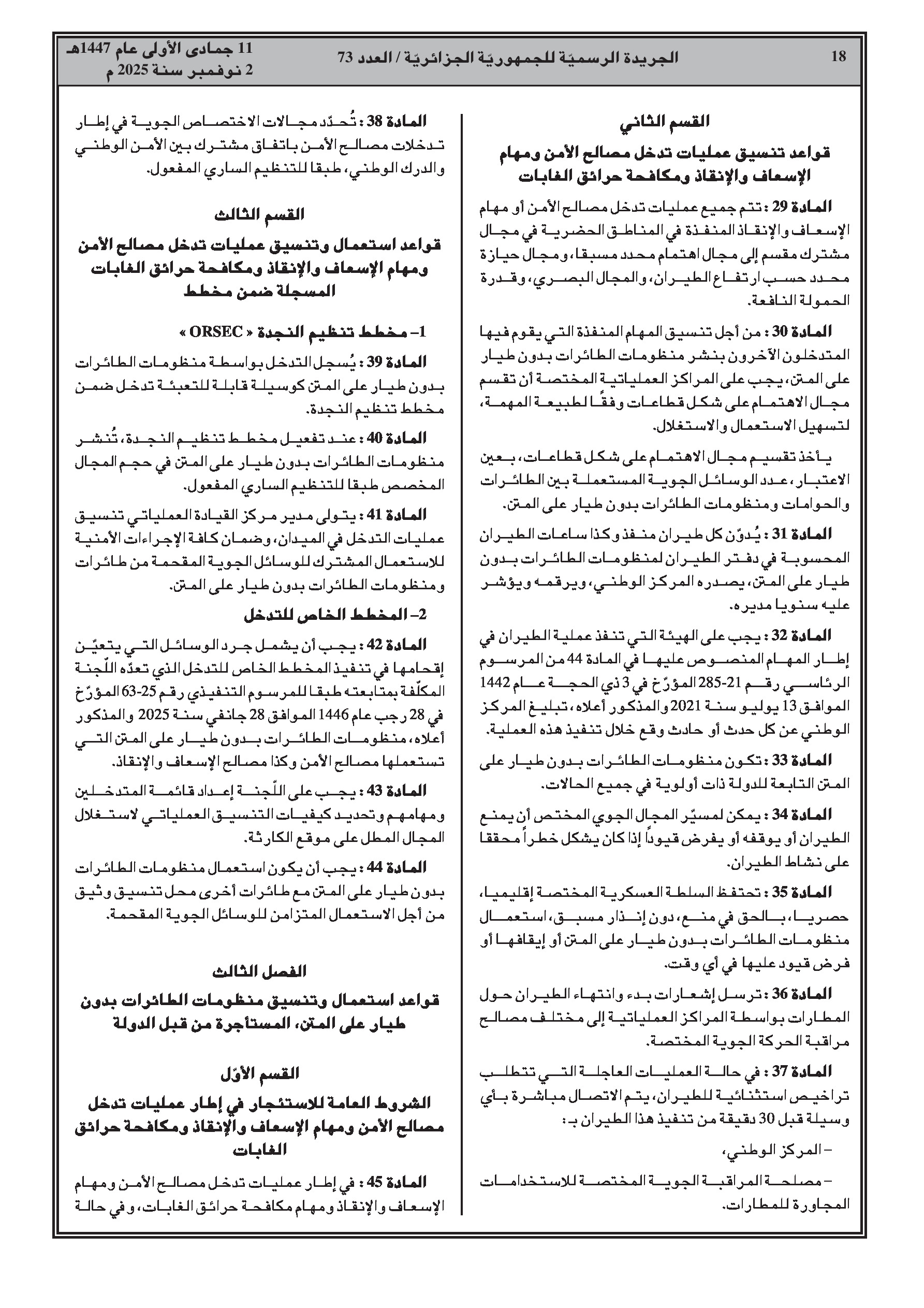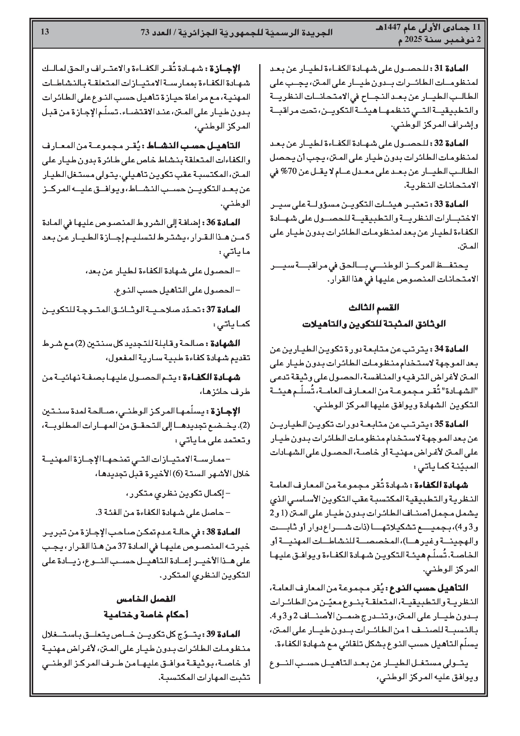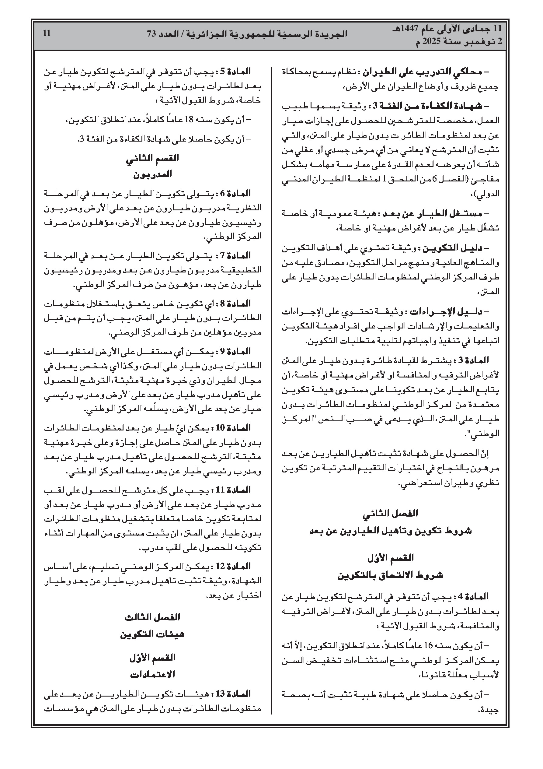 تحدد النصوص الجديدة شروط تكوين وتأهيل الطيارين عن بعد. كما تنظم قواعد استخدام وتنسيق طائرات الدرون التابعة للدولة في عمليات الأمن والإنقاذ ومكافحة الحرائق. تم تحديد مناطق التحليق المخصصة للترفيه والمنافسة، ومهام اللجنة المشتركة بين القطاعات، وإجراءات تأمين الأجهزة المحجوزة.