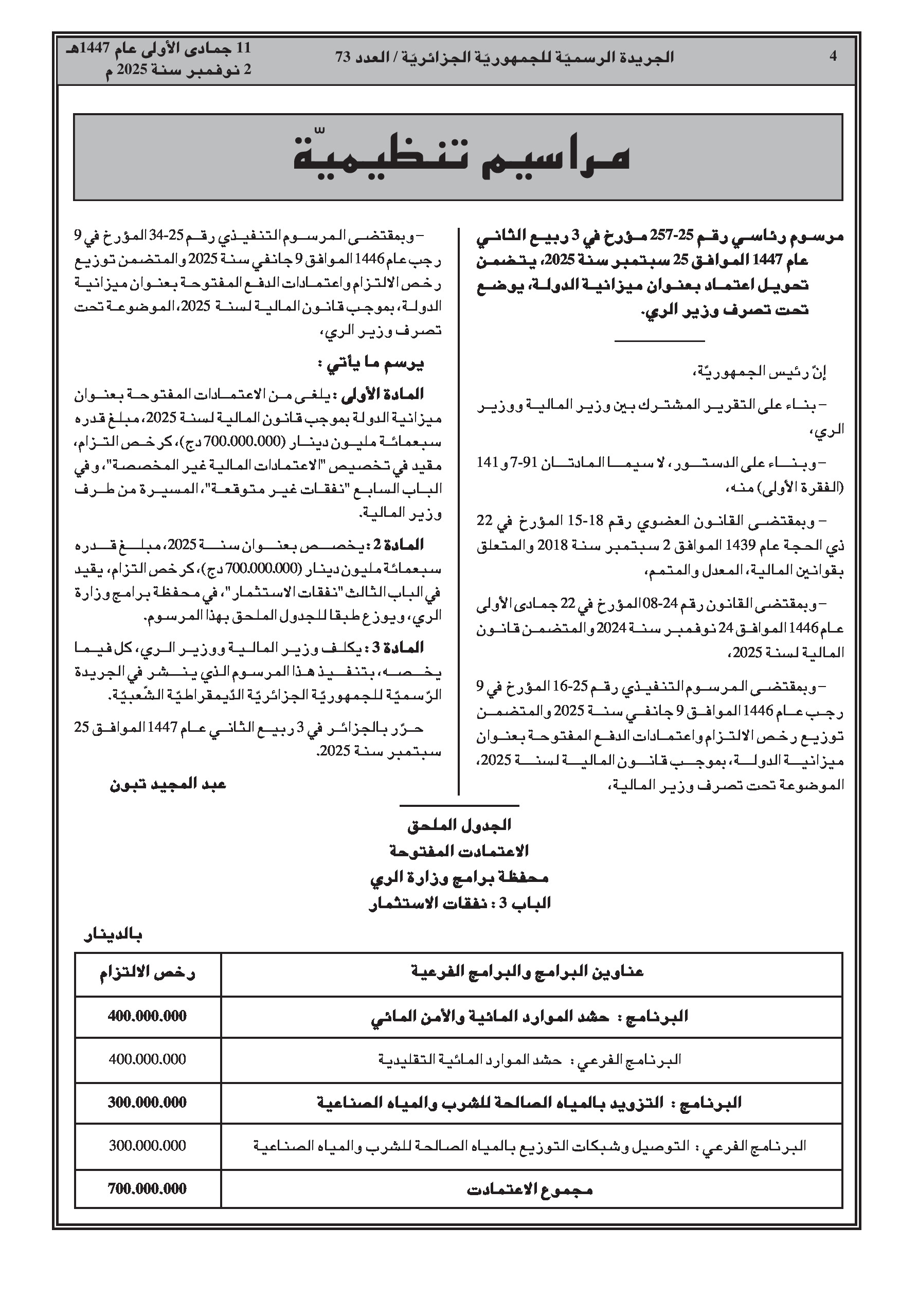 مرسوم رئاسي يأذن بتحويل مبلغ 700 مليون دينار من ميزانية الدولة للنفقات غير المتوقعة إلى وزارة الموارد المائية.