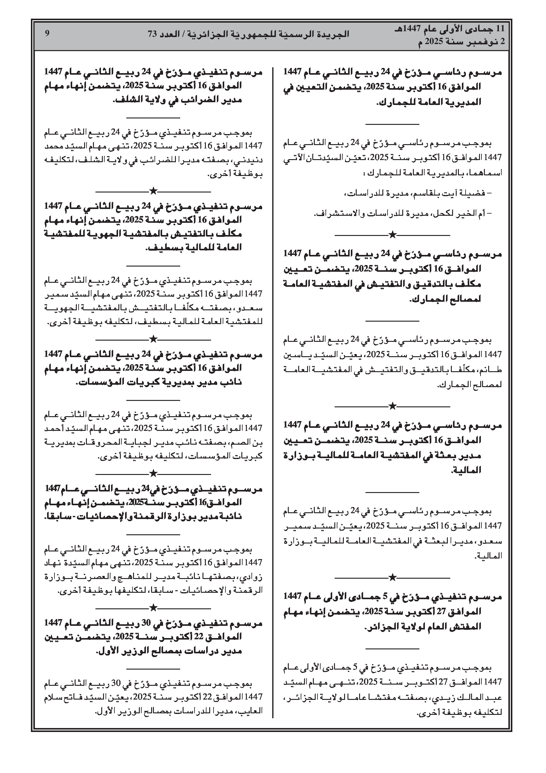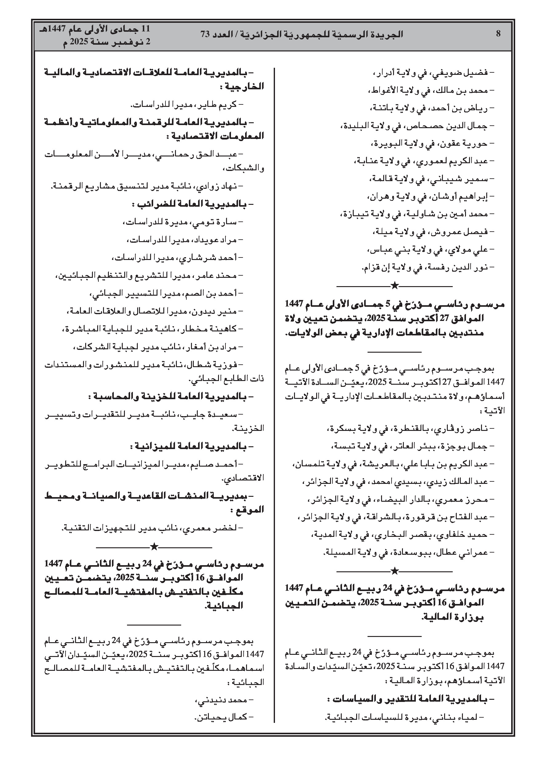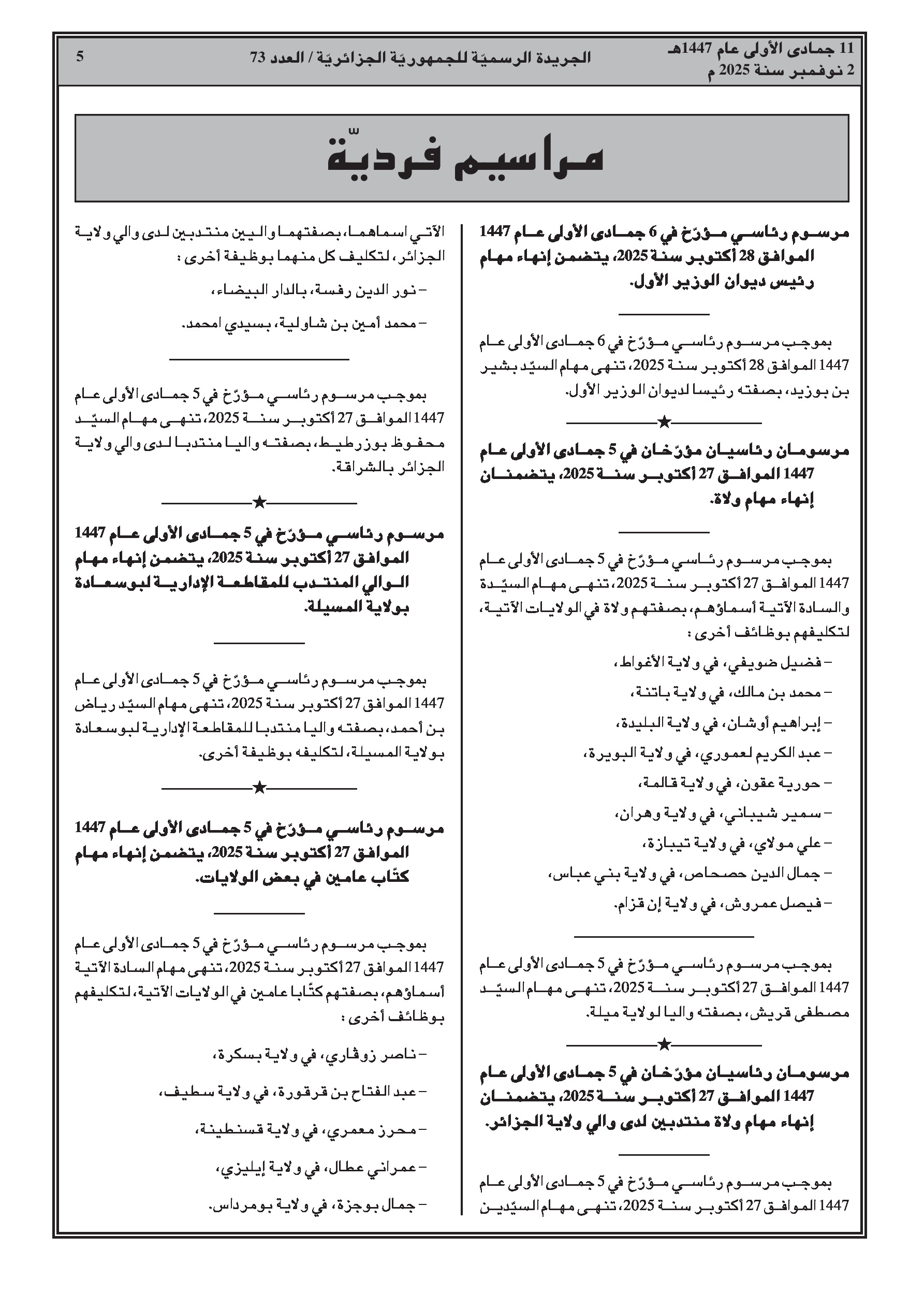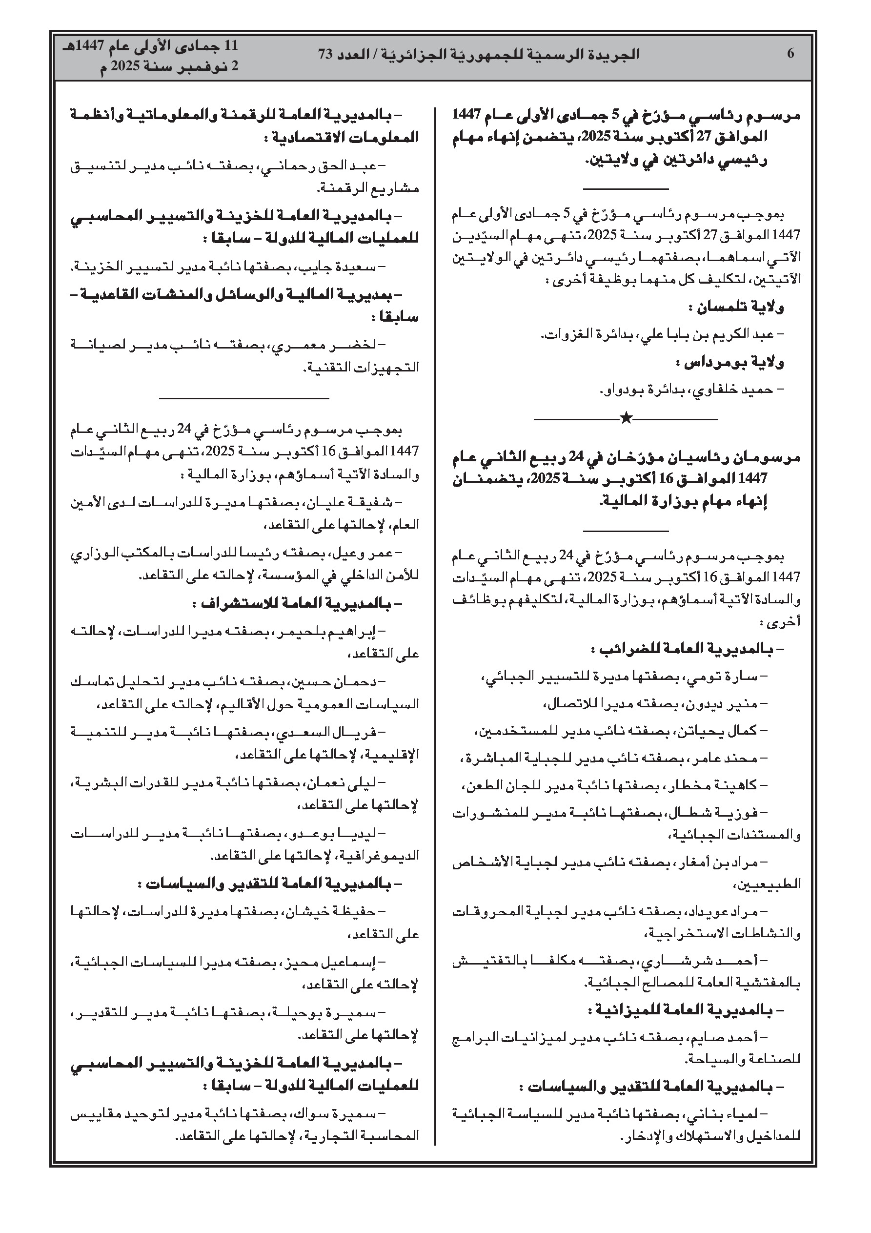 إنهاء مهام وتعيينات جديدة لمسؤولين سامين، بما في ذلك رئيس ديوان الوزير الأول، ولاة، ولاة منتدبون، أمناء عامون ورؤساء دوائر. كما شملت التغييرات مناصب في وزارة المالية، على مستوى المديريات العامة للضرائب والجمارك، والمفتشية العامة للمالية.