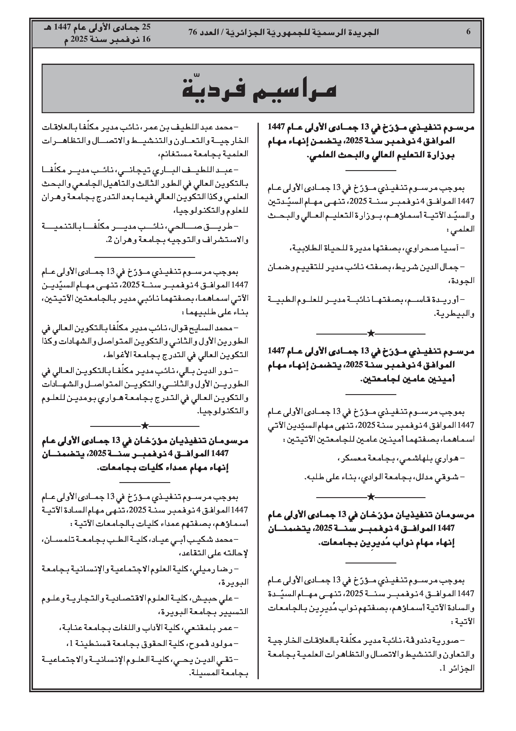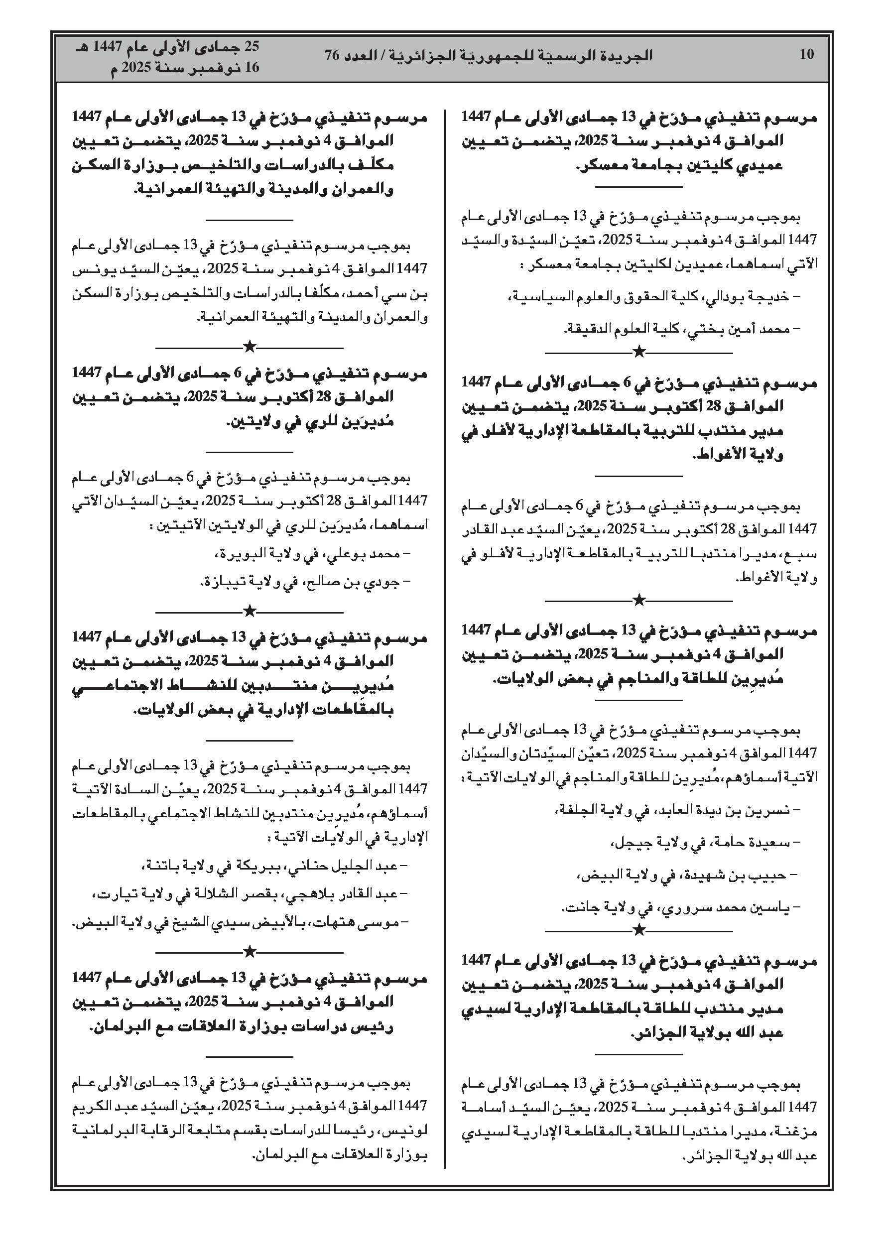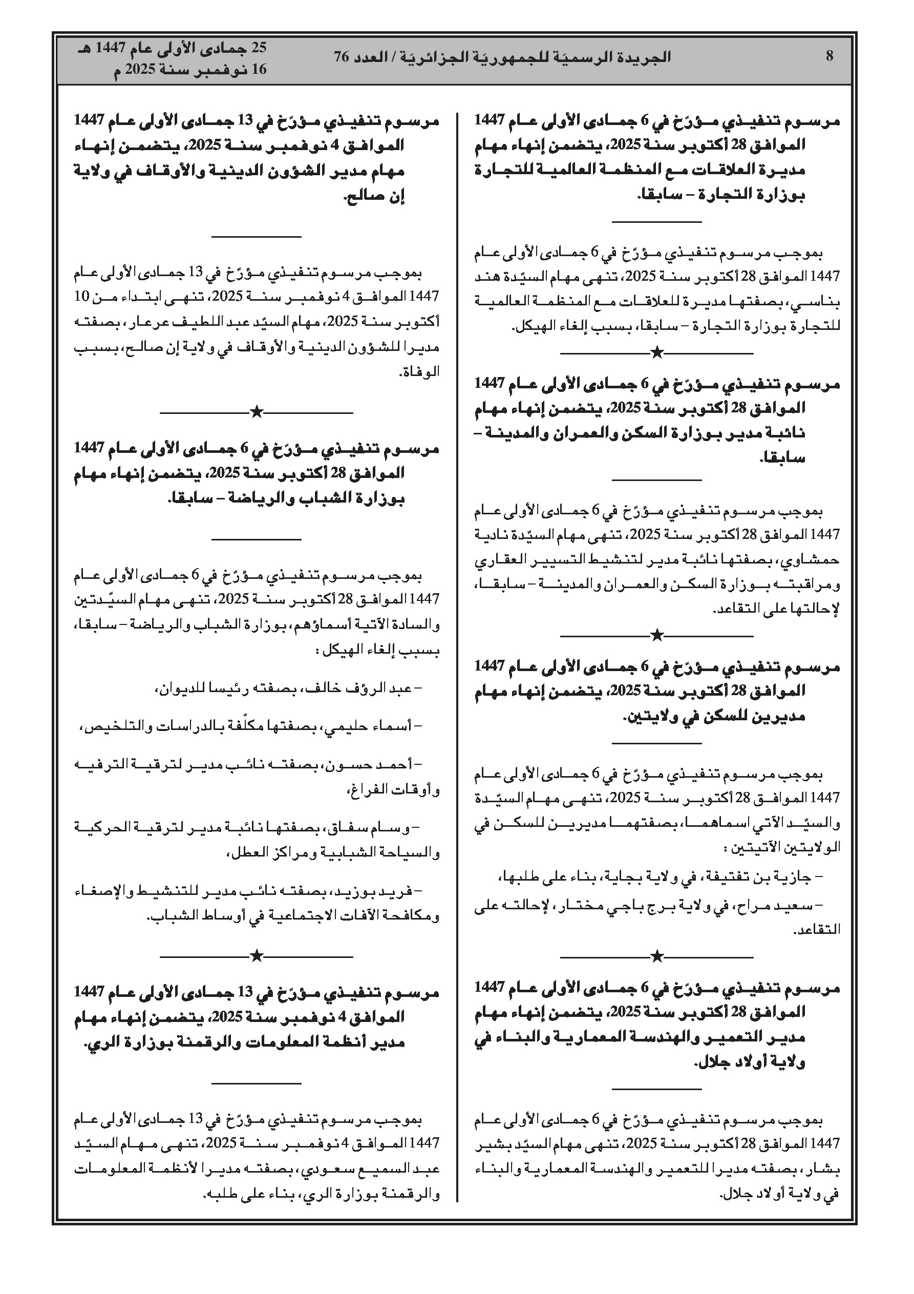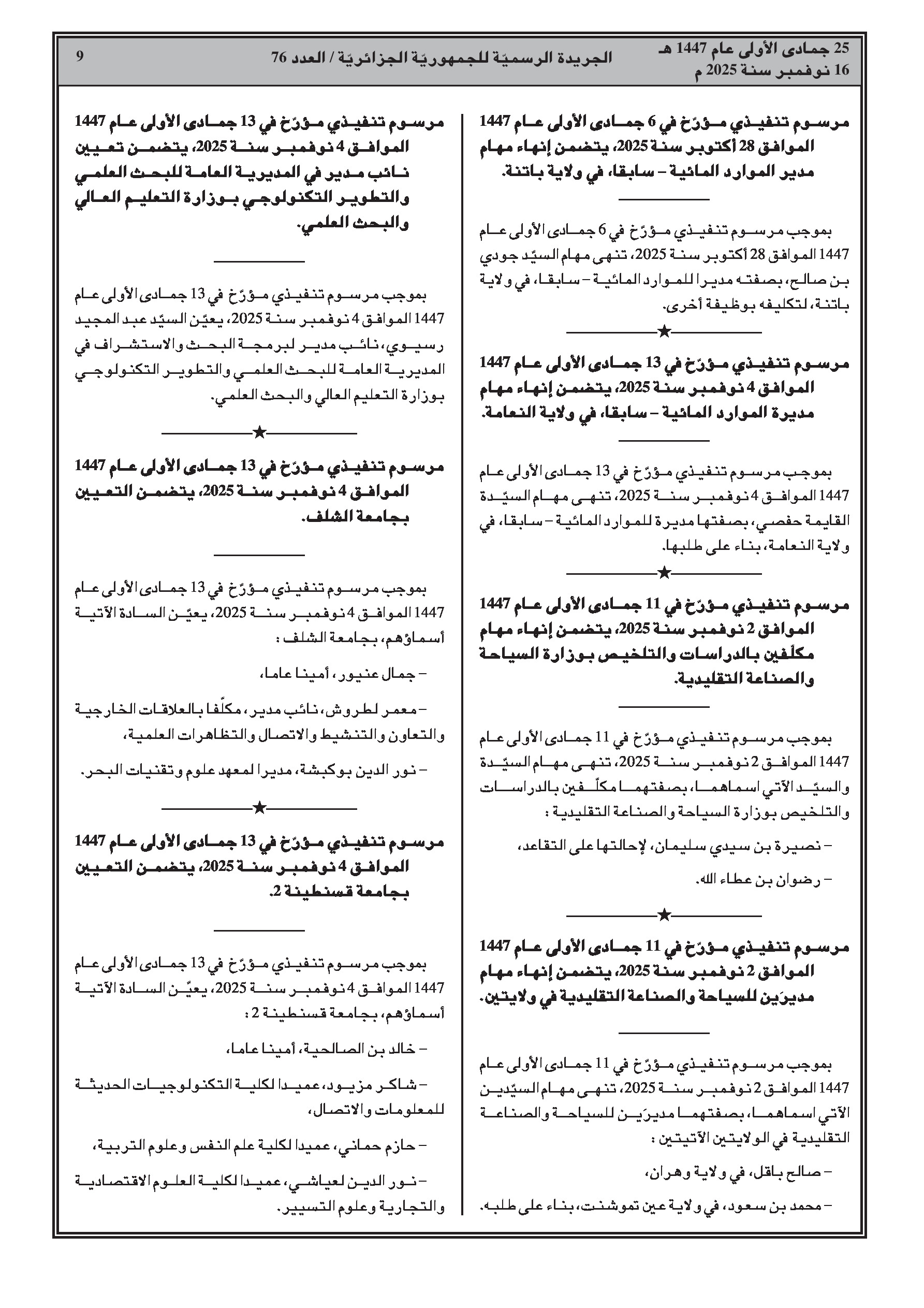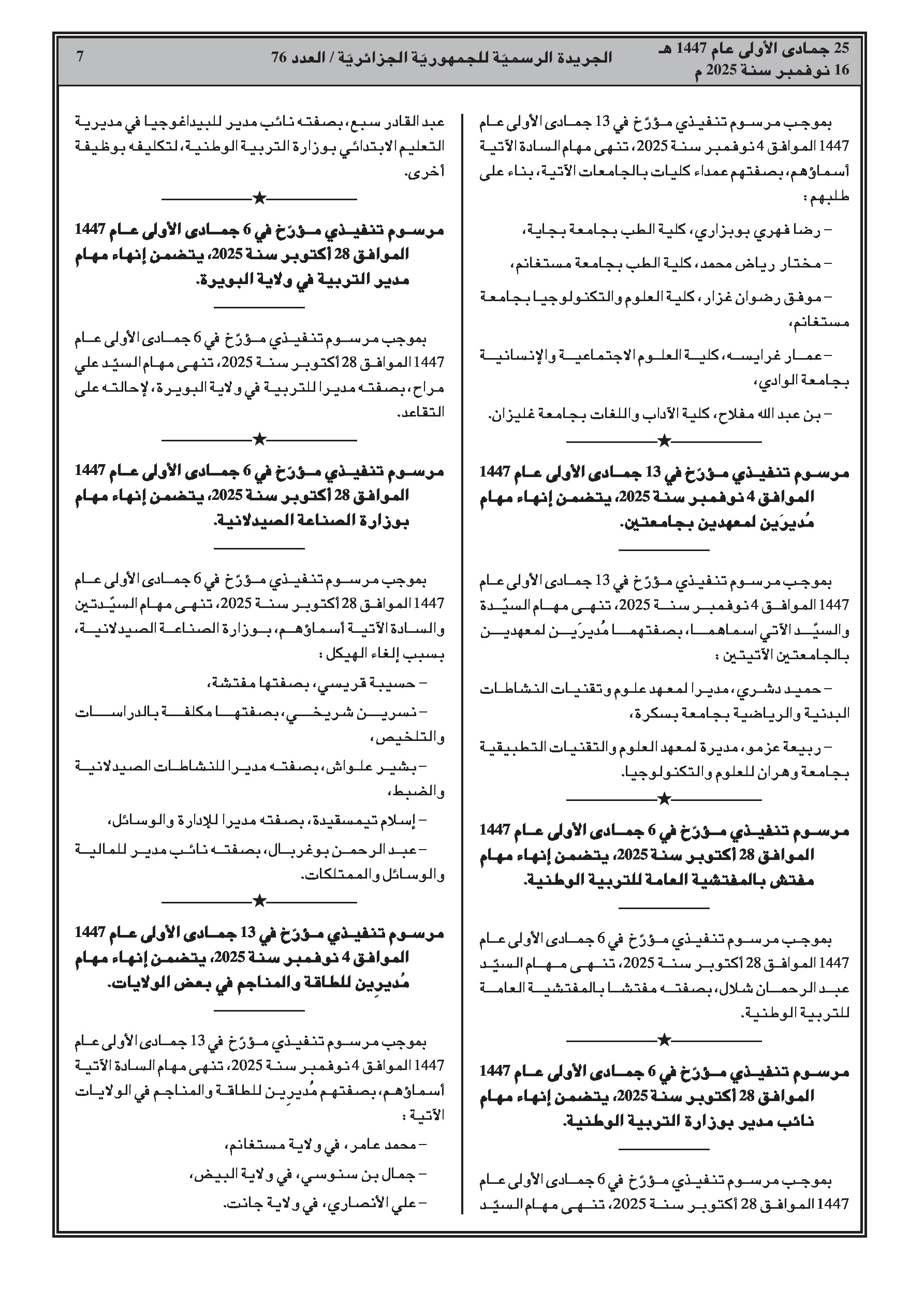 • حركة تغييرات واسعة تشمل إنهاء مهام وتعيينات جديدة لمسؤولين في قطاعات التعليم العالي، التربية الوطنية، الصناعة الصيدلانية، الطاقة والمناجم، السكن، الموارد المائية، السياحة، والعلاقات مع البرلمان.
