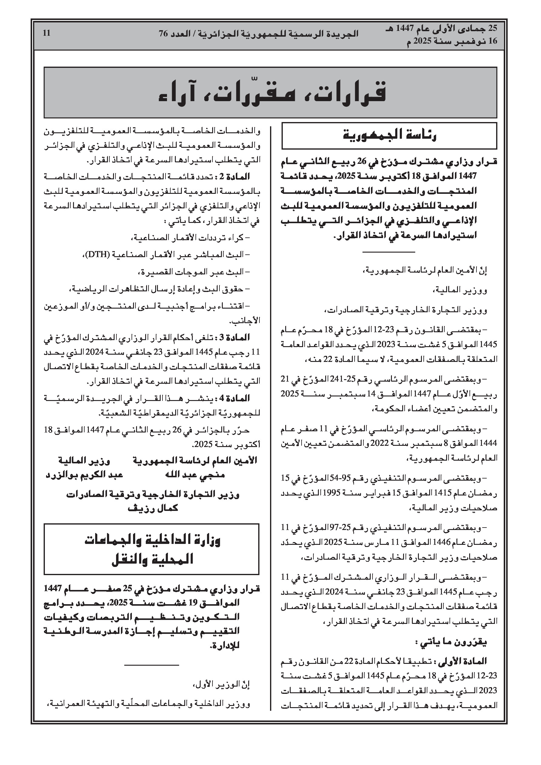 تحويلات مالية في ميزانية الدولة، تحديد مواعيد التسجيل لمنحة رمضان التضامنية لعام 2026، وإصدار قوانين جديدة تخص السكن الترقوي العمومي واستيراد الخدمات الإعلامية.