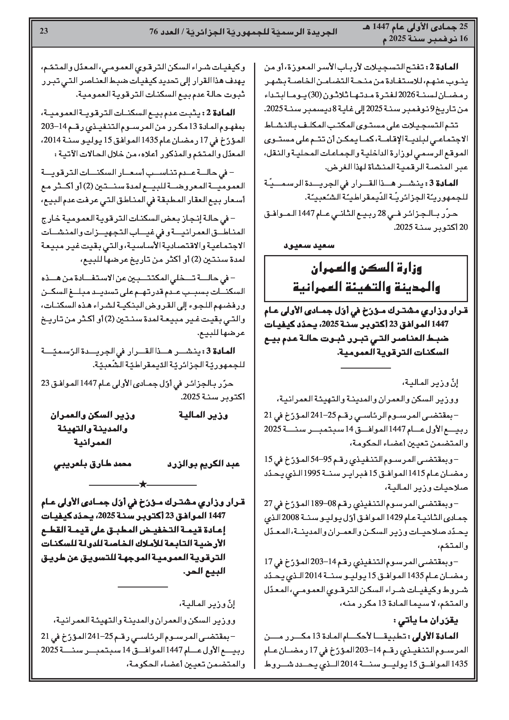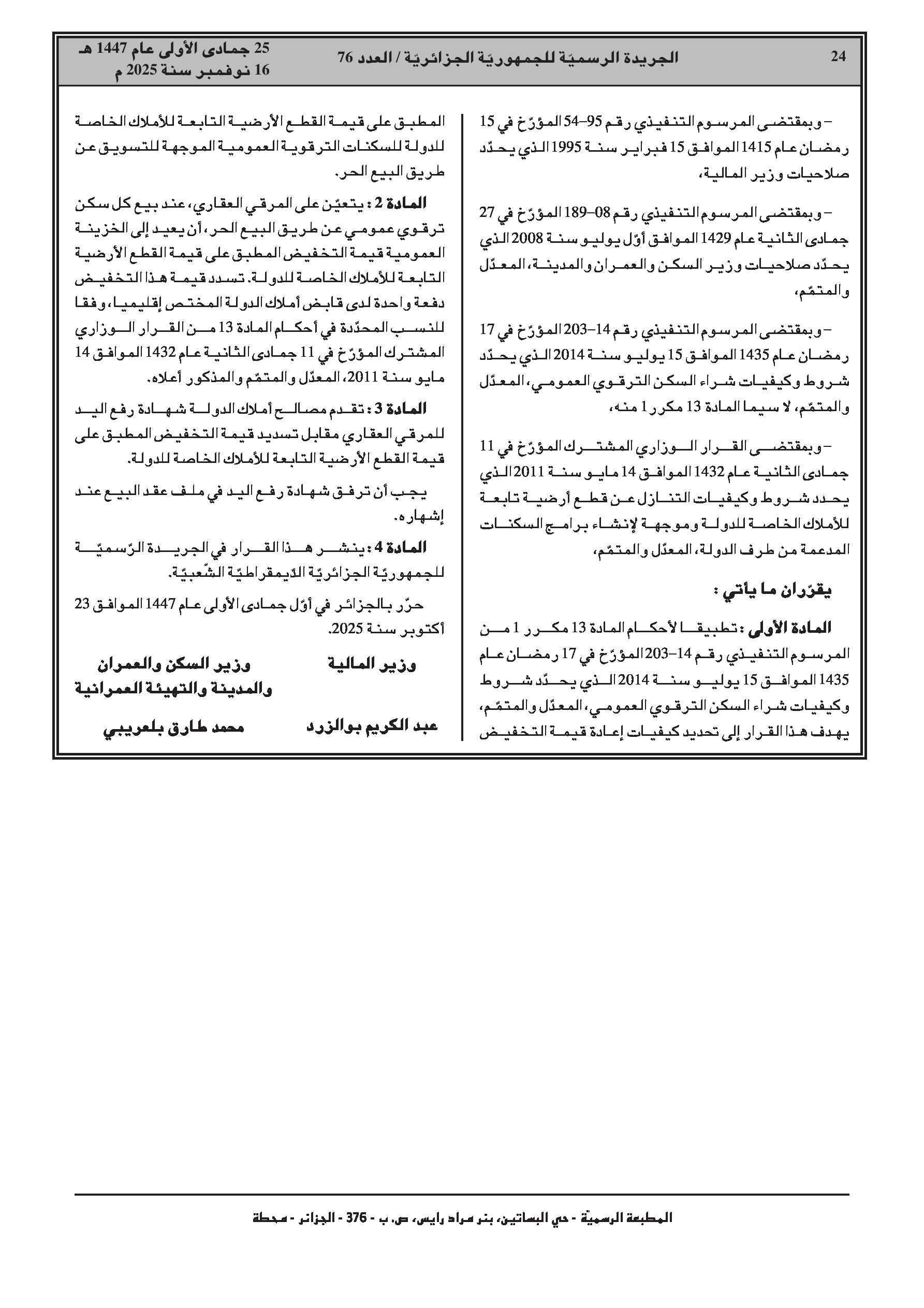 • تحديد حالات عدم بيع السكنات الترقوية العمومية وكيفيات استرجاع قيمة تخفيض سعر الأراضي.