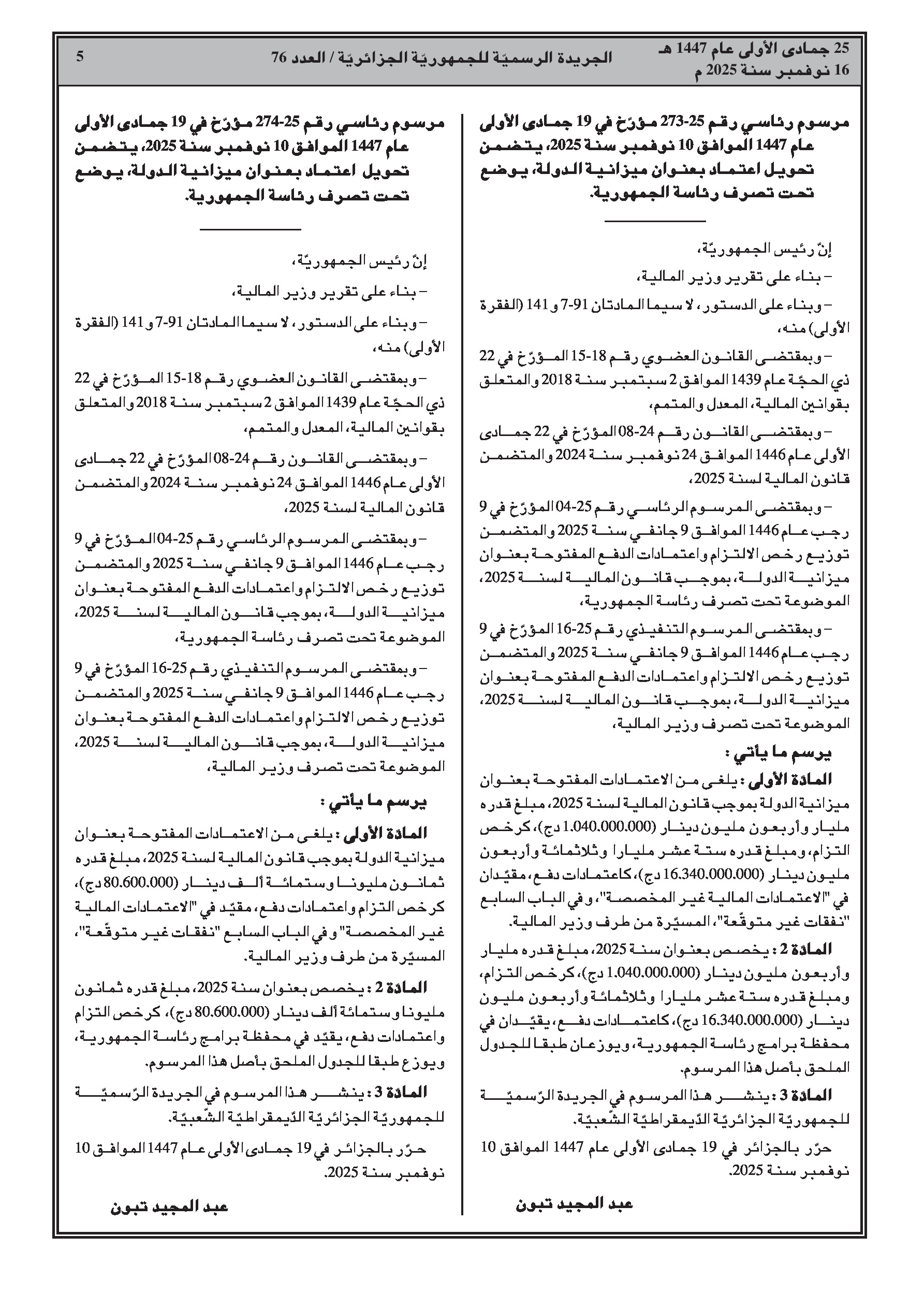 • مراسيم رئاسية بتحويل اعتمادات مالية من بند النفقات غير المتوقعة إلى ميزانيات وزارتي الاتصال والنقل ورئاسة الجمهورية.